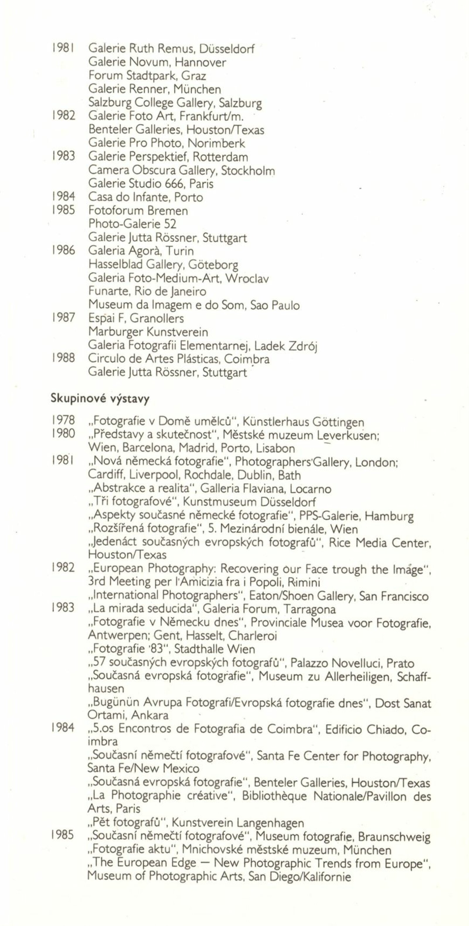 pozvánka, katalog, text katalogu (Contemporary Photographers, 1988), fotografie instalace výstavy, korespondence, životopis umělce (strojopis), žádost a potvrzení o konání výstavy, recenze v tisku