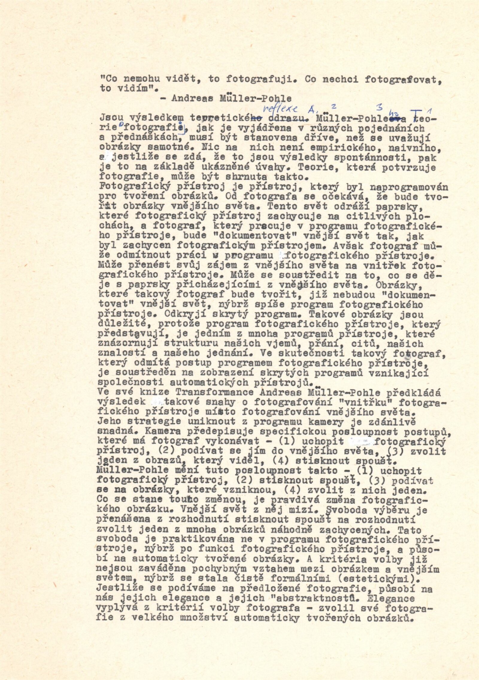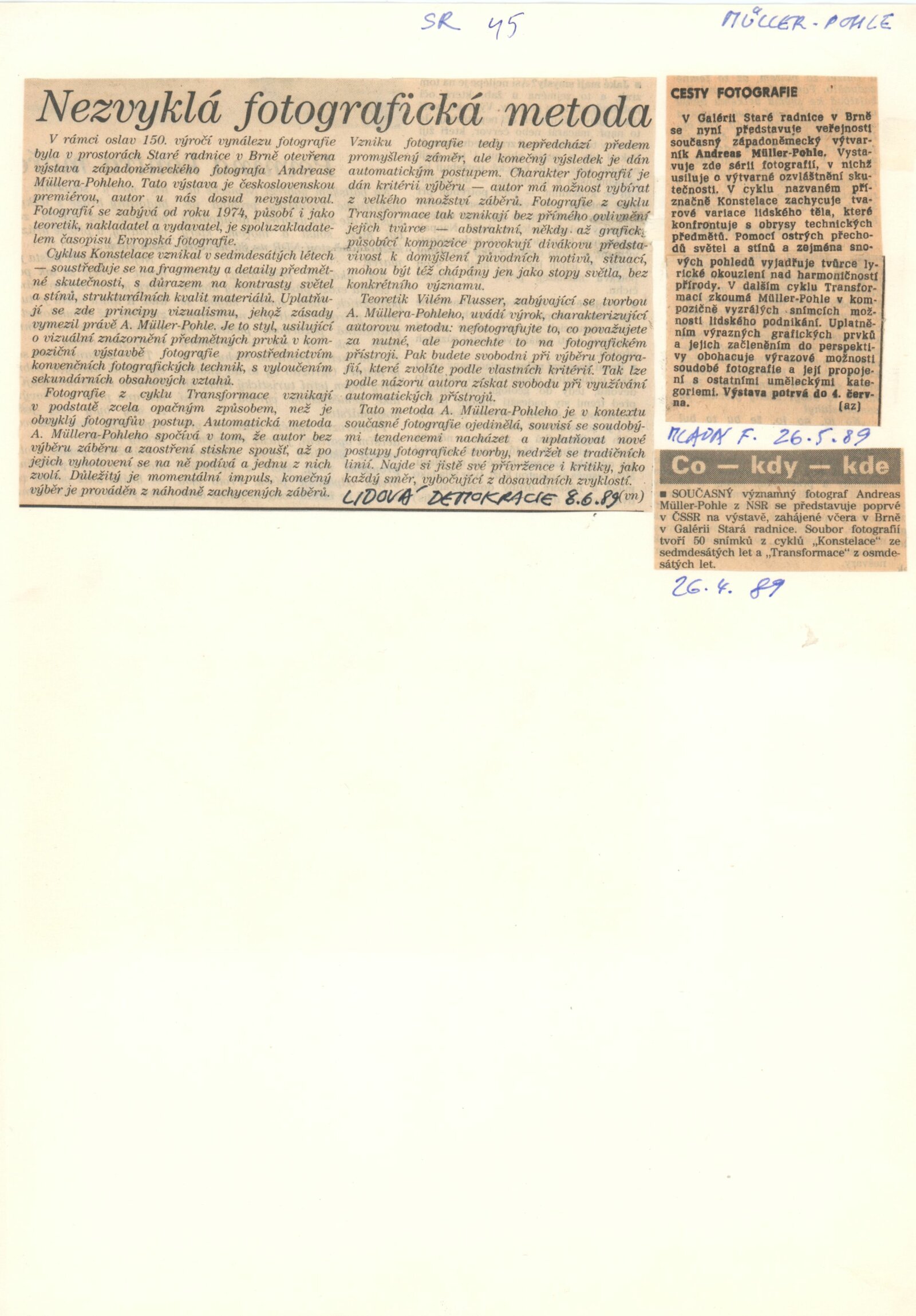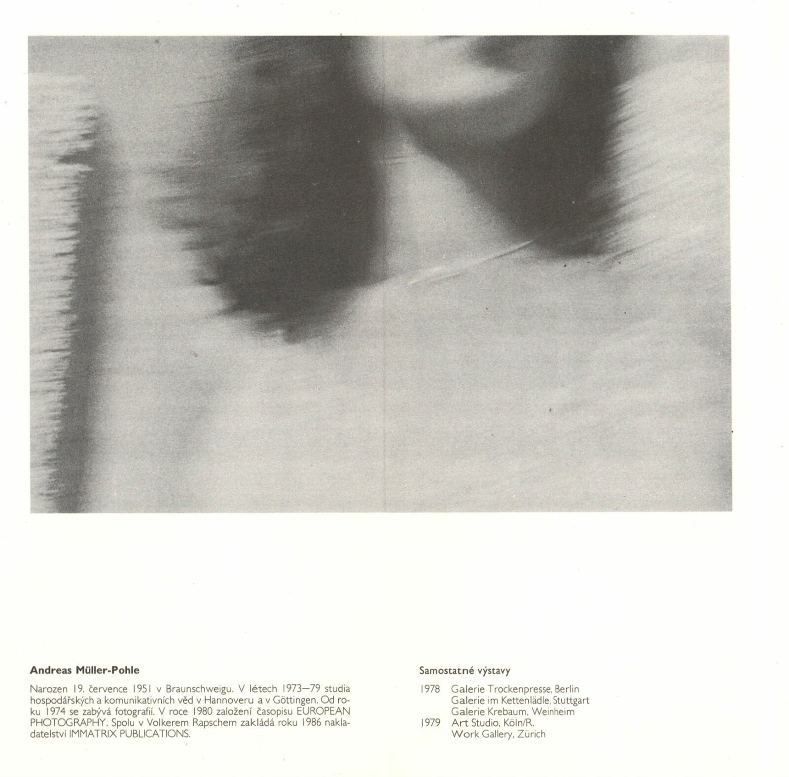 Andreas Müller-Pohle. [NSR] Fotografie: Galerie Stará radnice, Síň Vincence Makovského, 25. 4. – 4. 6. 1989 / Text: Vilém Flusser. – Brno: DUmB, 1989. – skládačka (8 s.,obr.), životní data, výstavy, zastoupení ve sbírkách, GSR 45. – MZK