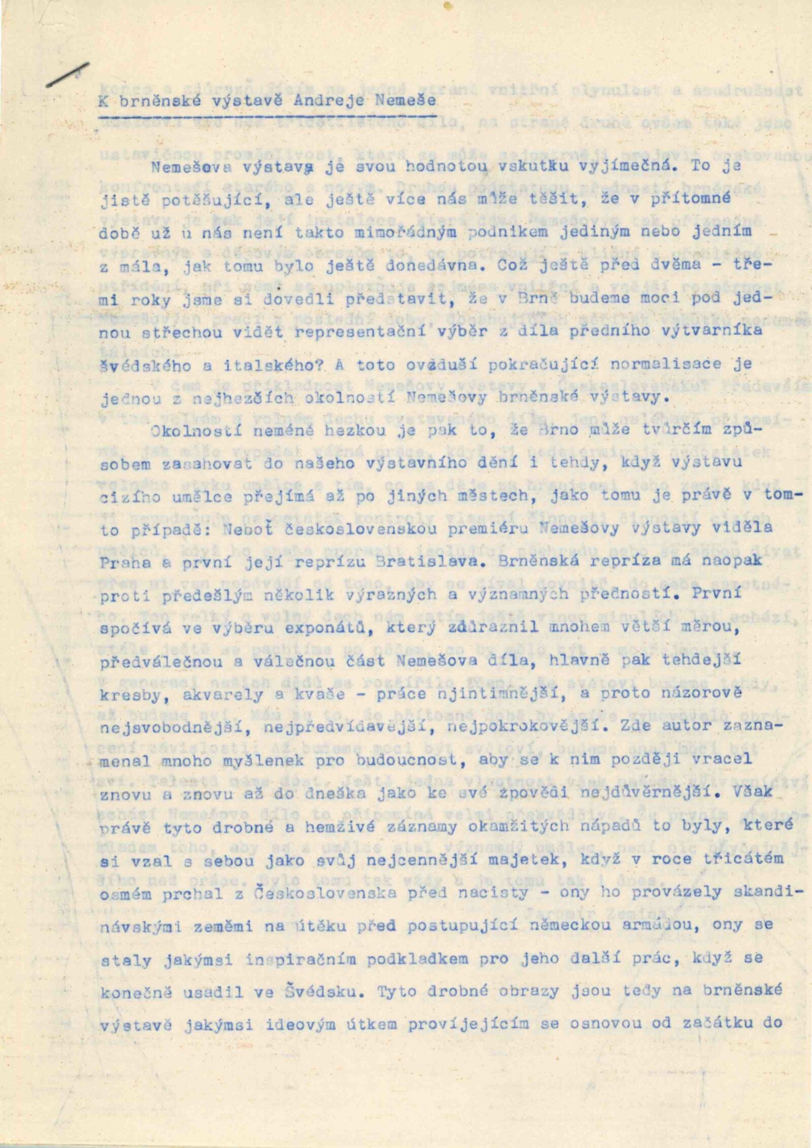 Andrej Nemeš. Obrazy a kresby: Dům umění, 1. patro, hala, 2. 7. – 31. 7. 1966 / Text: Jiří Kotalík. – Brno: SČSVU, 1966. – 15 s., 5 s. obr. příl., 4 s. bar. obr. příl., DU 462. – MZK; MG; MMB