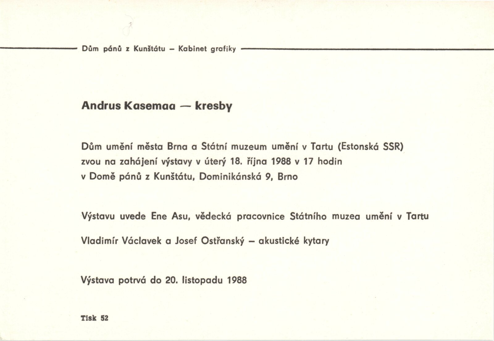 Andrus Kasemaa. Kresby: Dům umění / Dům pánů z Kunštátu, Kabinet grafiky, 18. 10. – 20. 11. 1988 / Text: Eha Komissarov. – Brno: DUmB, 1988. – [10 ] s., obr., DPK 910. – MZK; MG; MMB
