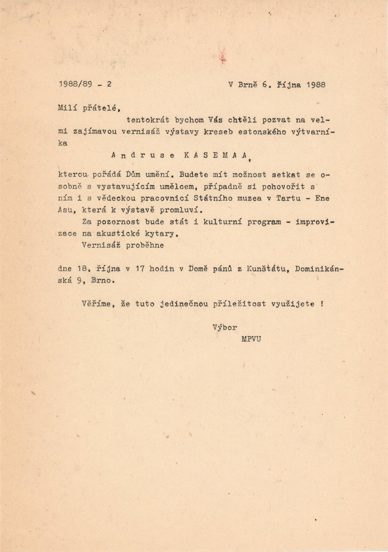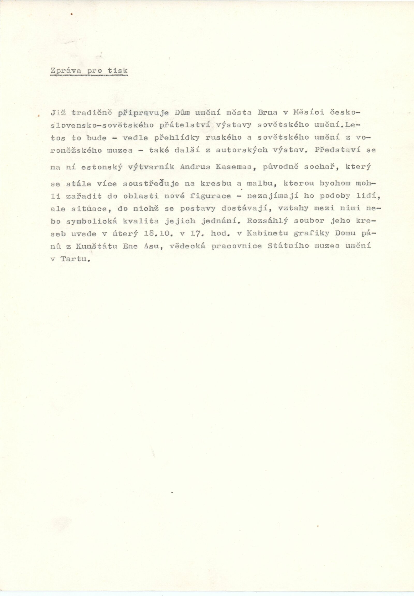 pozvánky, katalog, zpráva pro tisk (strojopis), pozvánka pro MPVU, fotografie výstavy a vernisáže, seznam vystavených kreseb (Č + R), korespondence, povrzení o převzetí kreseb, žádost o registraci výstavy, zpráva o předání materiálů k výstavě (katalogy atd.), smlouva Domu umění s Tartuským státním uměleckým muzeem o spolupráci a výměně výstav, dohoda o výměně výstav, doplněk k dohodě o výměně výstav, žádost o registraci dovozu výstavy do ČSSR (3 ks), prohlášení o pozvání umělce a jeho rodiny do ČSSR, návrh programu pro umělce, žádost a potvrzení o uspořádání výstavy, potvrzení o vývozu děl, seznam adres (Andrus Kasemaa, Saskia Kasemaa, Mattias Kasemaa), plakát k výstavě (Kunstnik M. Murdvee, 1986), další plakát k výstavě (Tartu Kunstnike, 1986), poznámky v R a Č, pohled od E. A.