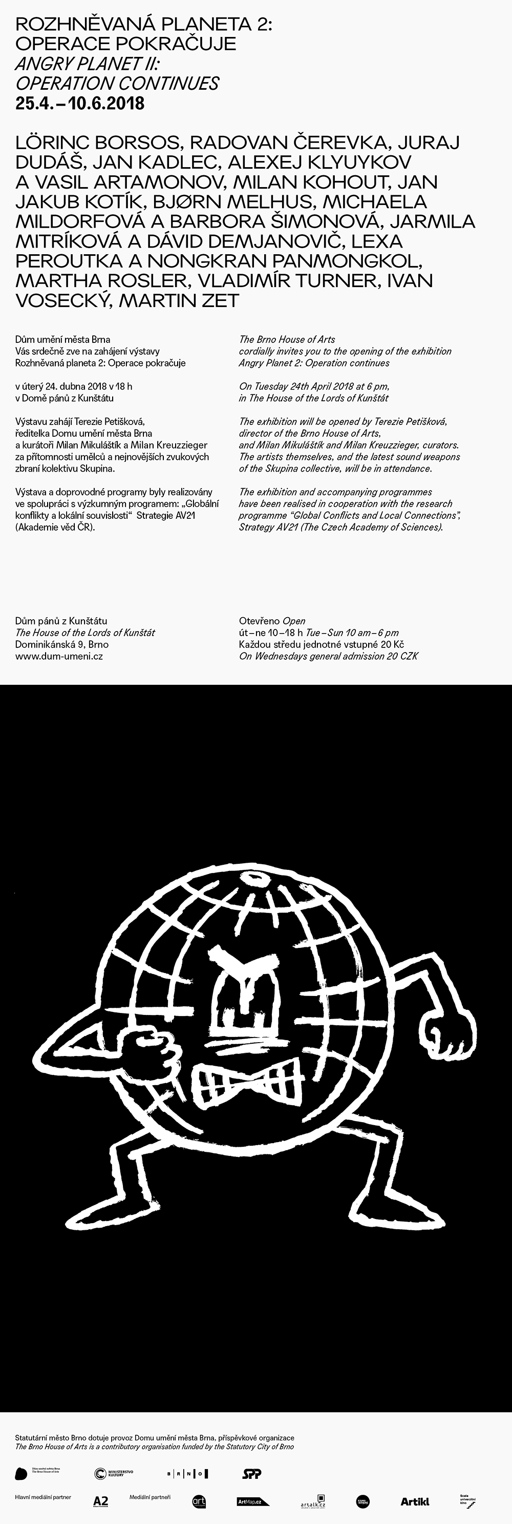 The Brno exhibition Angry Planet II: Operation Continues is a follow-up to the Angry Planet show produced in 2017 by the National Technical Library and The Academy of Sciences of the Czech Republic. In recent years, geopolitical, intercultural and social clashes and conflicts have become key issues of newspaper articles, politology seminars and conferences, as well as public discussions. The media often convey worries about the outbreak of a new global war, yet the form of conflicts in today’s globalized and medially interconnected world has changed. These conflicts seldom take place on the borders between territories and are chiefly manifested inside the individual states and geopolitical units, in the metropolises of our civilization, in connection with civilization or cultural disregard, stereotypes, streams of migrants, etc. The spectacular presentations of conflicts in the media also distinctly influence the public opinion and often conceal the essence of the conflicts. The exhibition therefore strives to point out the broader context of the conflicts and its expression through contemporary art, while on the other hand it does not shun critical approaches and discussions about the different manifestations and forms of violence (including, for example, structural violence). The core of the exhibition are both newly created and existing artworks supplemented with selected artefacts associated with the issue of conflict.