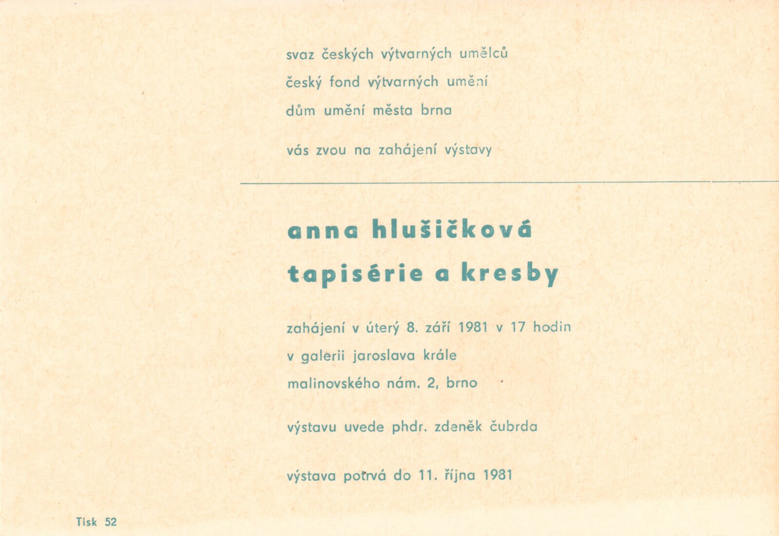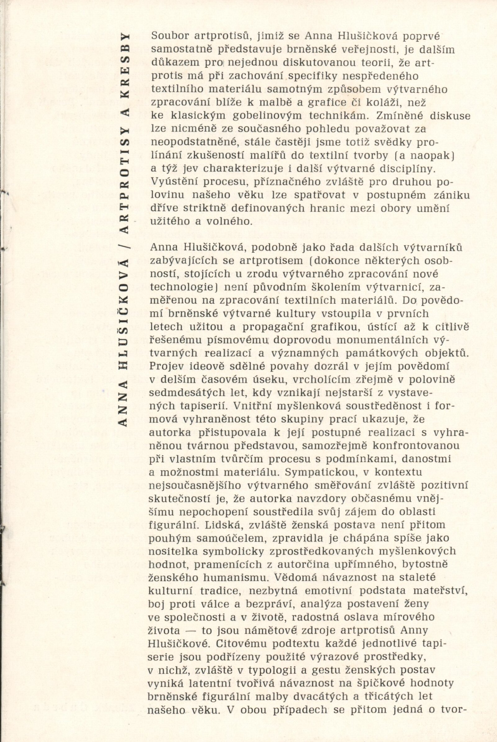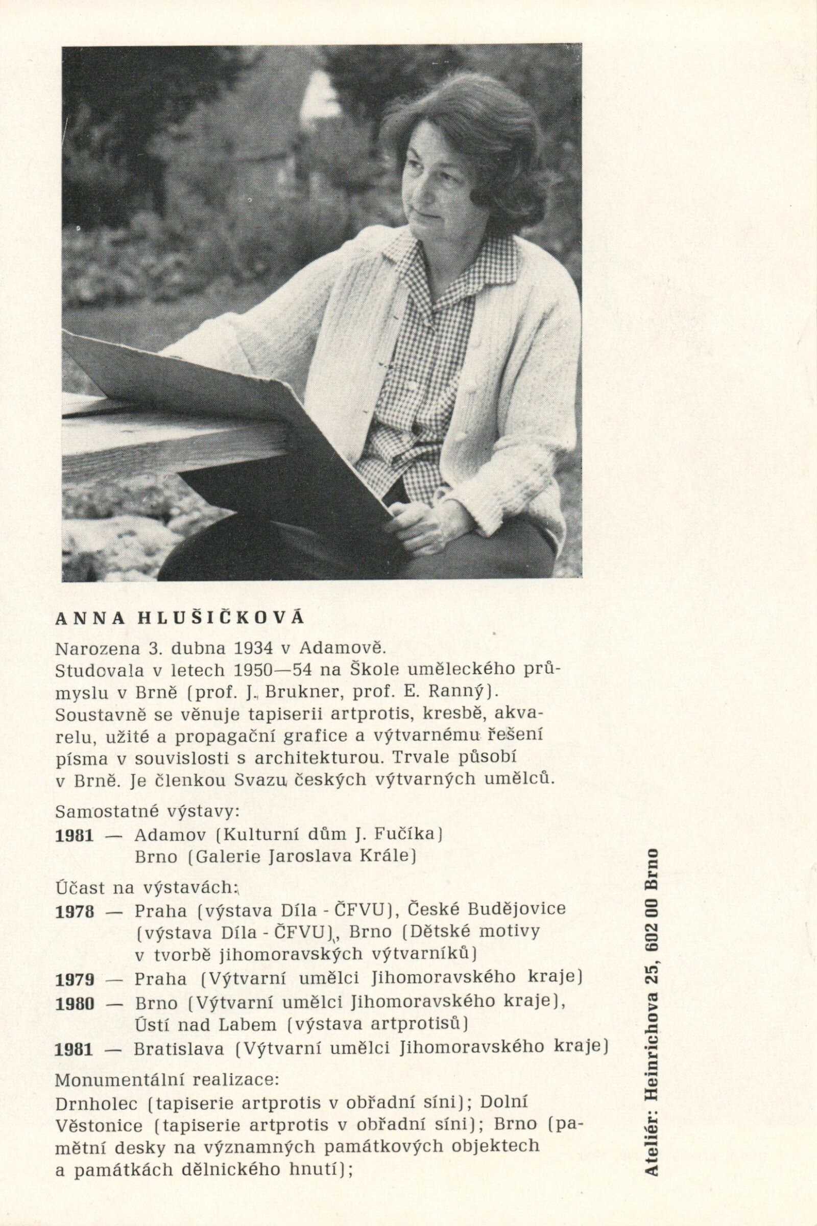 Anna Hlušičková. Artprotisy a kresby: Dům umění, 104. výstava v Galerii Jaroslava Krále, 8. 9. – 11. 10. 1981 / Text: Zdeněk Čubrda. – Brno: ČFVU, 1981. – 12 s., obr., životní data, výstavy, monumentální realizace, DU 734