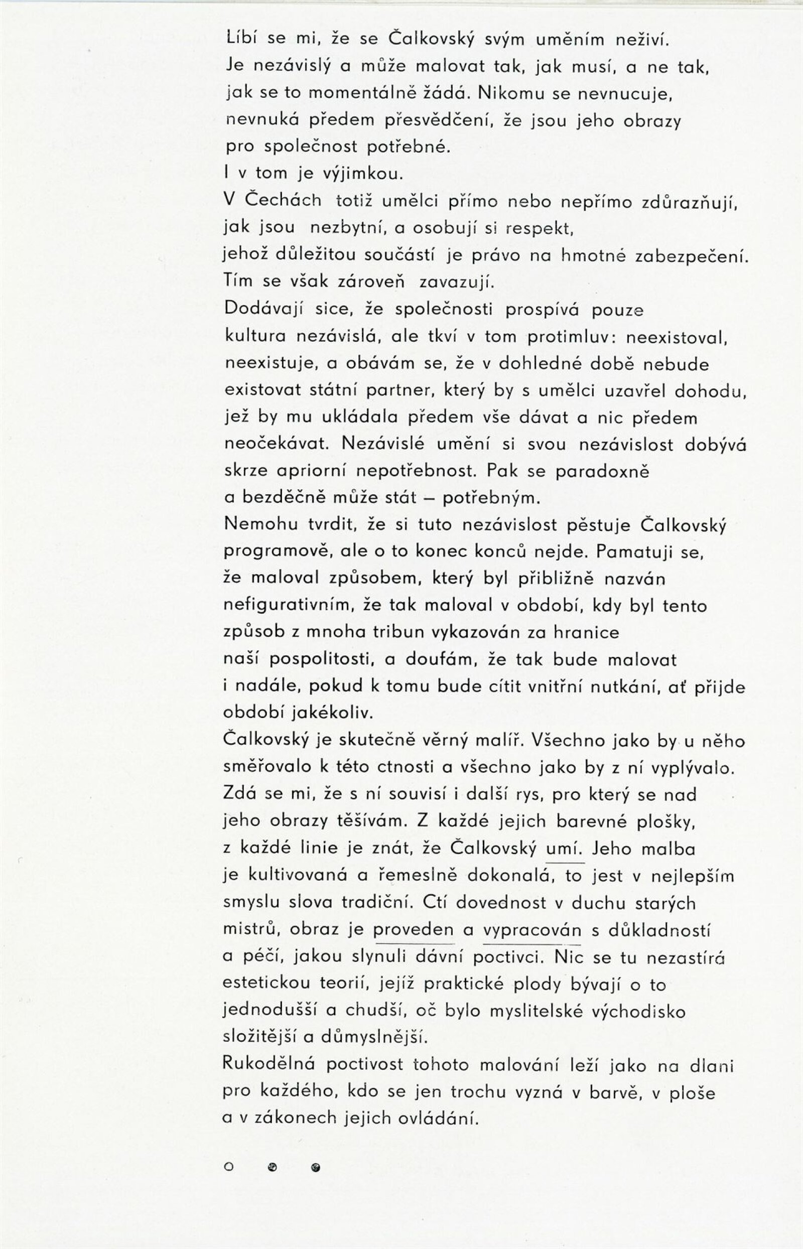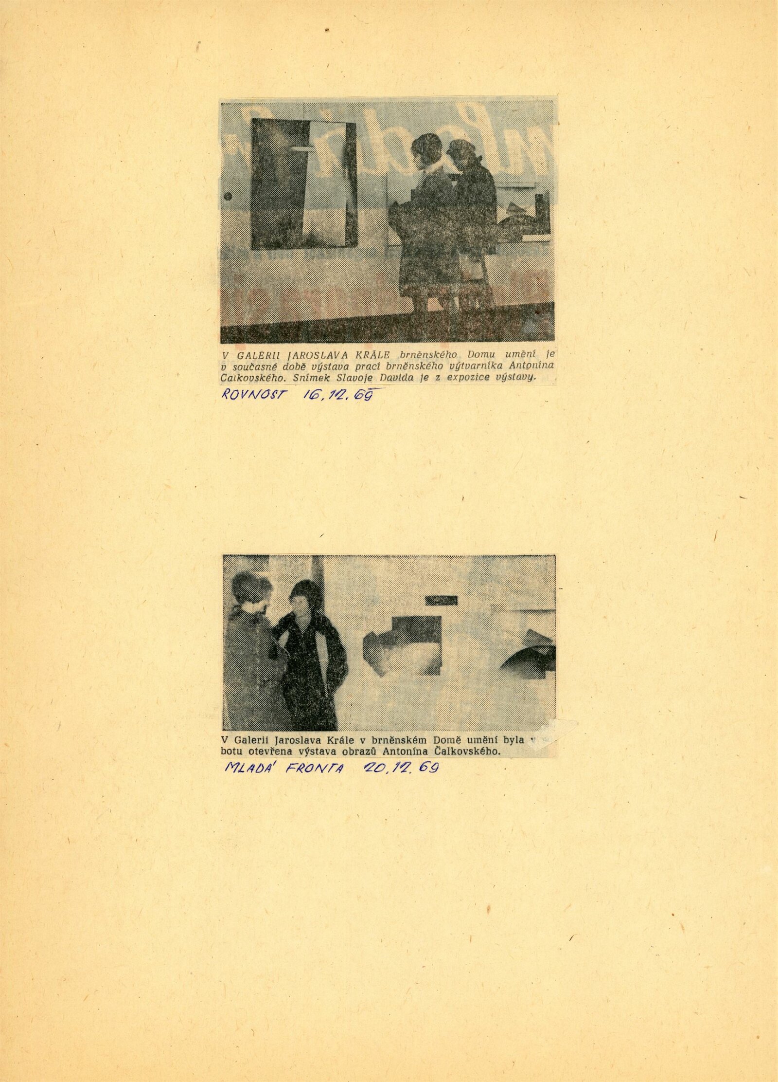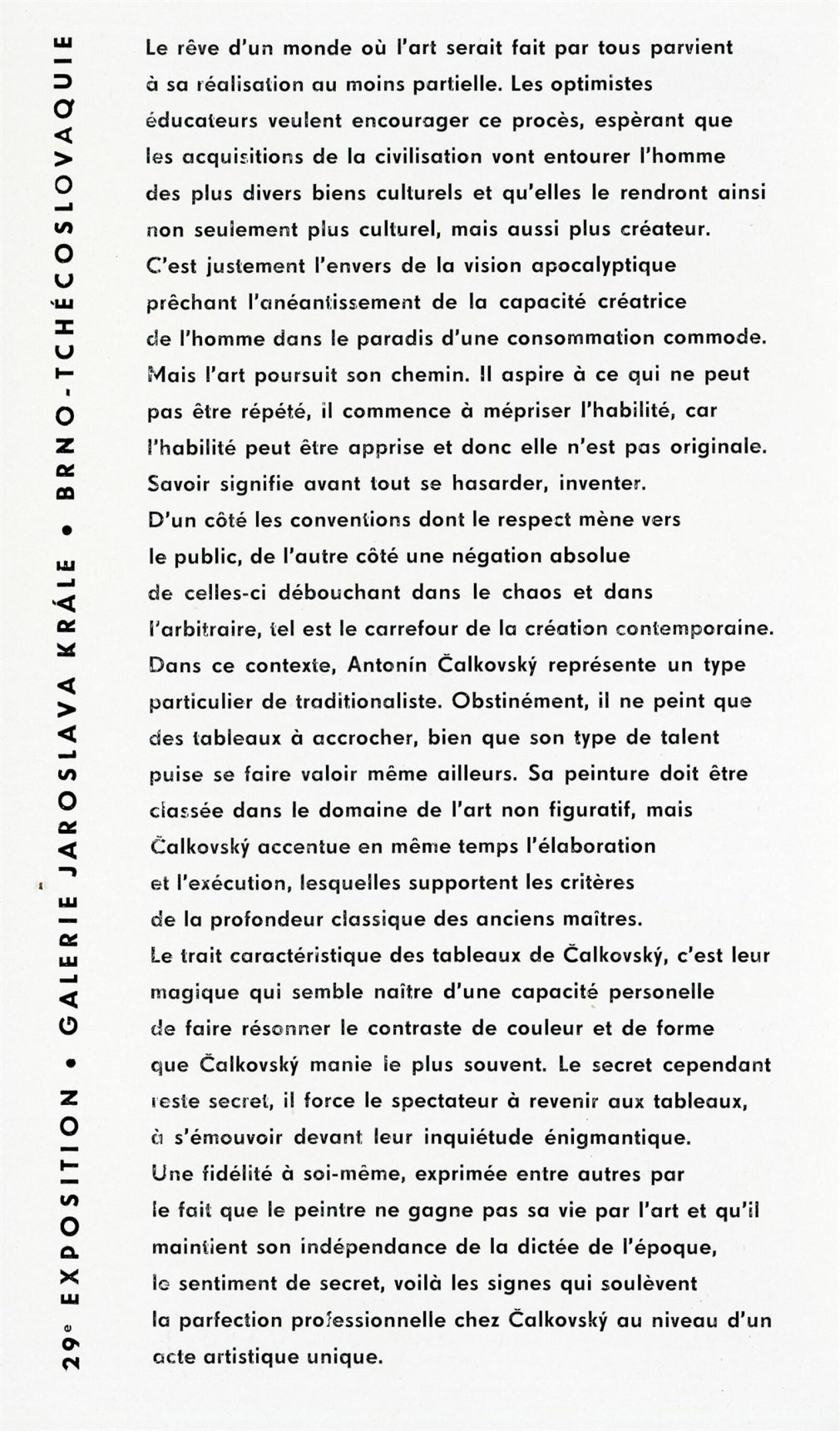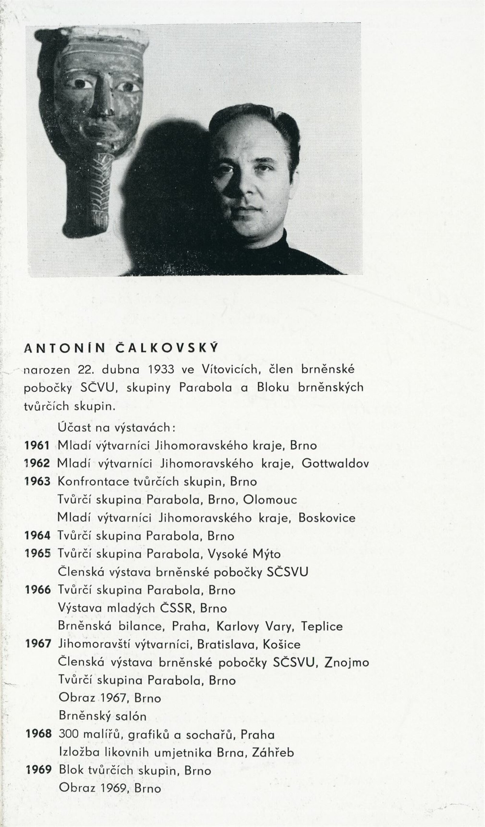 Antonín Čalkovský: Dům umění, 29. výstava v Galerii Jaroslava Krále, 13. 12. 1969 – 11. 1. 1970 / Text: Milan Uhde. – Brno: ČFVU, 1969. – 10 s., obr., portrét, životní data, výstavy, DU 537. – MZK; MG; MMB