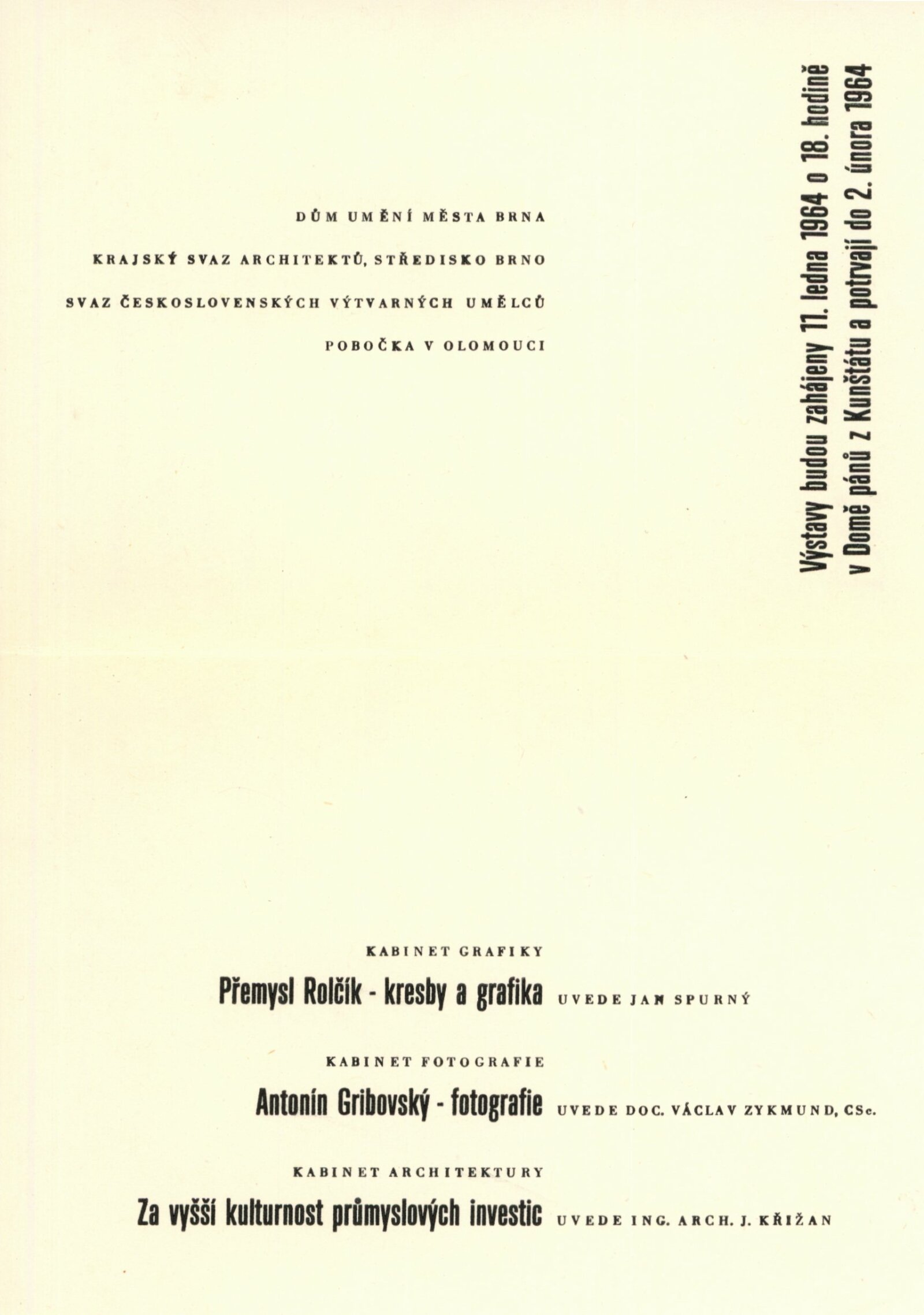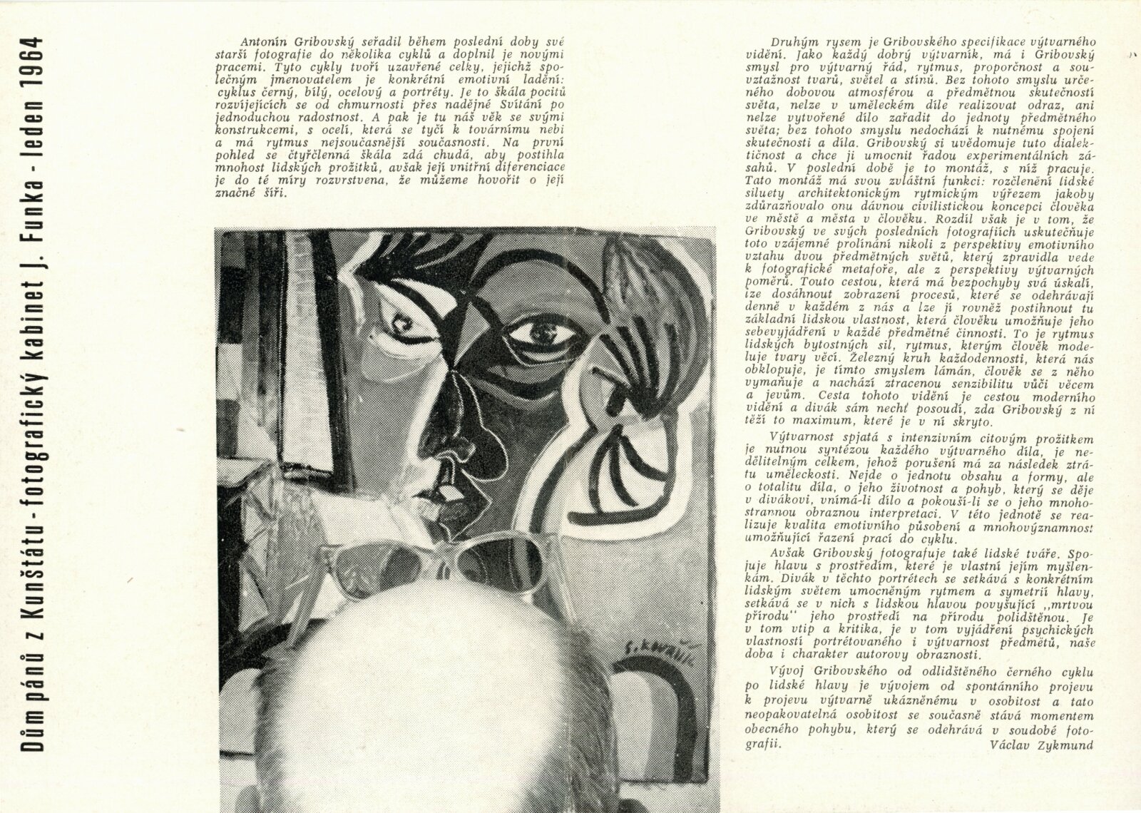 Antonín Gribovský. Fotografie: Dům umění města Brna / Dům pánů z Kunštátu, 51. výstava Kabinetu fotografie Jaromíra Funka, 11. 1. – 2. 2. 1964 / Text: Václav Zykmund. – Brno: DUmB, 1964. – skládačka, 6 s., obr., DPK 214. – MZK; MG
