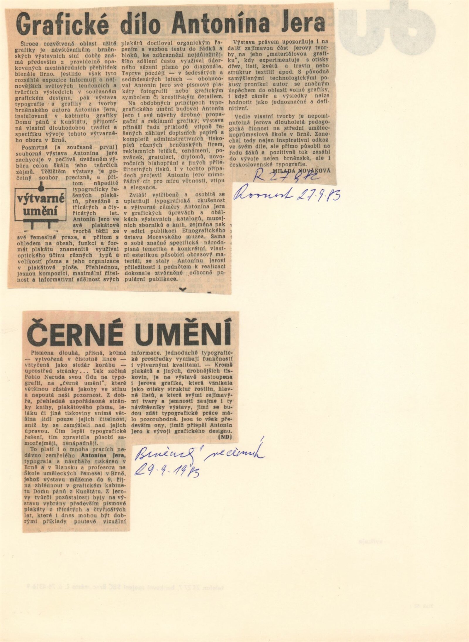 pozvánka, katalog, strojopis, text o autorovi od Milady Novákové, zpráva o výstavě, fotografie pro katalog, provozní korespondence, rukopis doporučujícího dopisu od Dalibora Chatrného a Jiřího Šindlera, žádost o výstavu od Petra Jera (syn), žádost o povolení výstavy, recenze v tisku, parte Antonína Jera