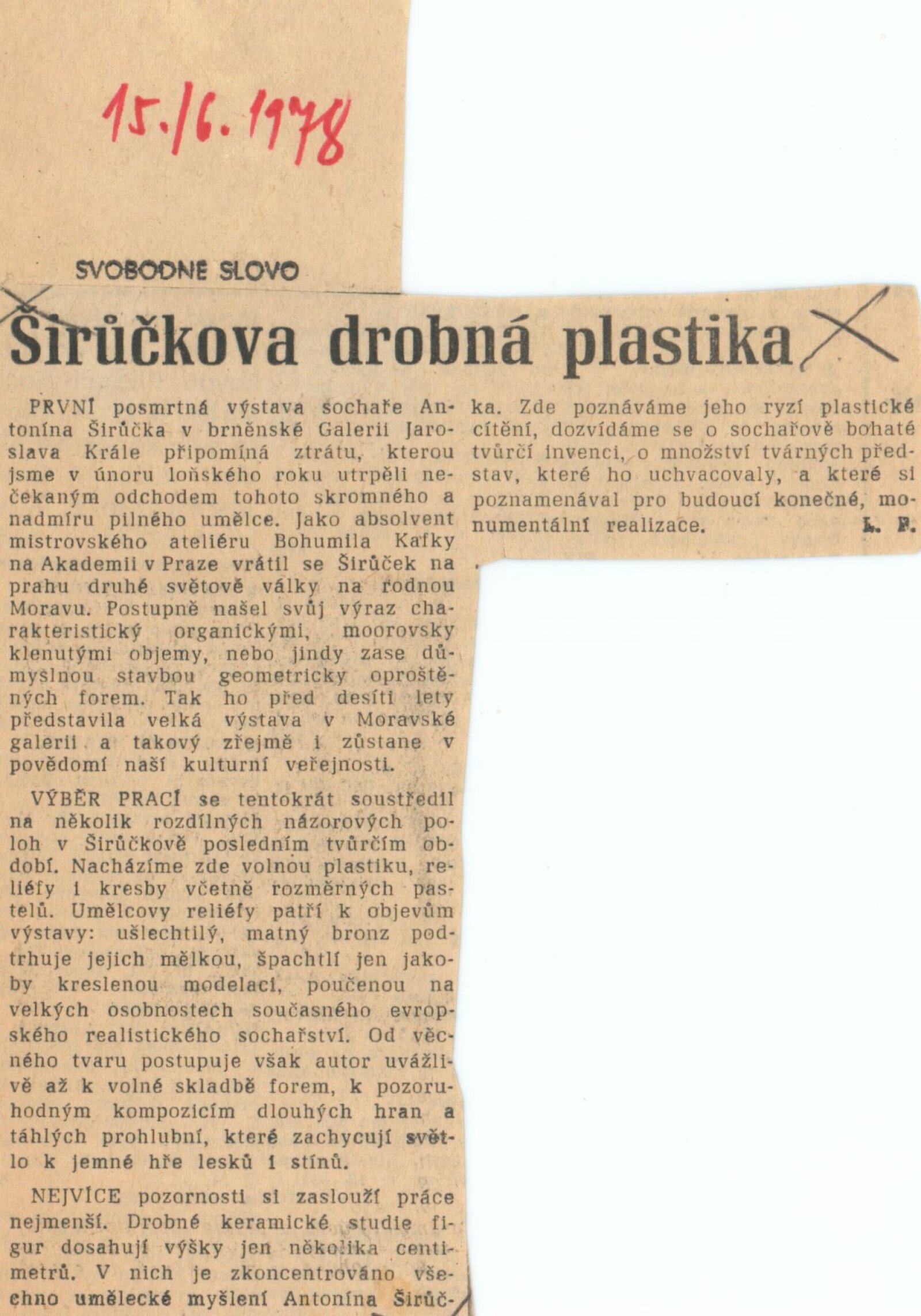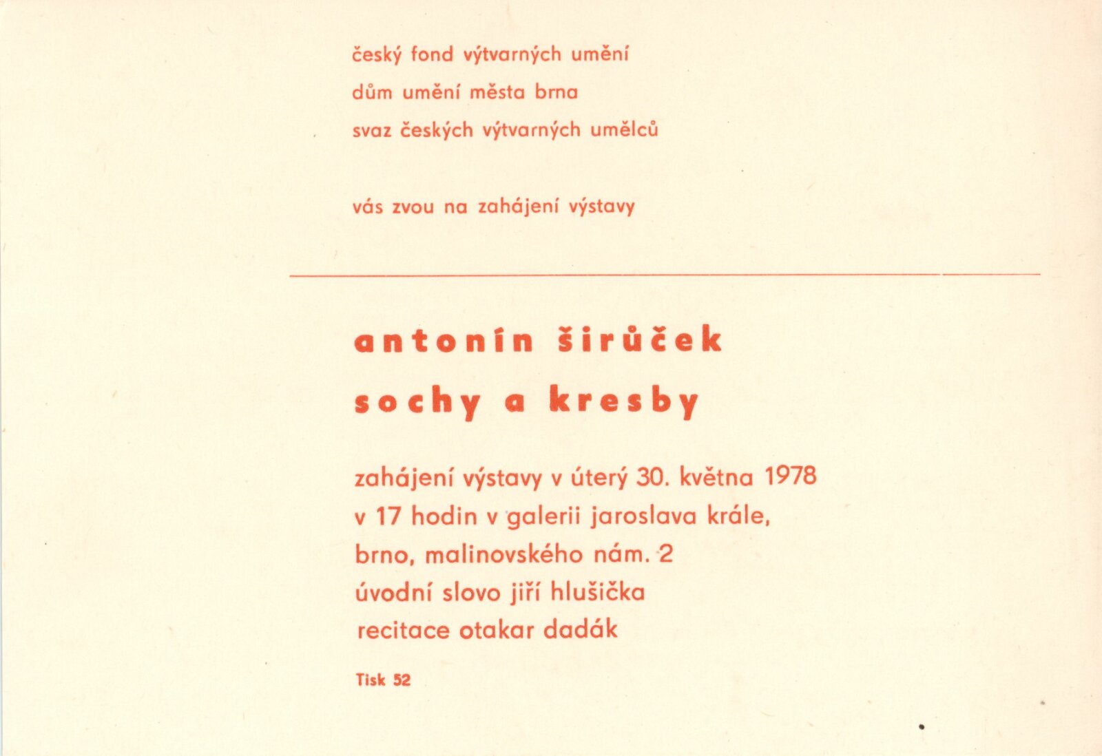 Antonín Širůček. Sochy a kresby: 87. výstava v Galerii Jaroslava Krále 30. 5. – 2. 7. 1978 / Text Jiří Hlušička. - Brno: ČFVU, - 10 s., obr. Portrét, životní data, výstavy, realizace Neobsahuje seznam vystavených děl DU 677