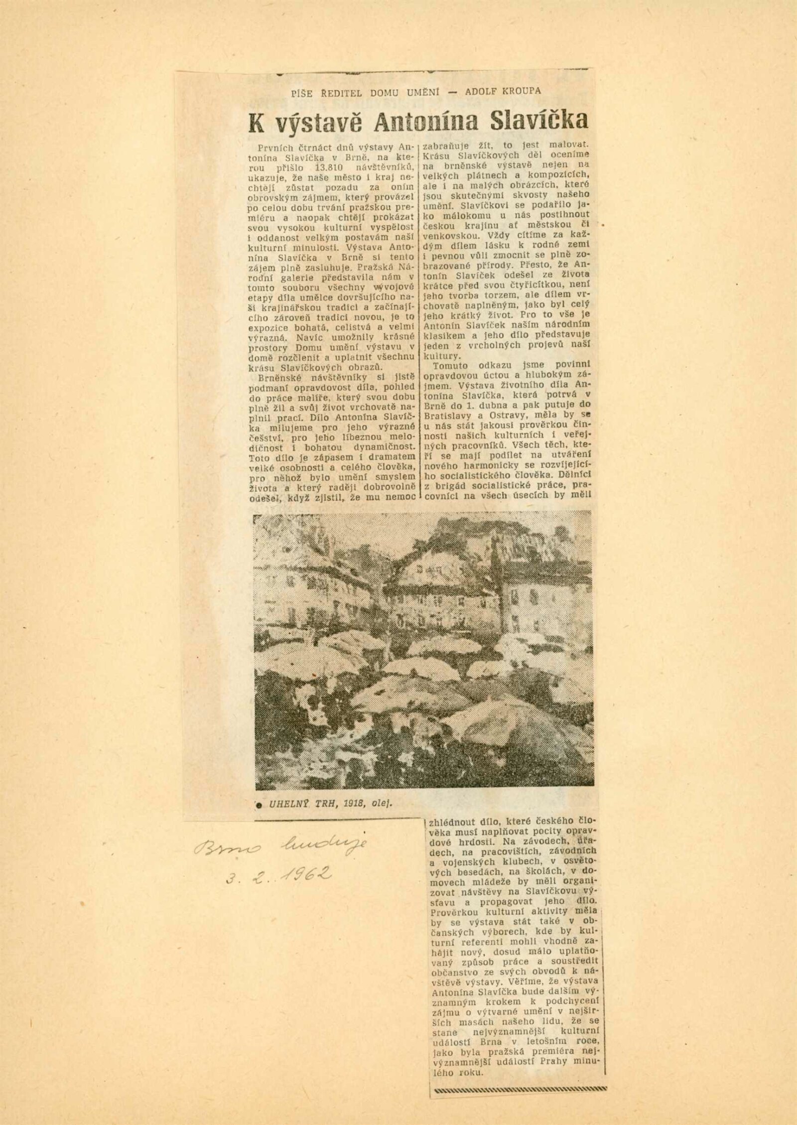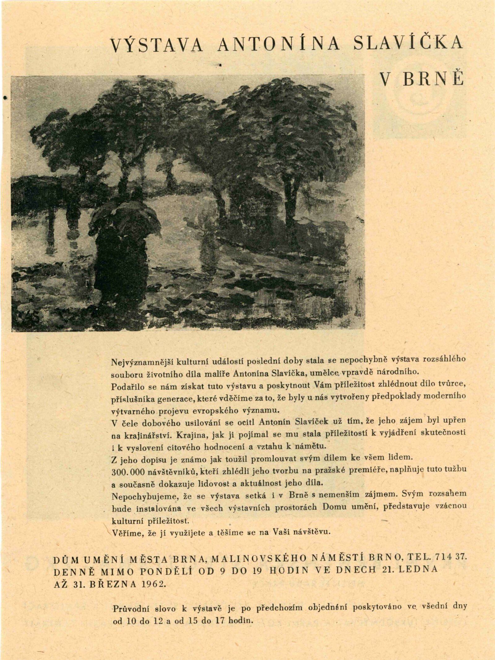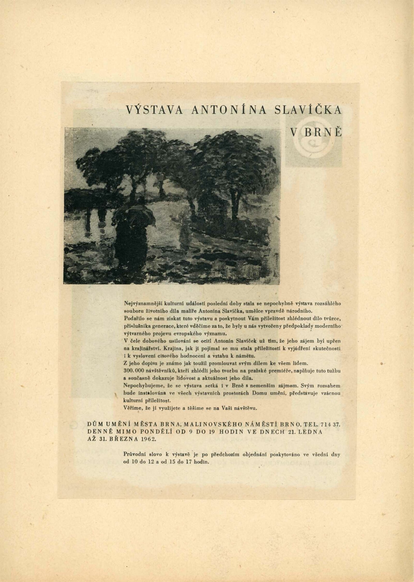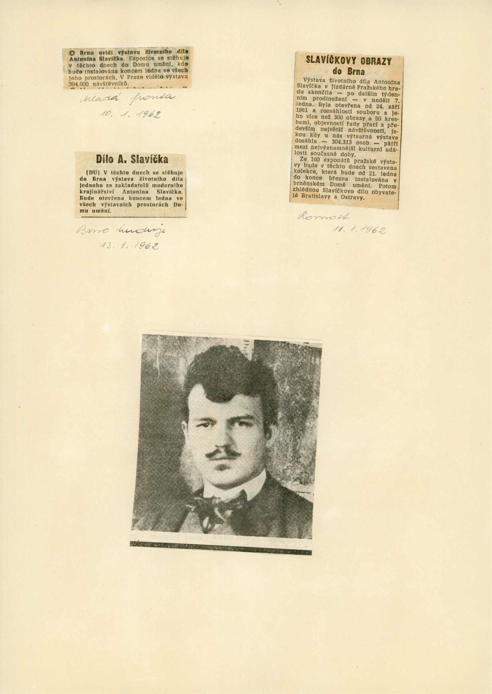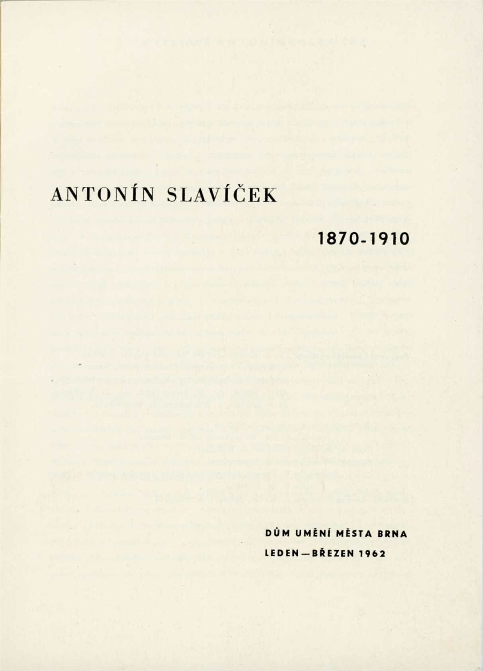 Antonín Slavíček 1870–1910: Dům umění města Brna, 21. 1. – 1. 4. 1962 / Text: Jiří Kotalík. – Praha: Národní galerie, 1962. – 31 s., 16 s. obr. příl., seznam exponátů 11 s., portrét, životopis, DU 410. – MZK; MG; MMB