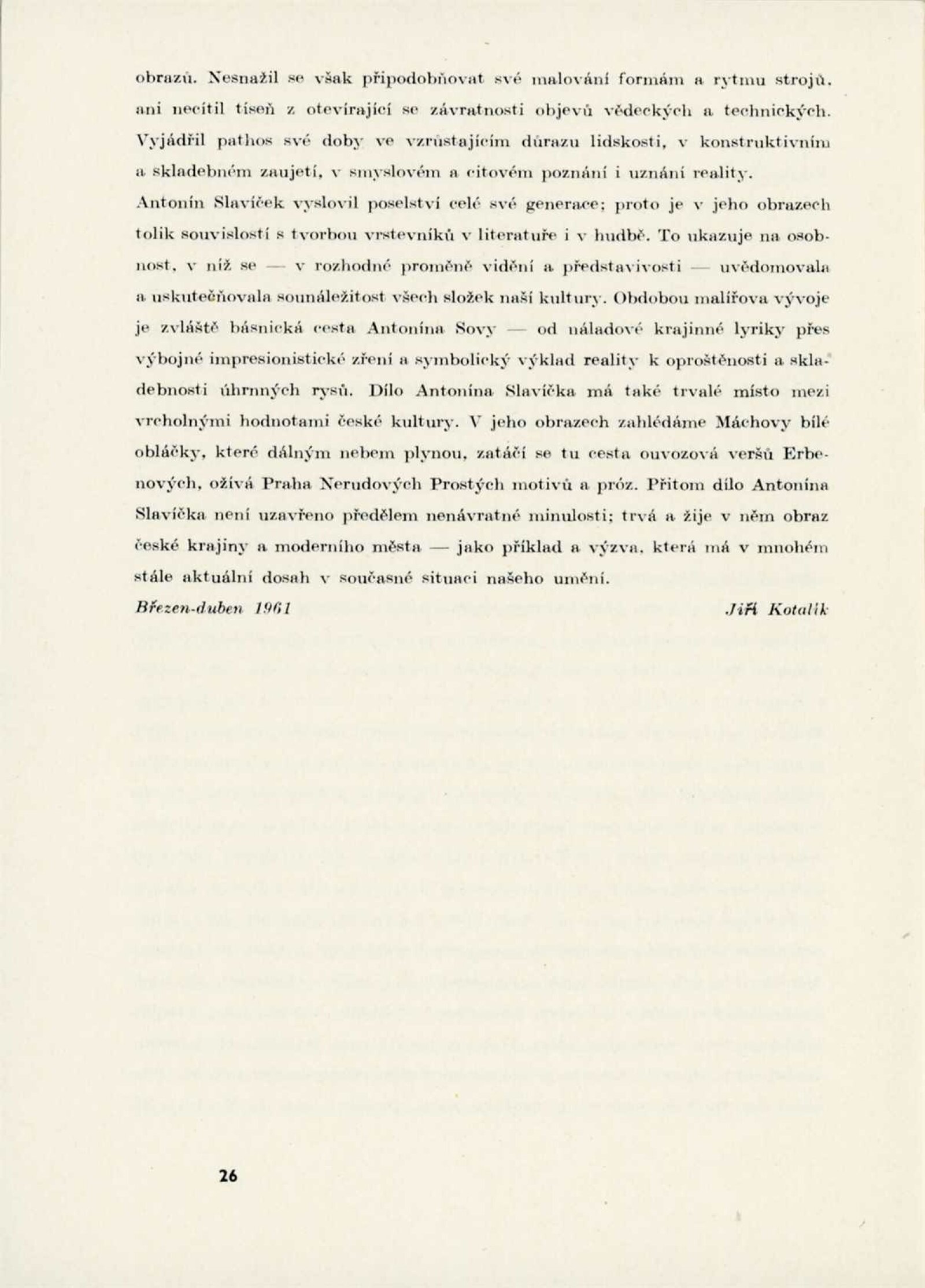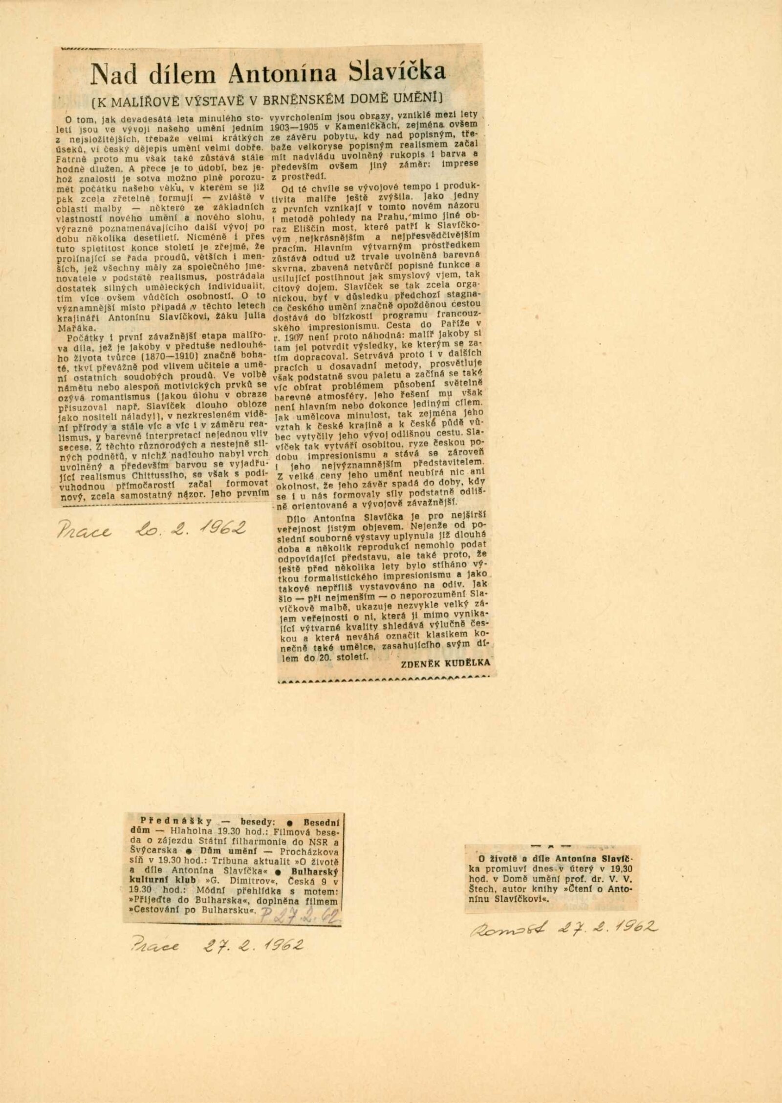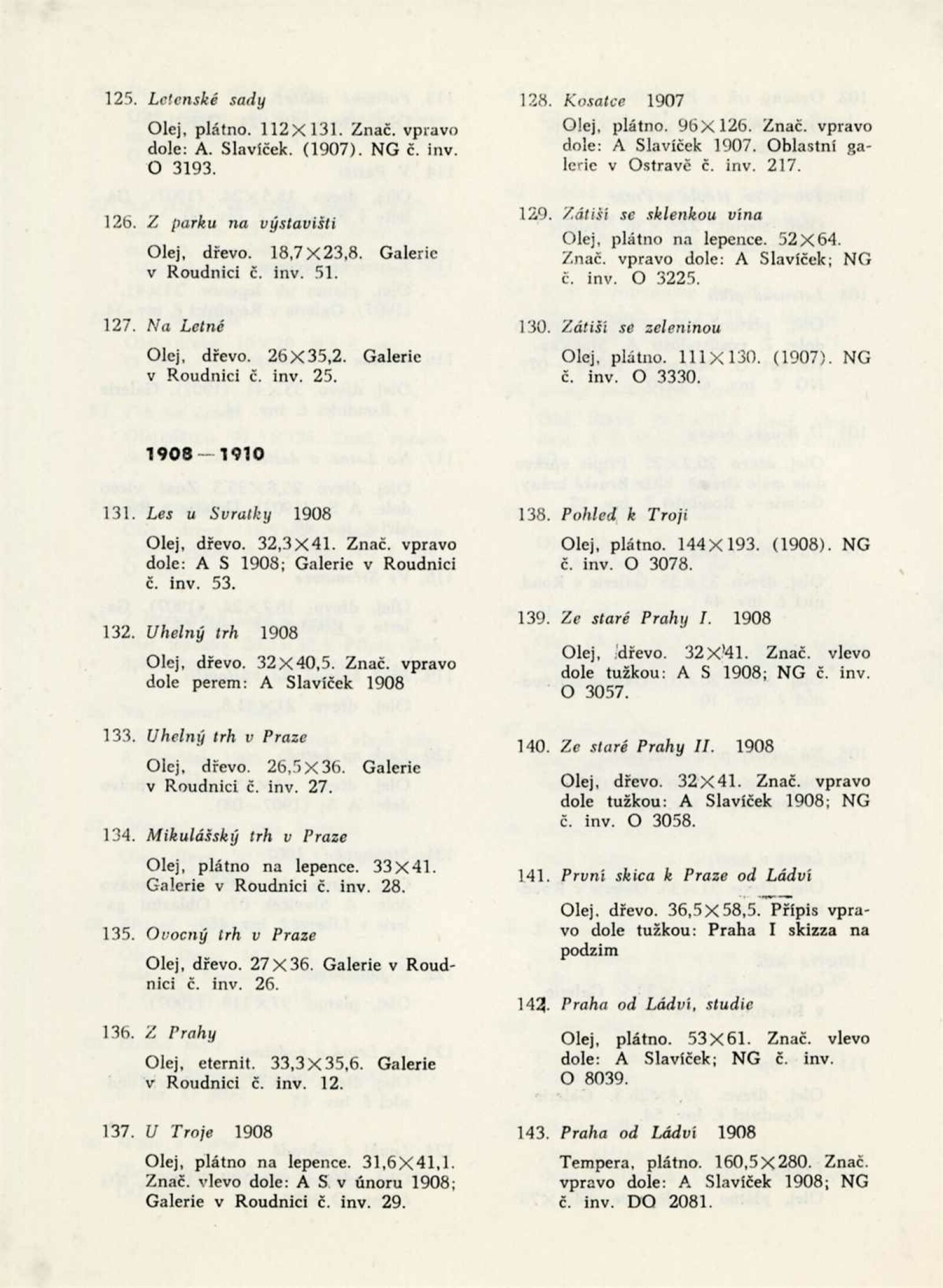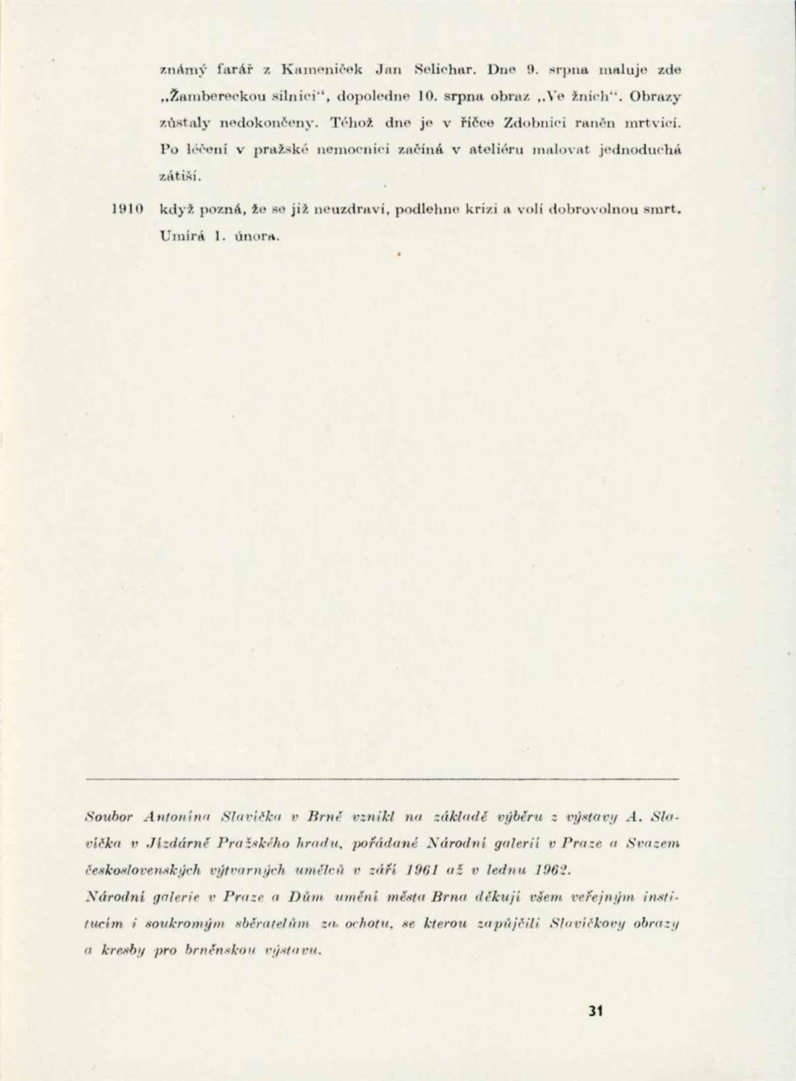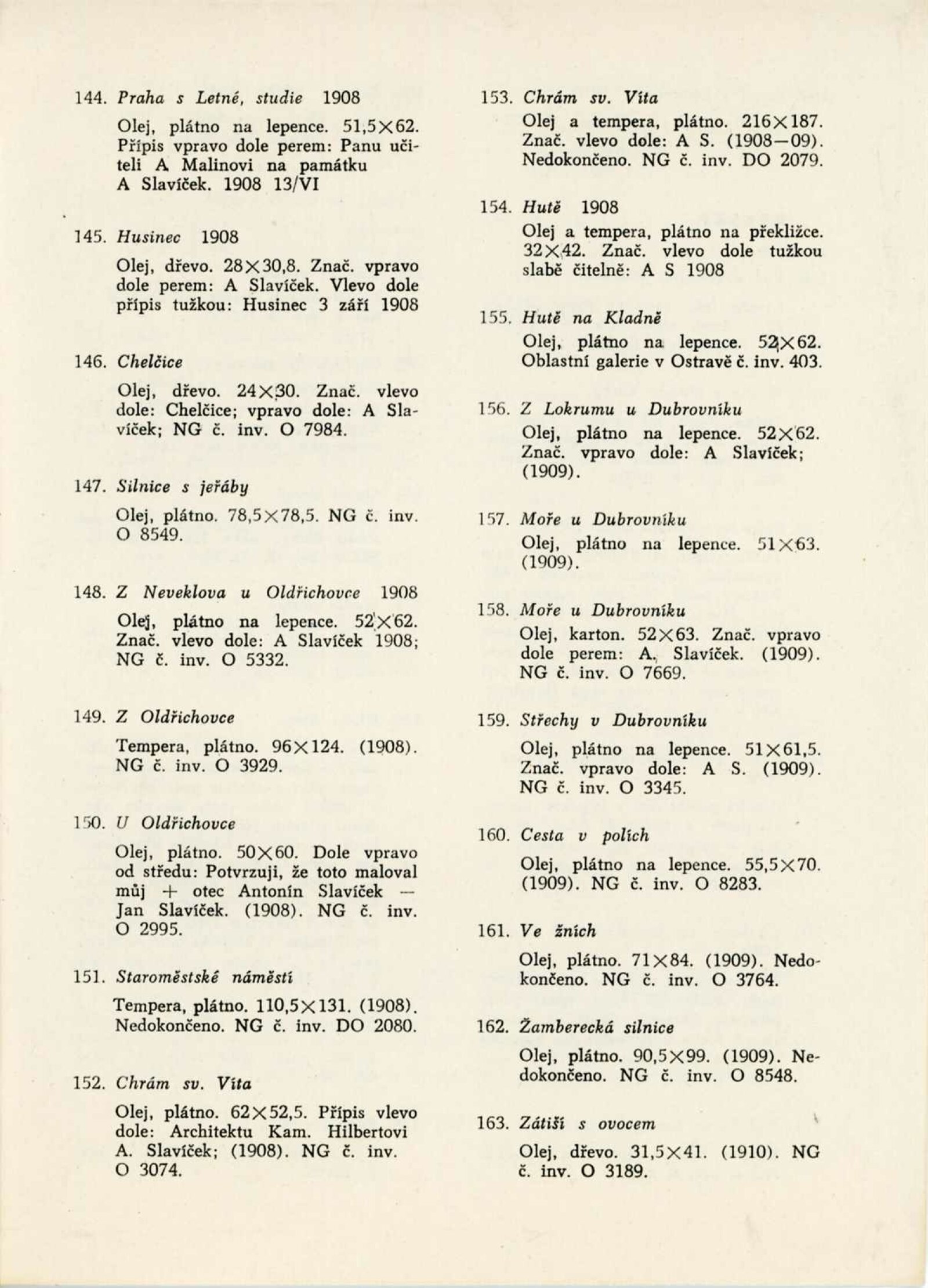 Antonín Slavíček 1870–1910: Dům umění města Brna, 21. 1. – 1. 4. 1962 / Text: Jiří Kotalík. – Praha: Národní galerie, 1962. – 31 s., 16 s. obr. příl., seznam exponátů 11 s., portrét, životopis, DU 410. – MZK; MG; MMB