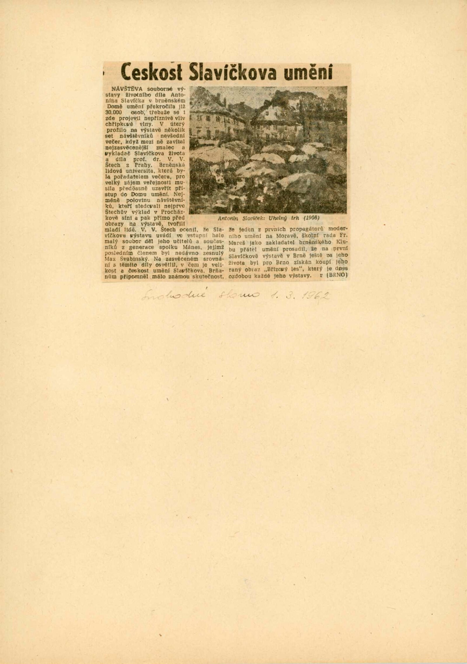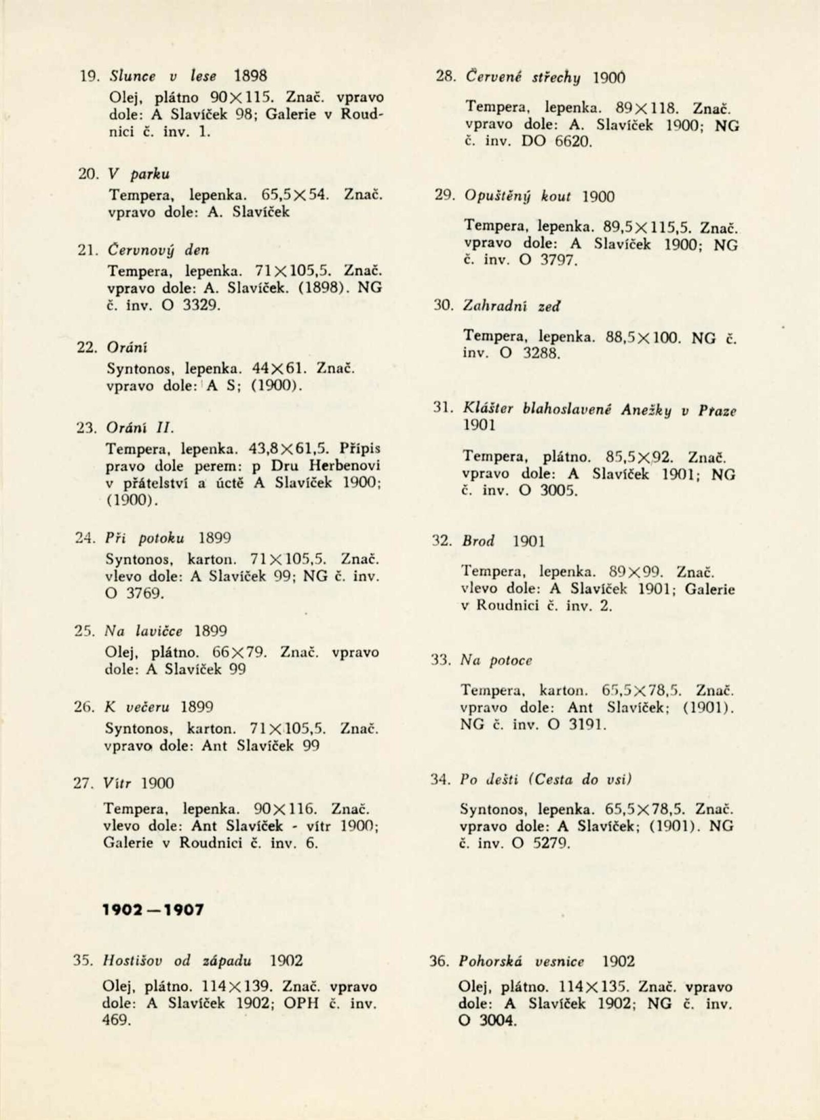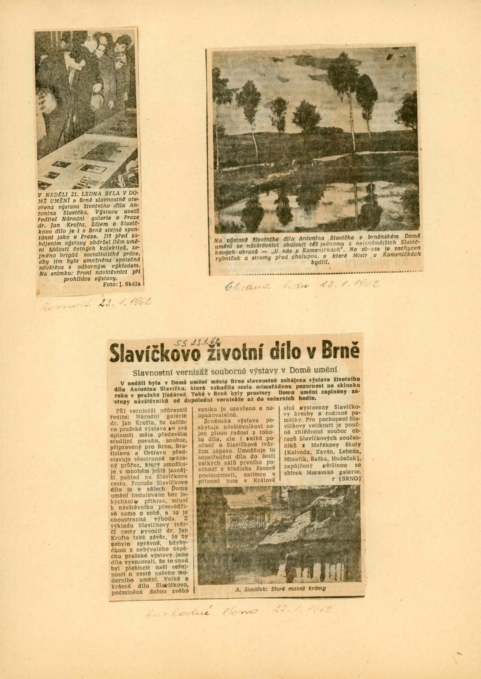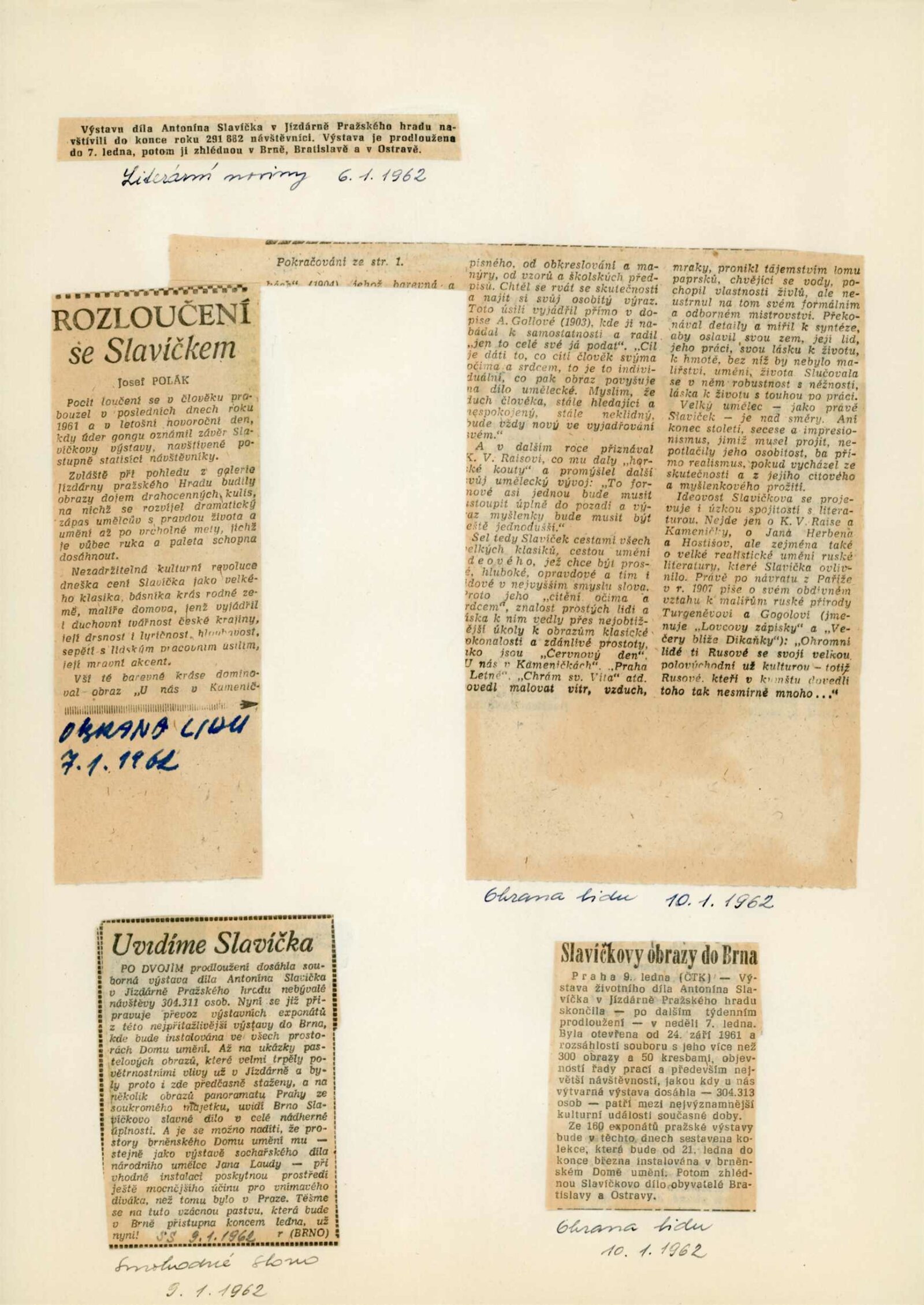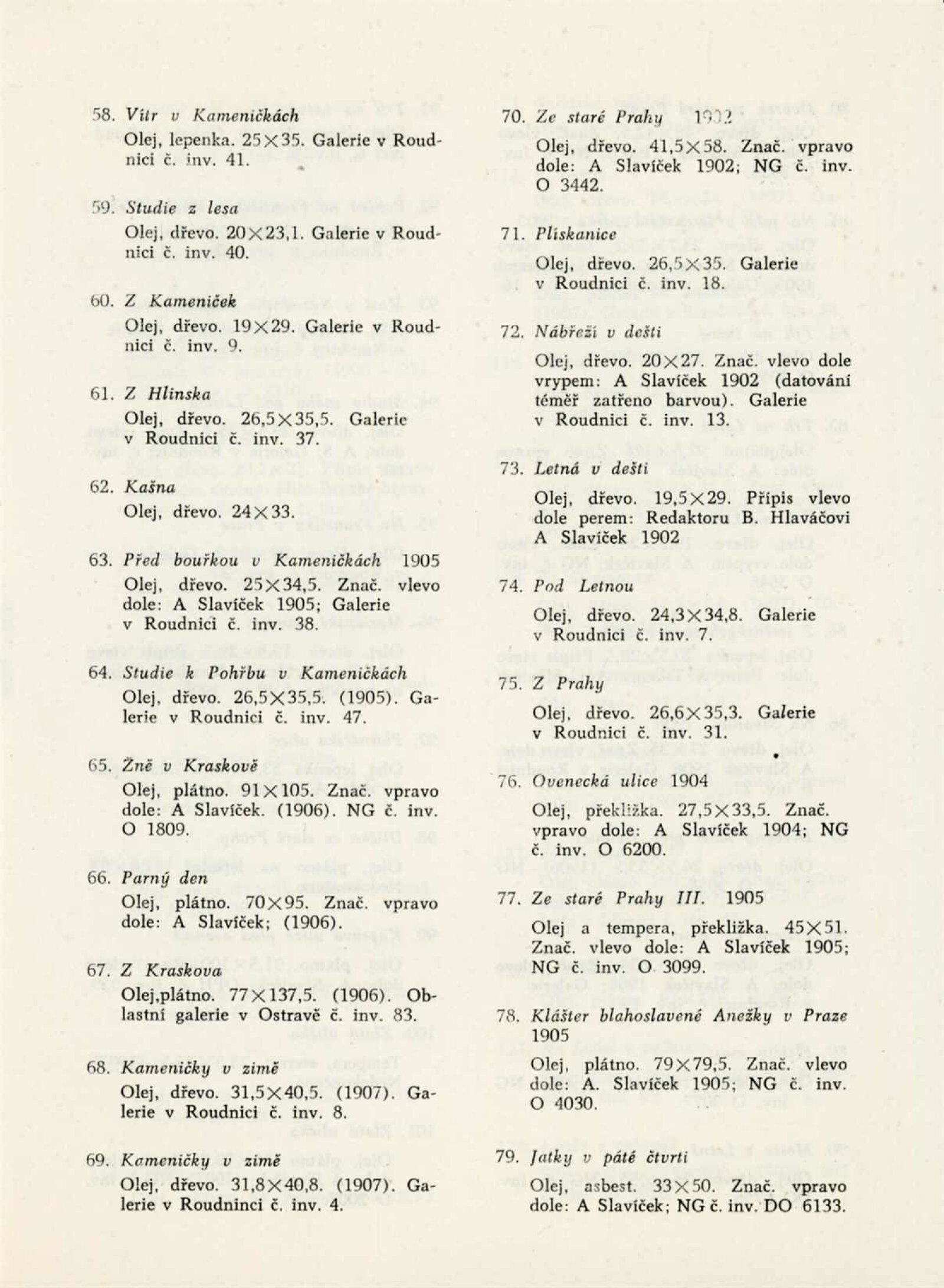 Antonín Slavíček 1870–1910: Dům umění města Brna, 21. 1. – 1. 4. 1962 / Text: Jiří Kotalík. – Praha: Národní galerie, 1962. – 31 s., 16 s. obr. příl., seznam exponátů 11 s., portrét, životopis, DU 410. – MZK; MG; MMB