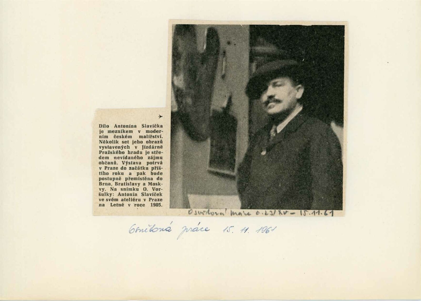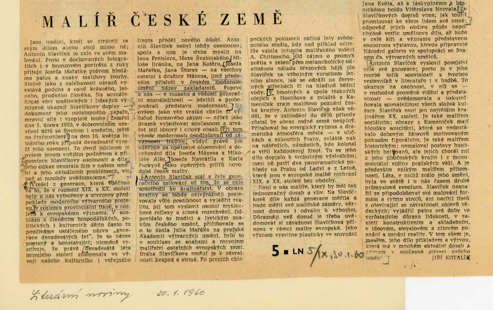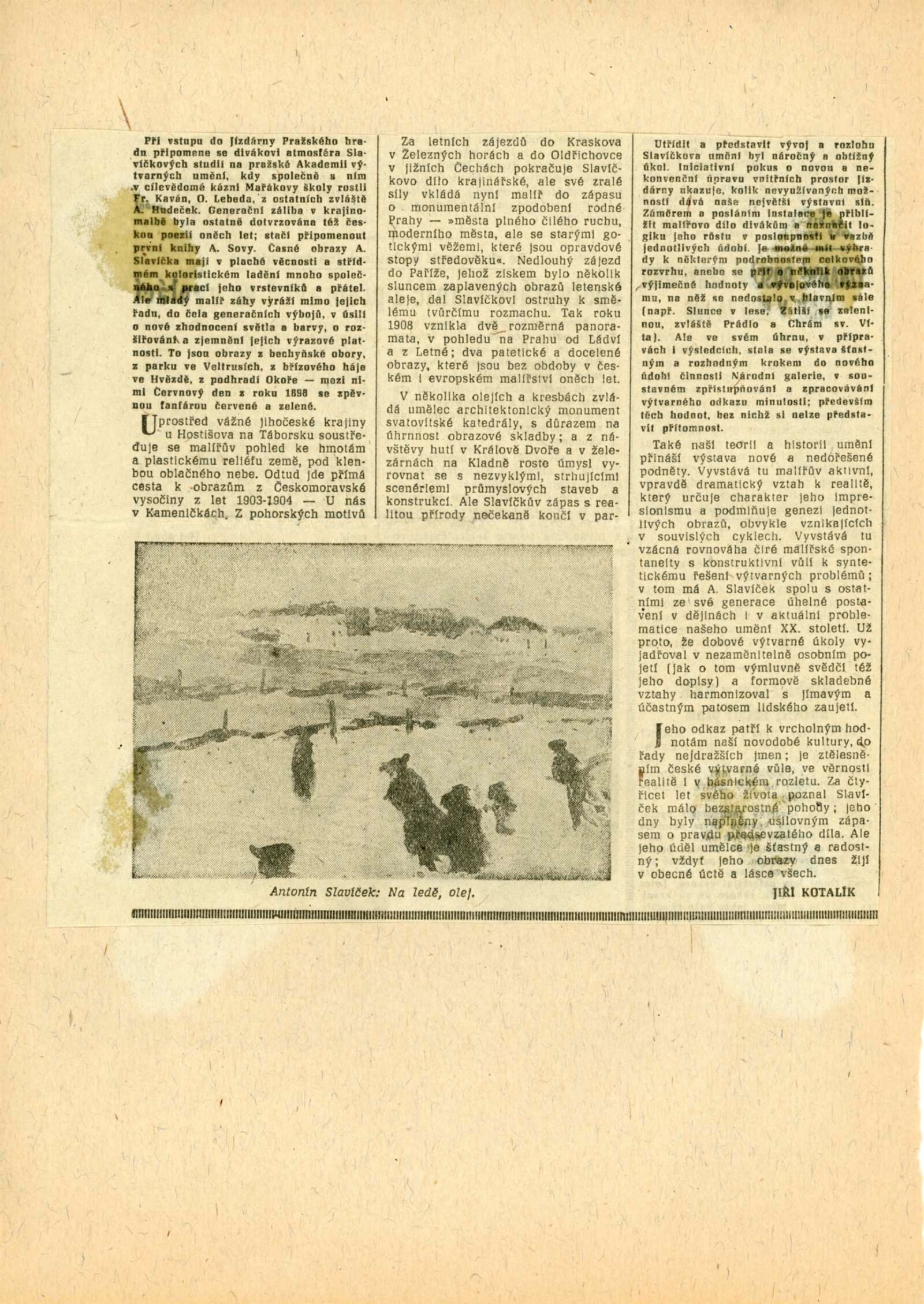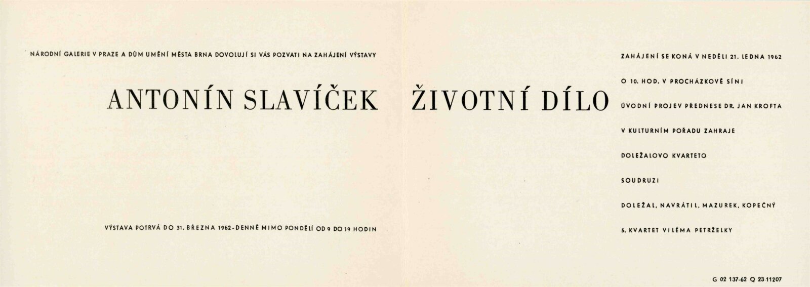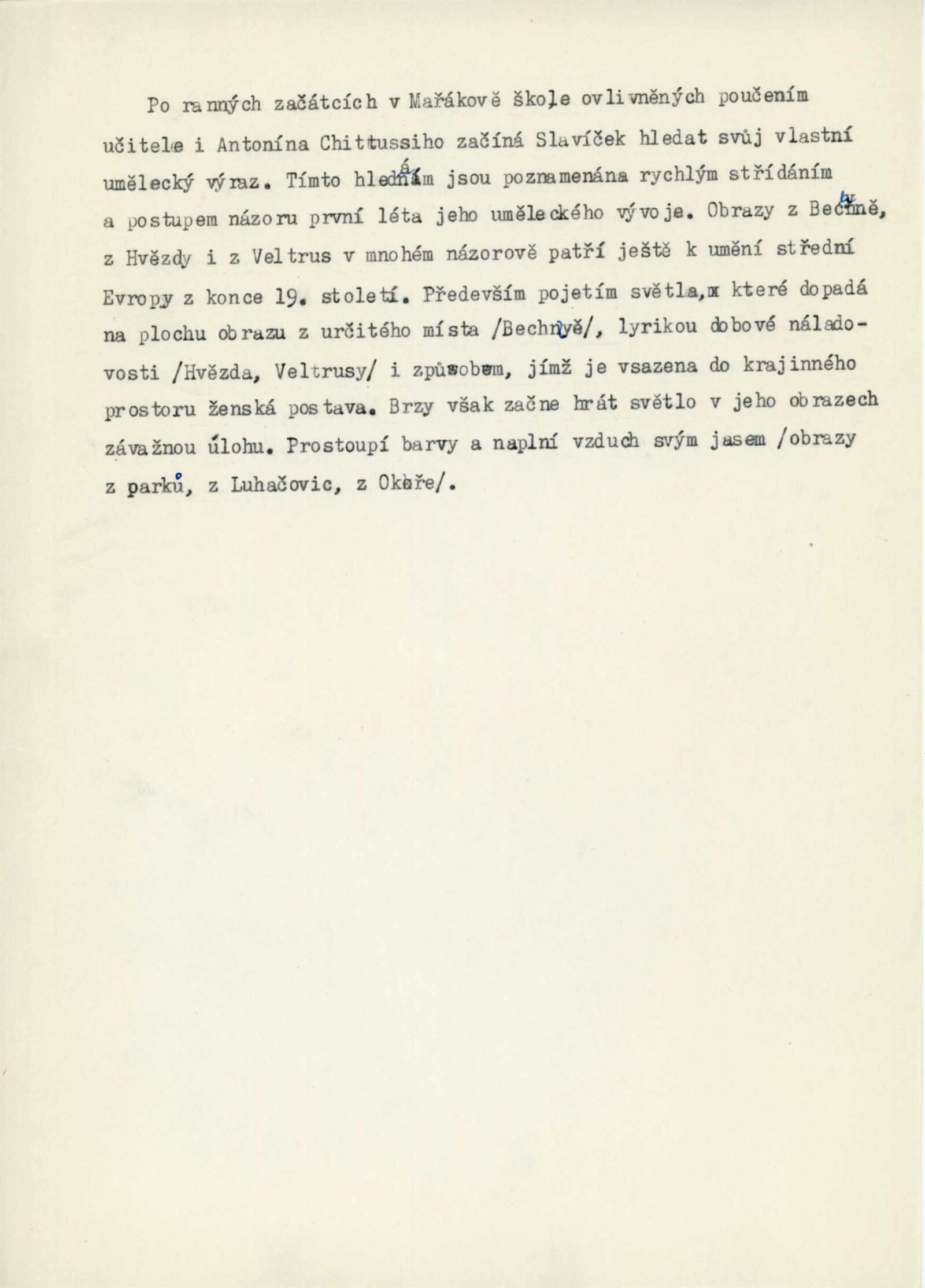 Antonín Slavíček 1870–1910: Dům umění města Brna, 21. 1. – 1. 4. 1962 / Text: Jiří Kotalík. – Praha: Národní galerie, 1962. – 31 s., 16 s. obr. příl., seznam exponátů 11 s., portrét, životopis, DU 410. – MZK; MG; MMB