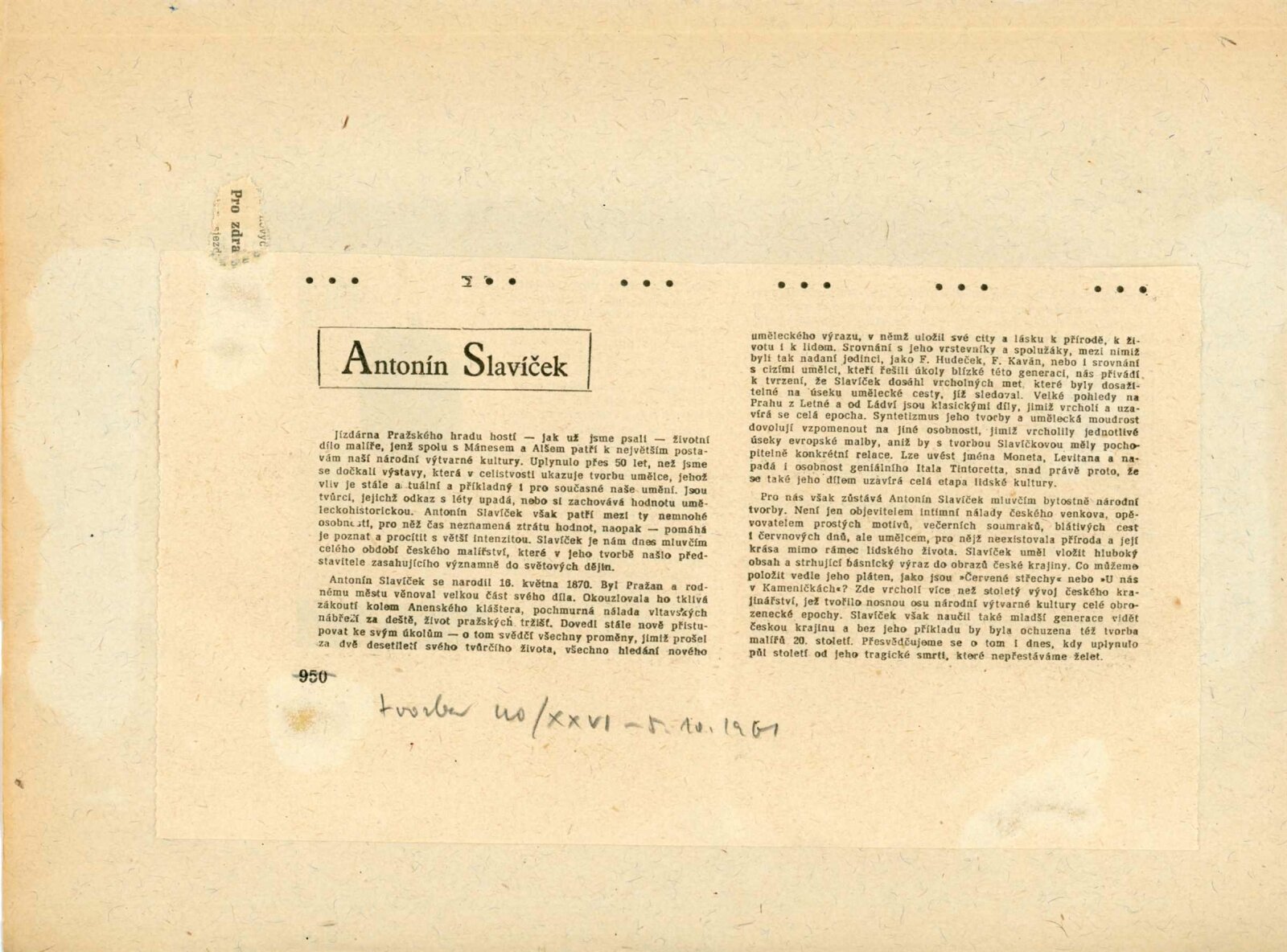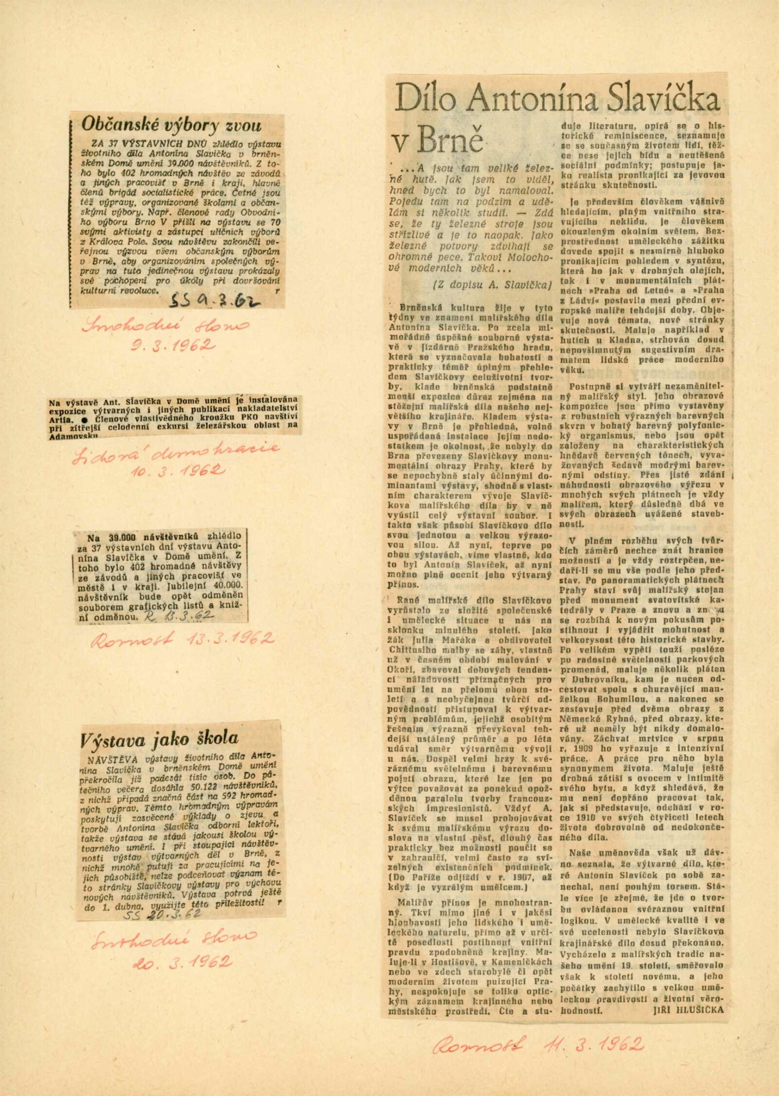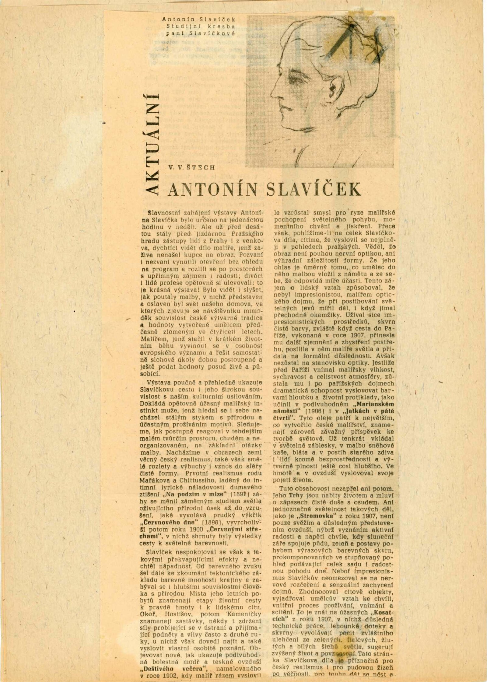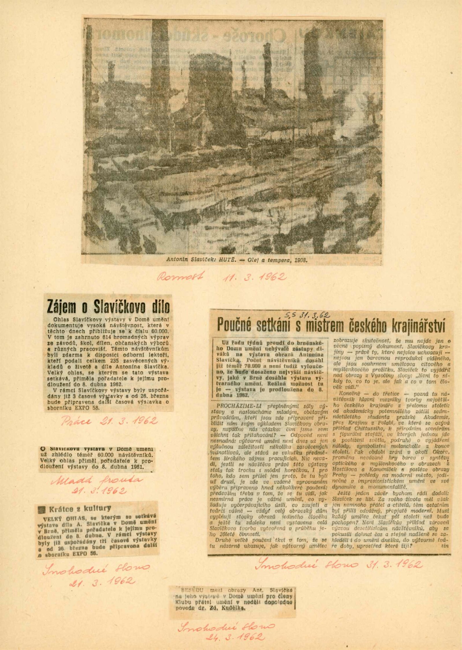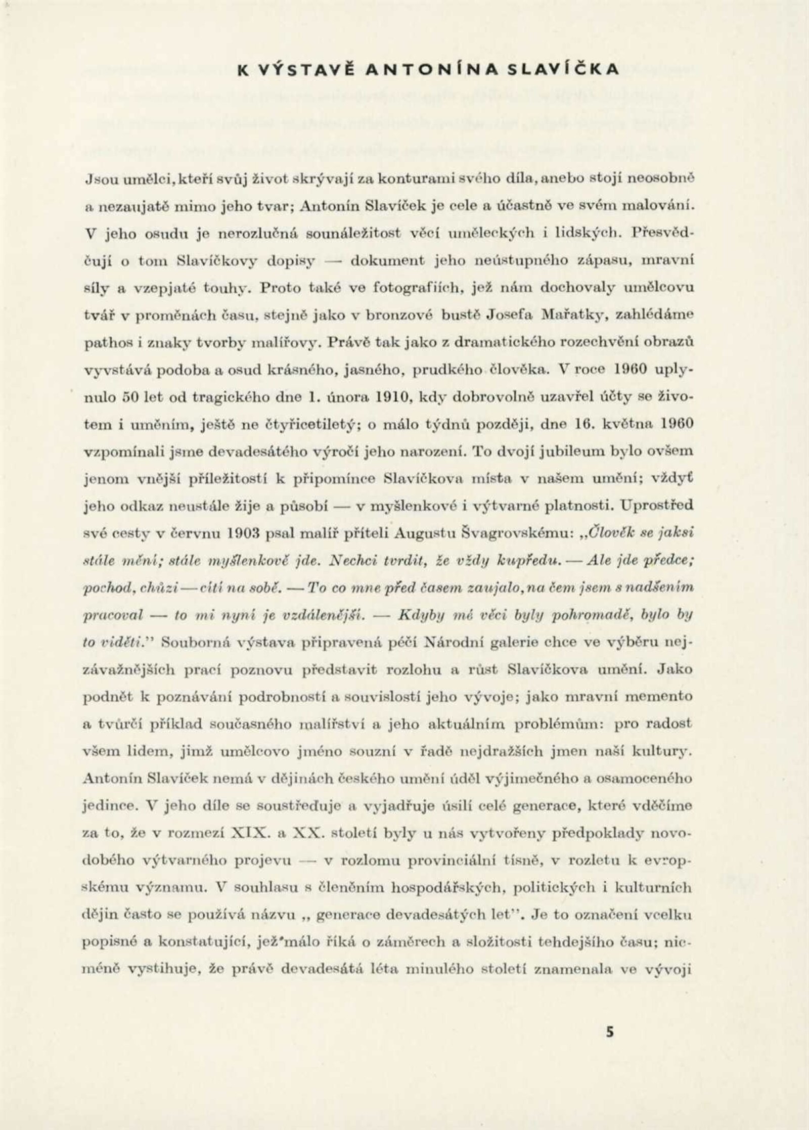 Antonín Slavíček 1870–1910: Dům umění města Brna, 21. 1. – 1. 4. 1962 / Text: Jiří Kotalík. – Praha: Národní galerie, 1962. – 31 s., 16 s. obr. příl., seznam exponátů 11 s., portrét, životopis, DU 410. – MZK; MG; MMB