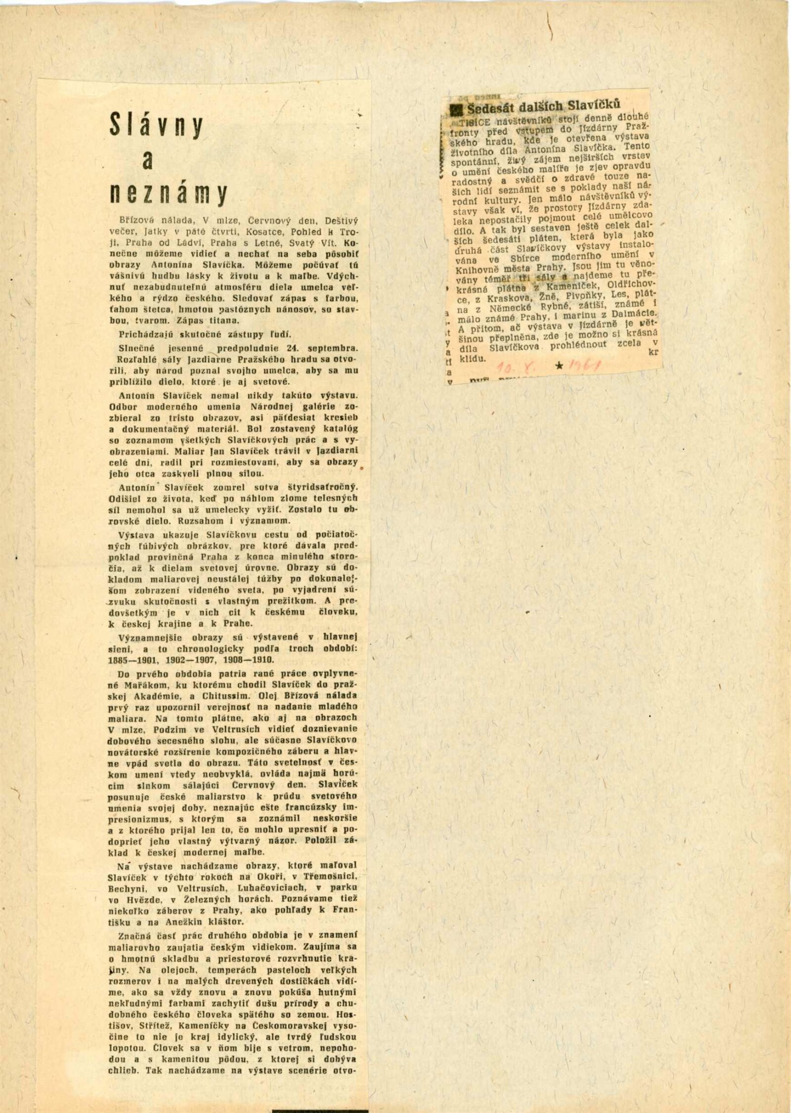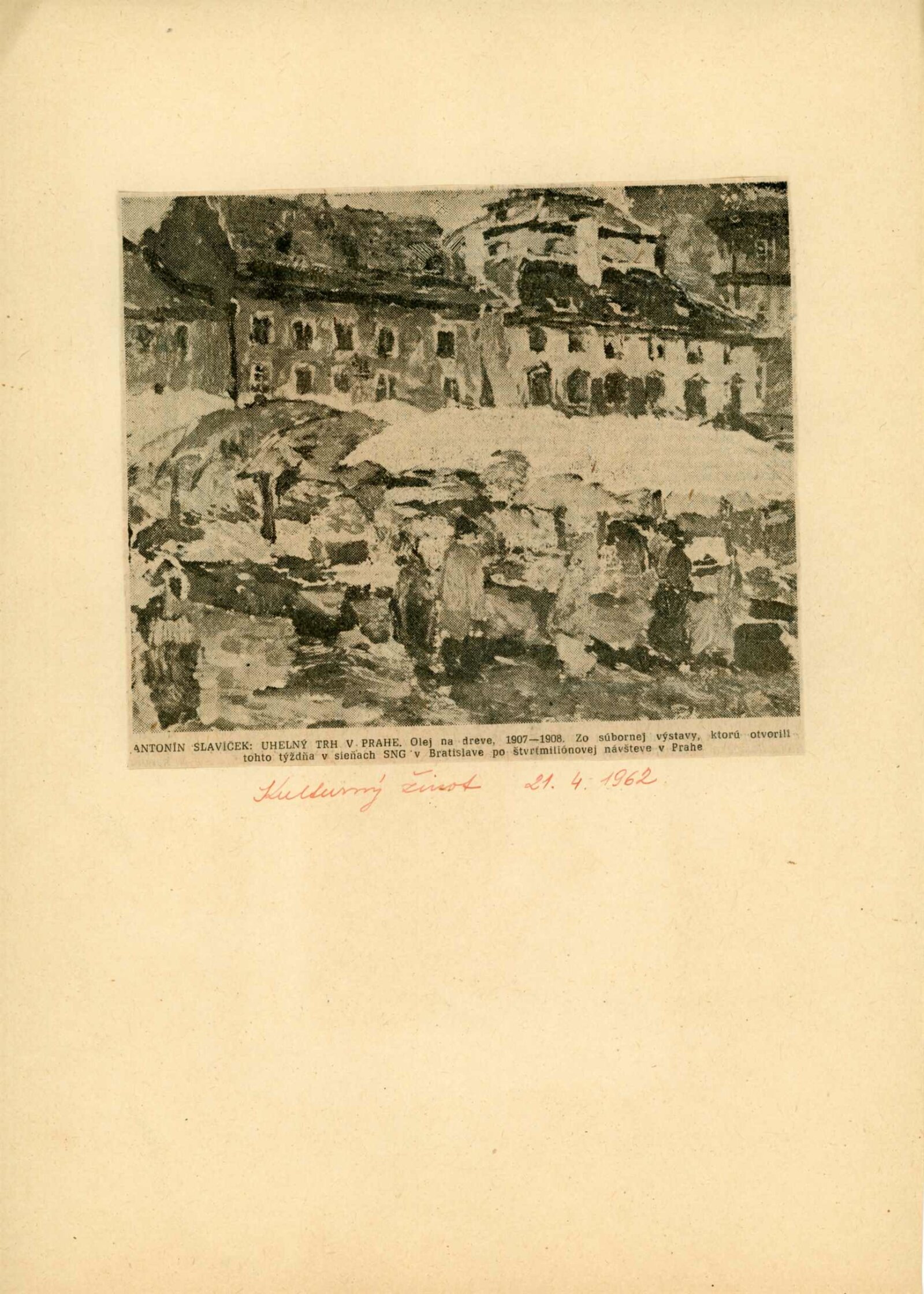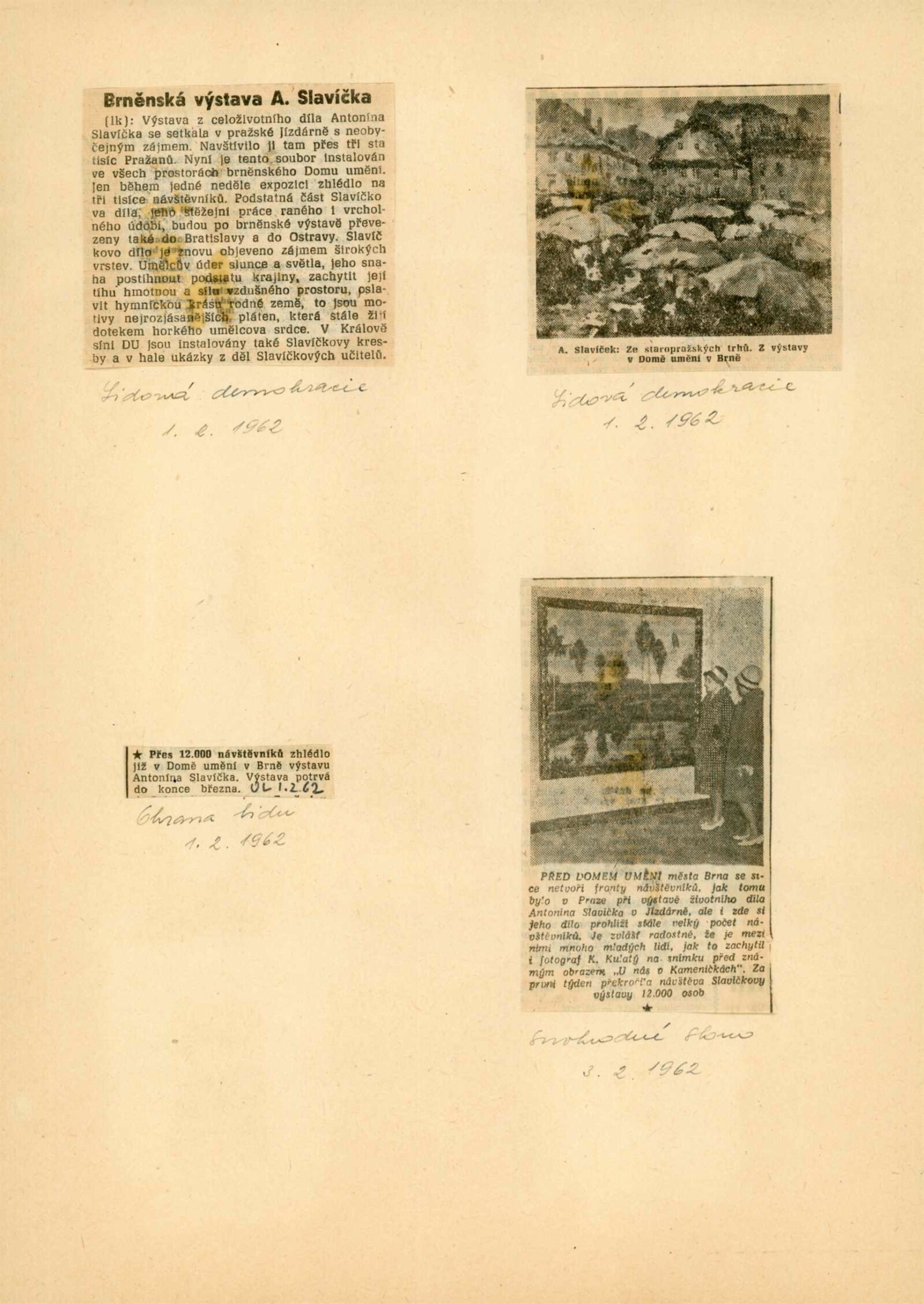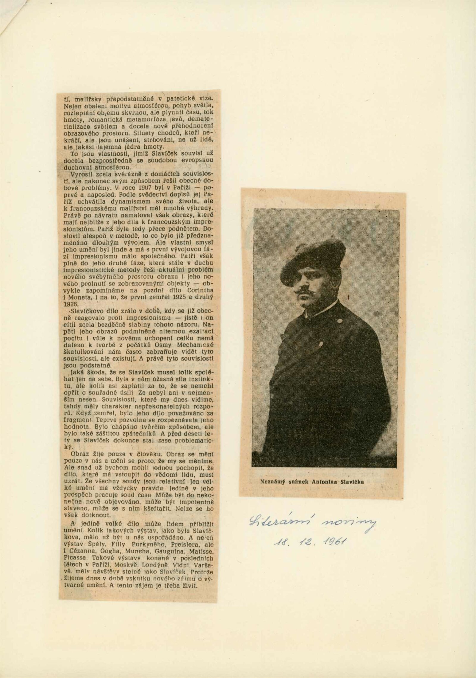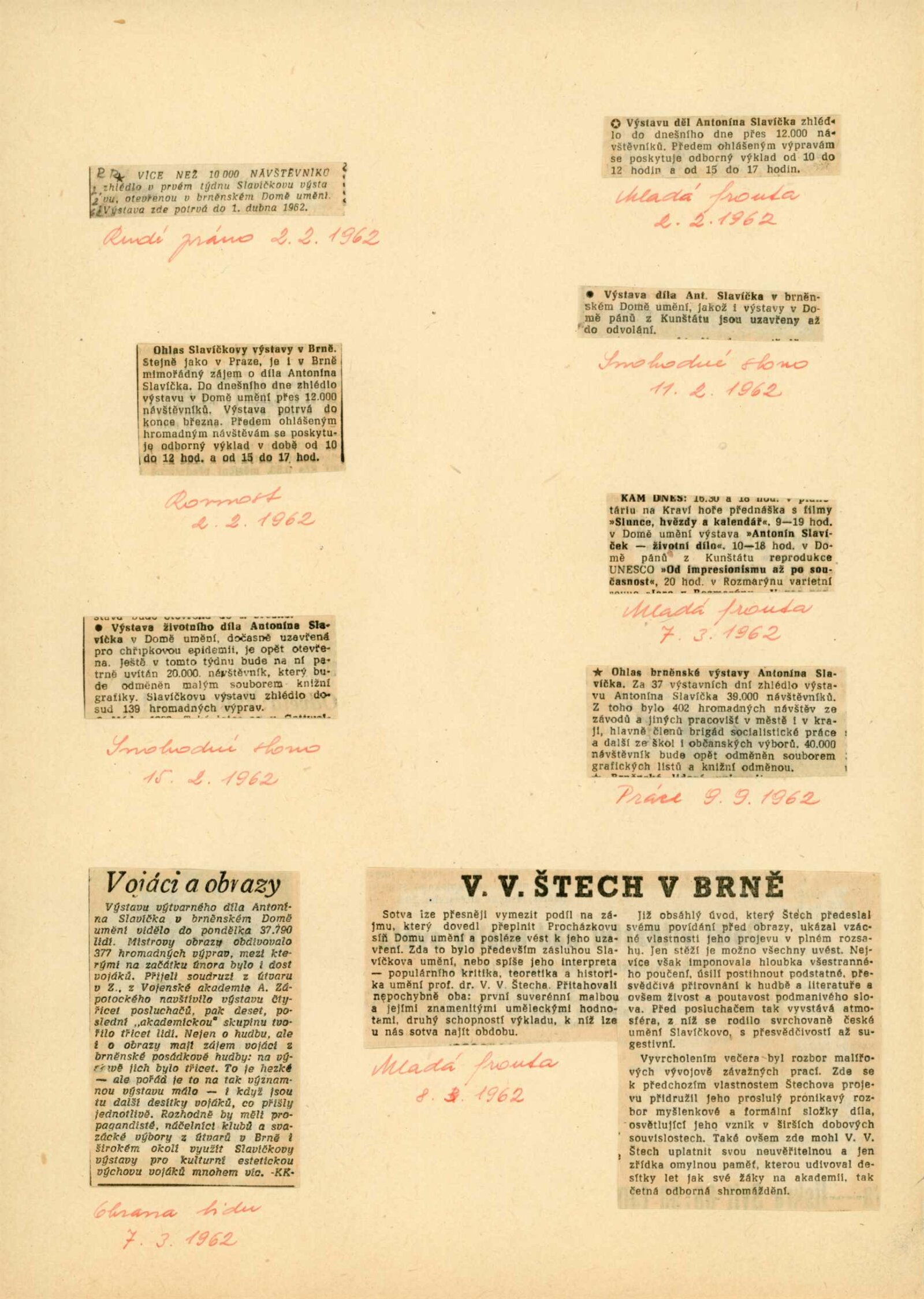 Antonín Slavíček 1870–1910: Dům umění města Brna, 21. 1. – 1. 4. 1962 / Text: Jiří Kotalík. – Praha: Národní galerie, 1962. – 31 s., 16 s. obr. příl., seznam exponátů 11 s., portrét, životopis, DU 410. – MZK; MG; MMB
