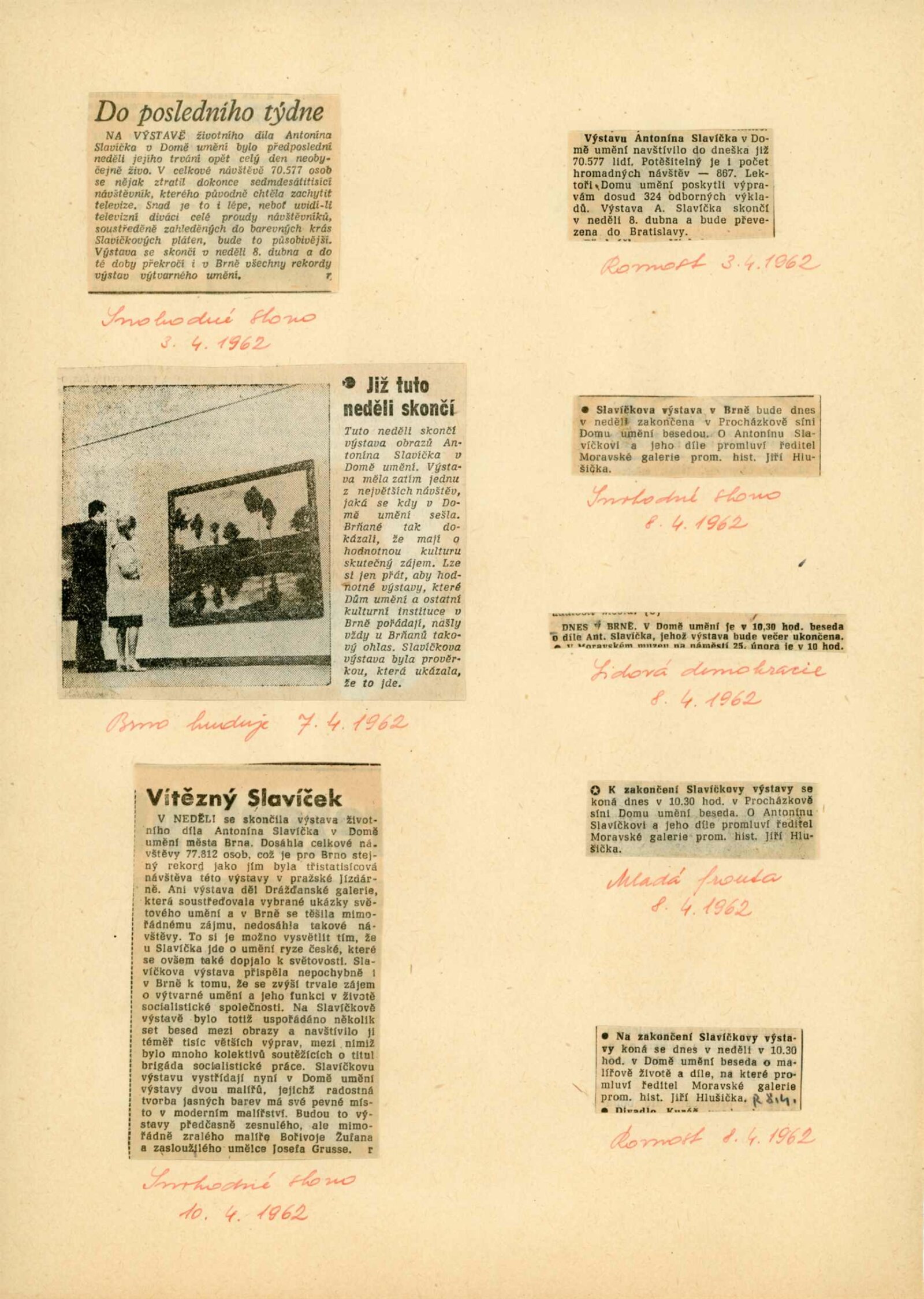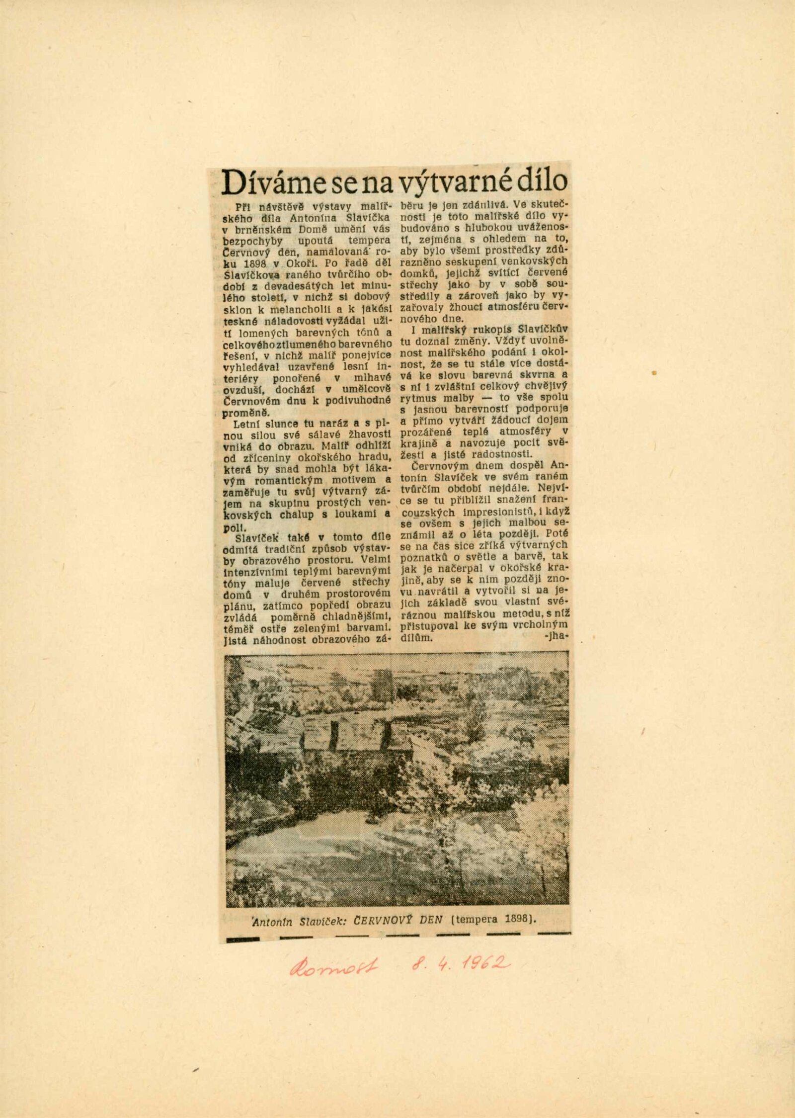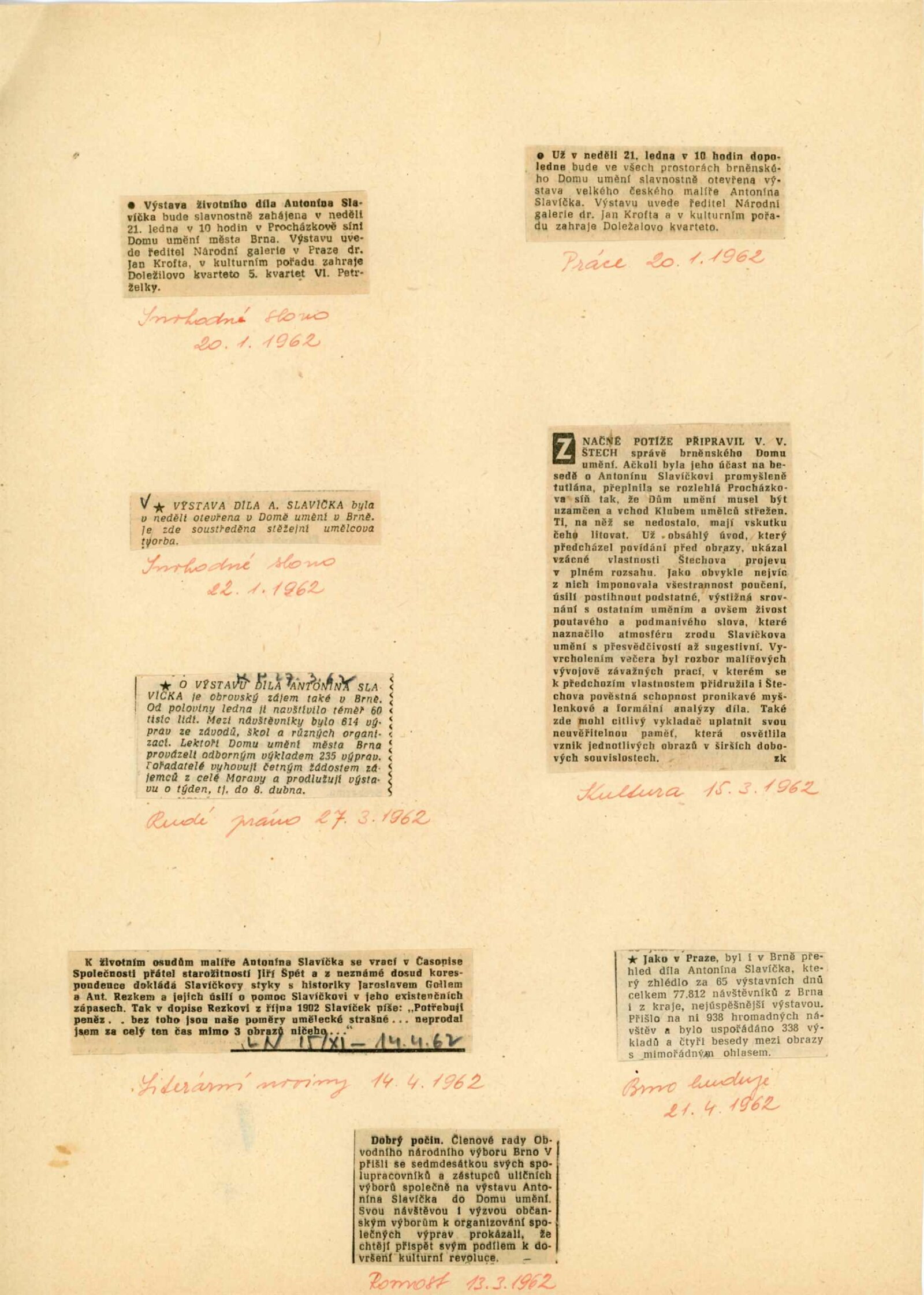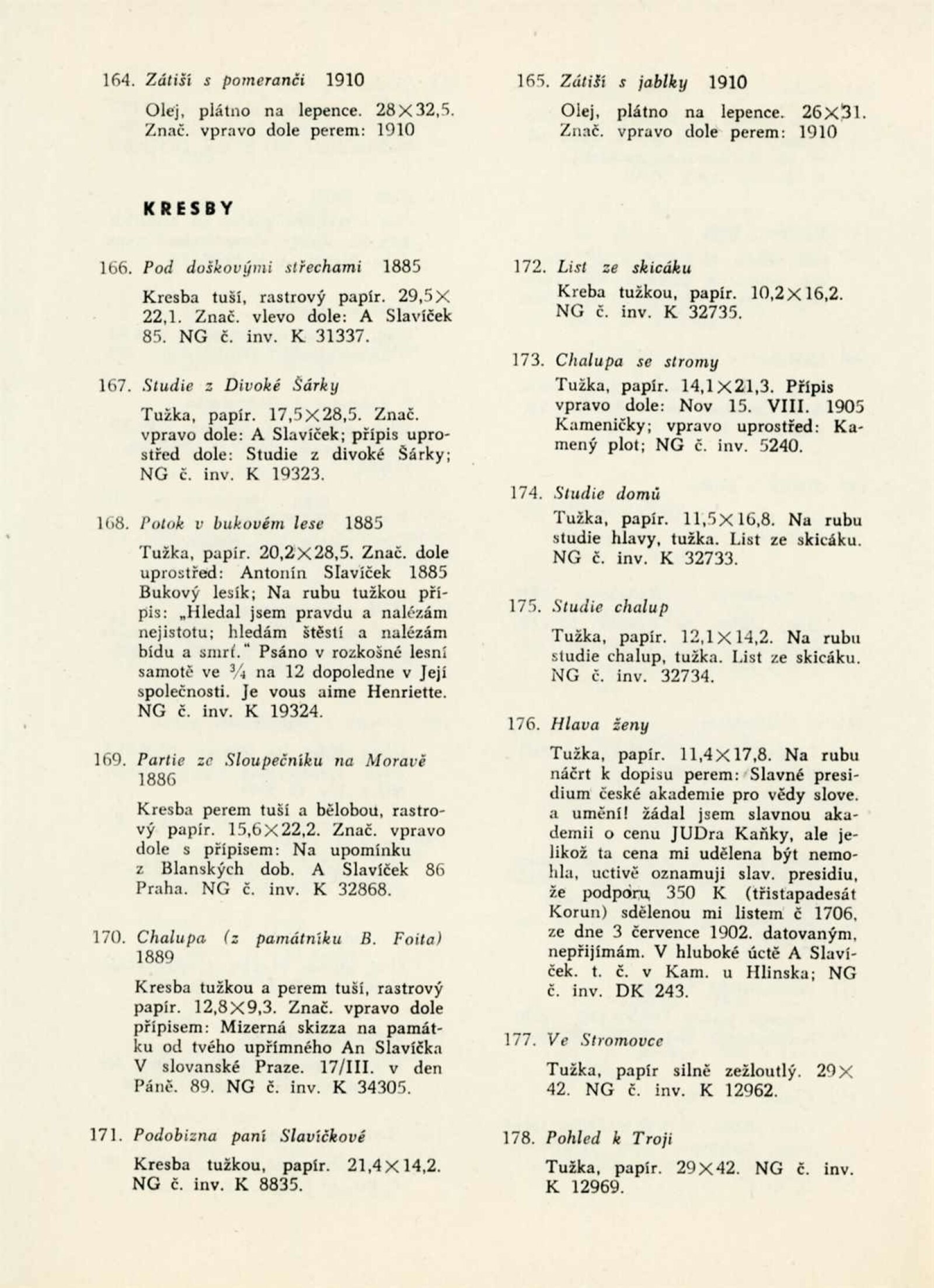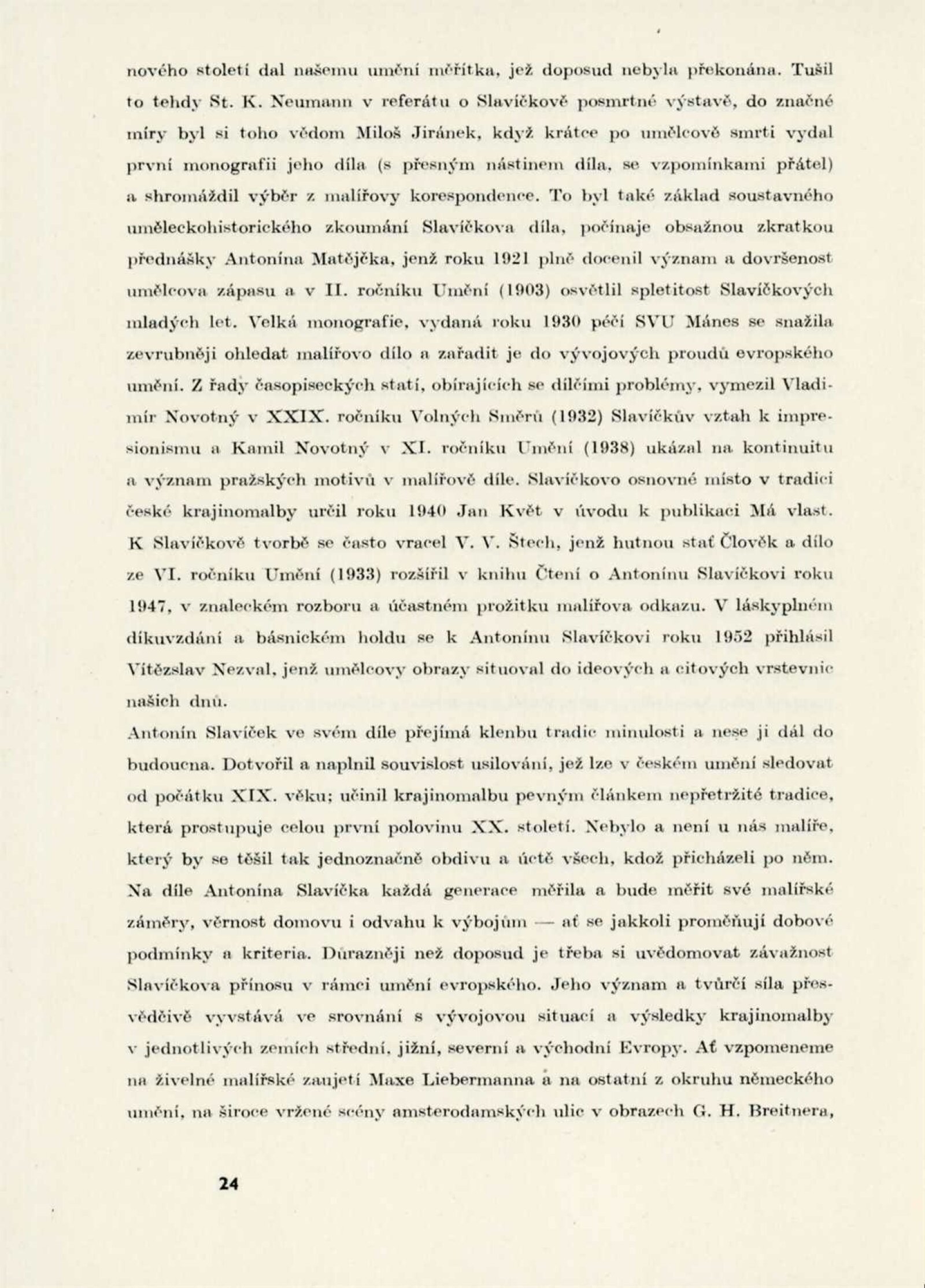Antonín Slavíček 1870–1910: Dům umění města Brna, 21. 1. – 1. 4. 1962 / Text: Jiří Kotalík. – Praha: Národní galerie, 1962. – 31 s., 16 s. obr. příl., seznam exponátů 11 s., portrét, životopis, DU 410. – MZK; MG; MMB