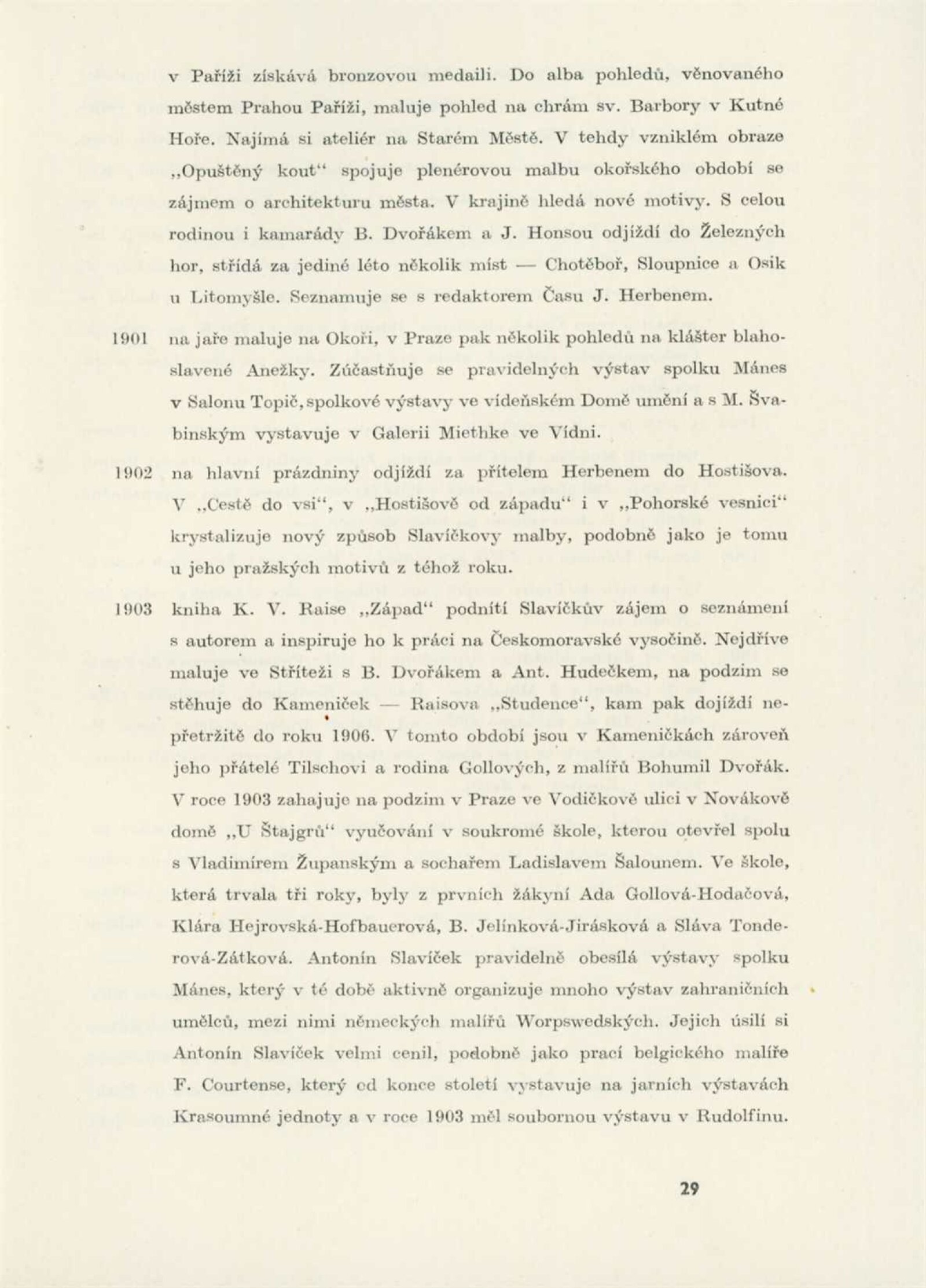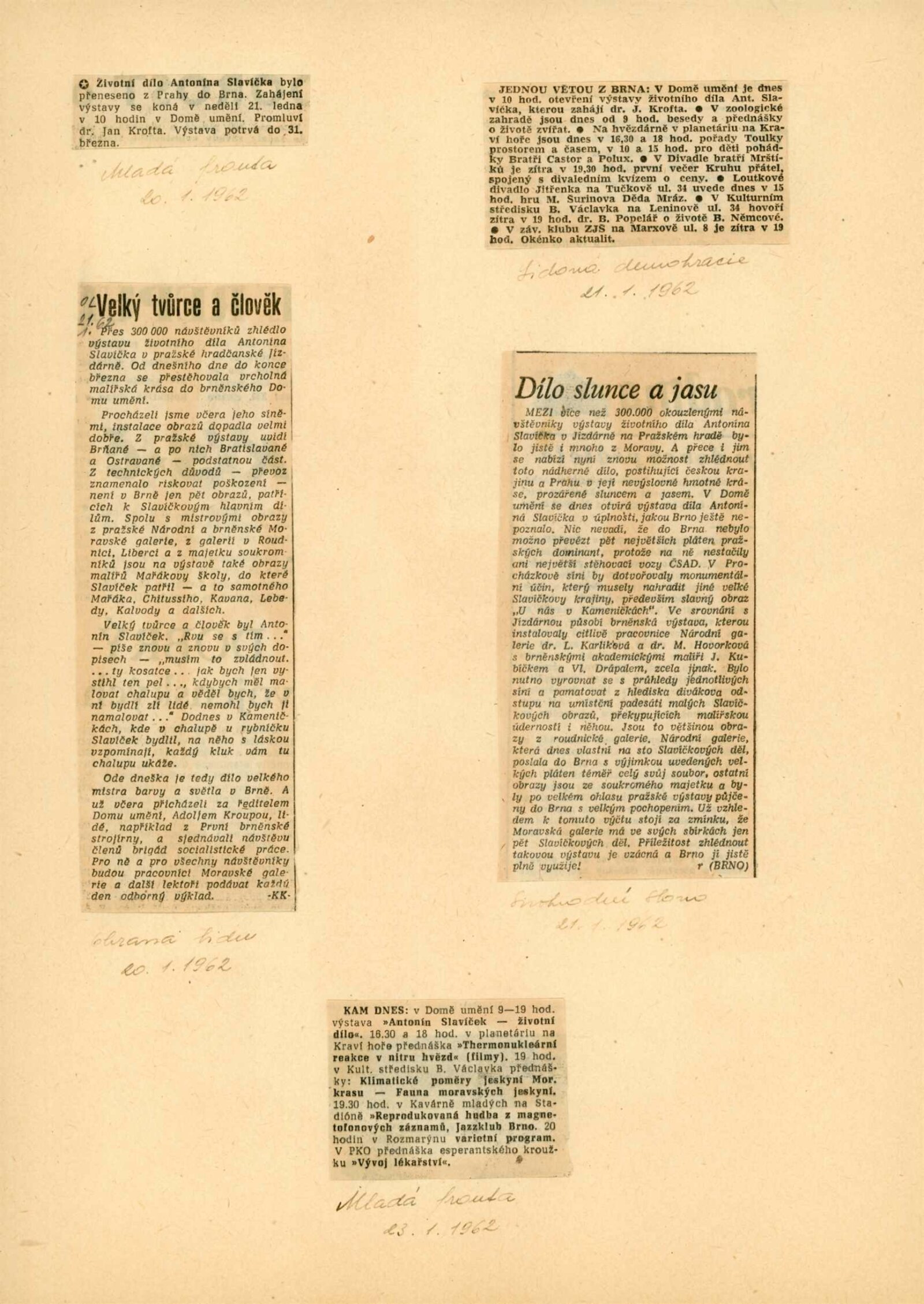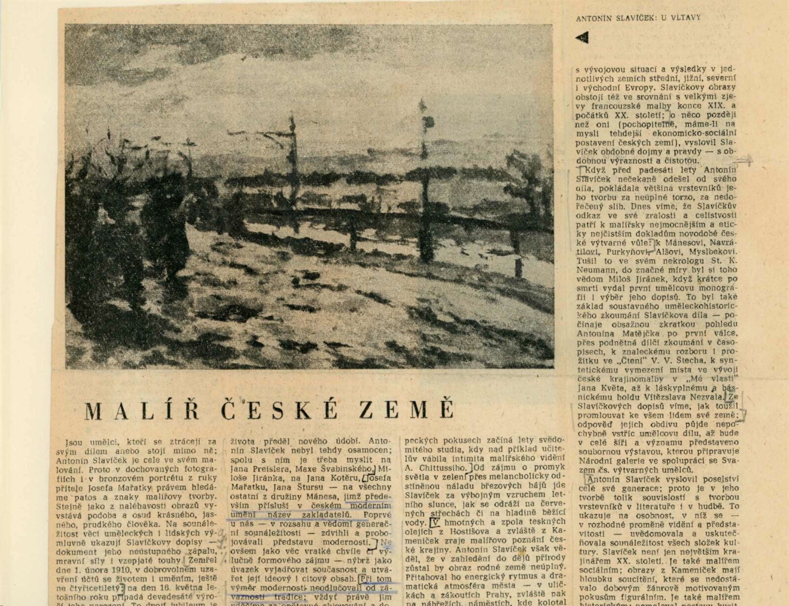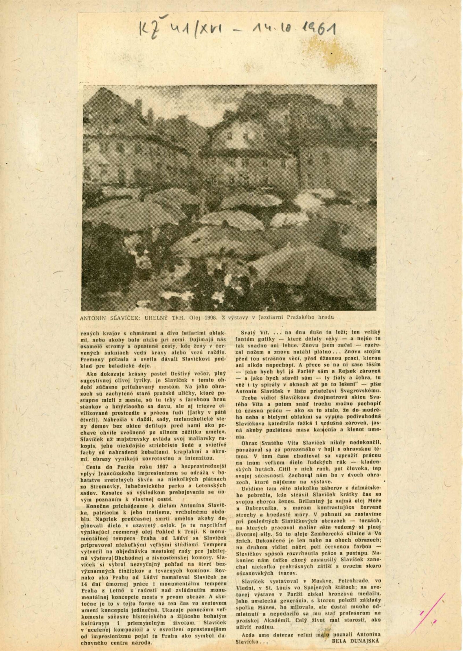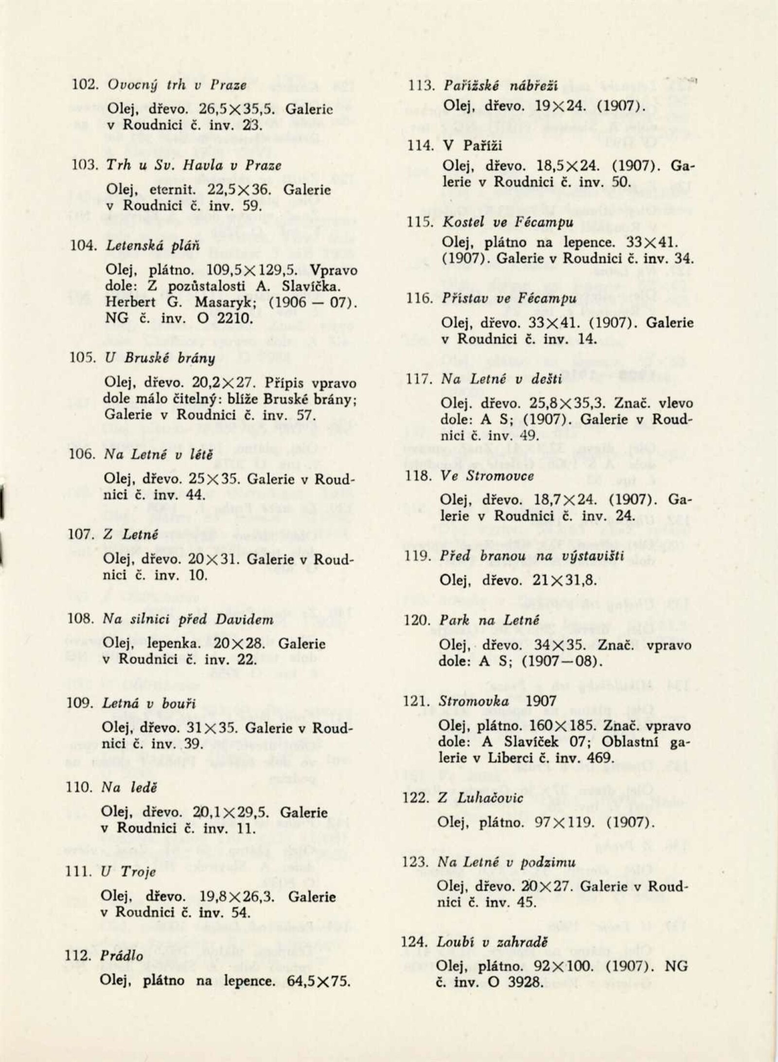 Antonín Slavíček 1870–1910: Dům umění města Brna, 21. 1. – 1. 4. 1962 / Text: Jiří Kotalík. – Praha: Národní galerie, 1962. – 31 s., 16 s. obr. příl., seznam exponátů 11 s., portrét, životopis, DU 410. – MZK; MG; MMB