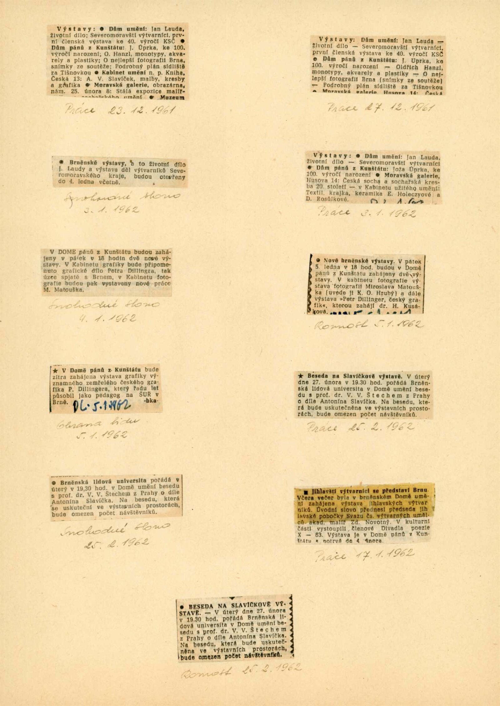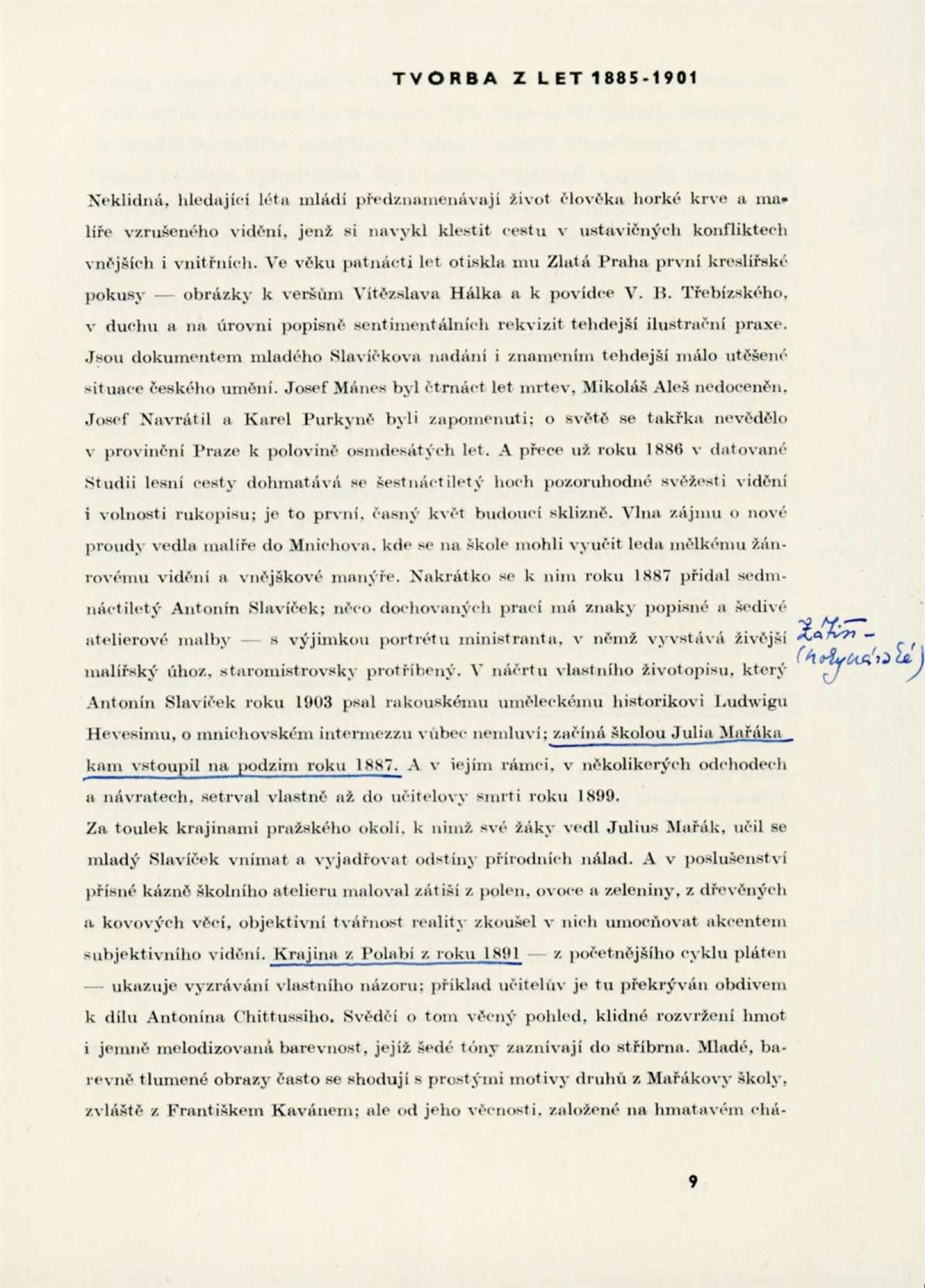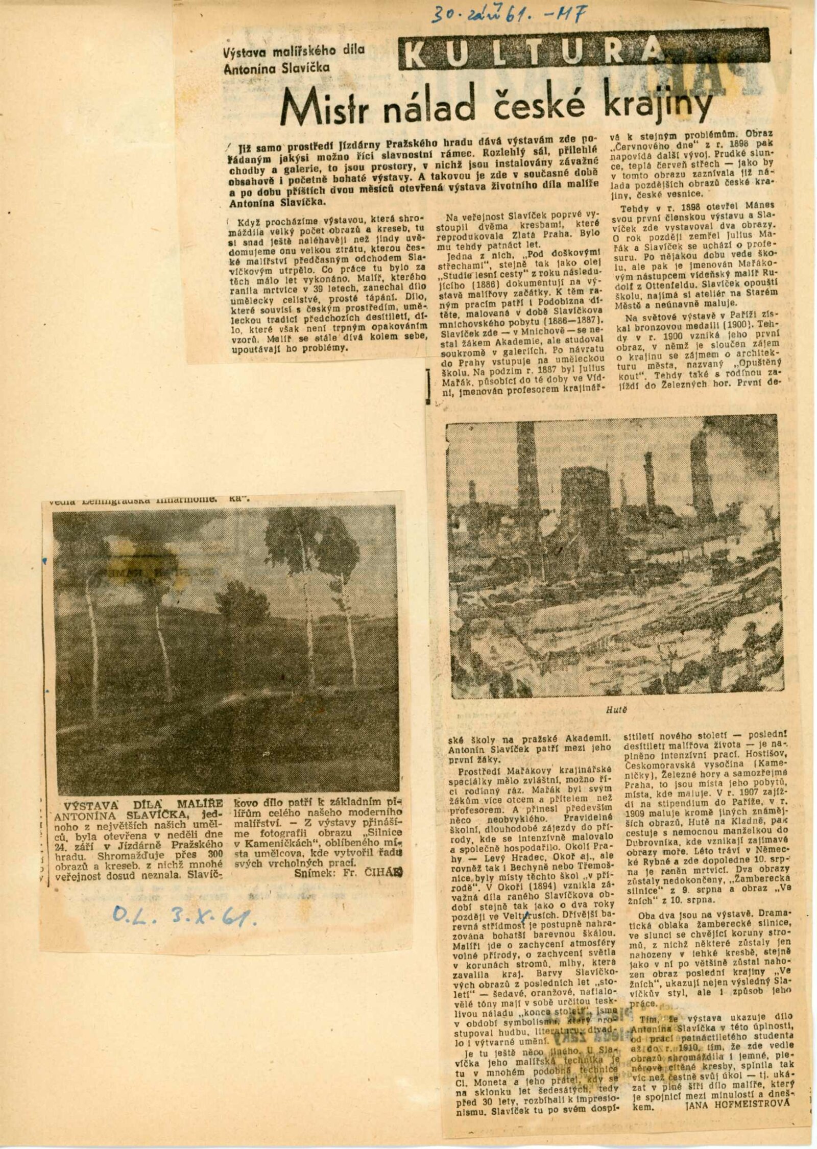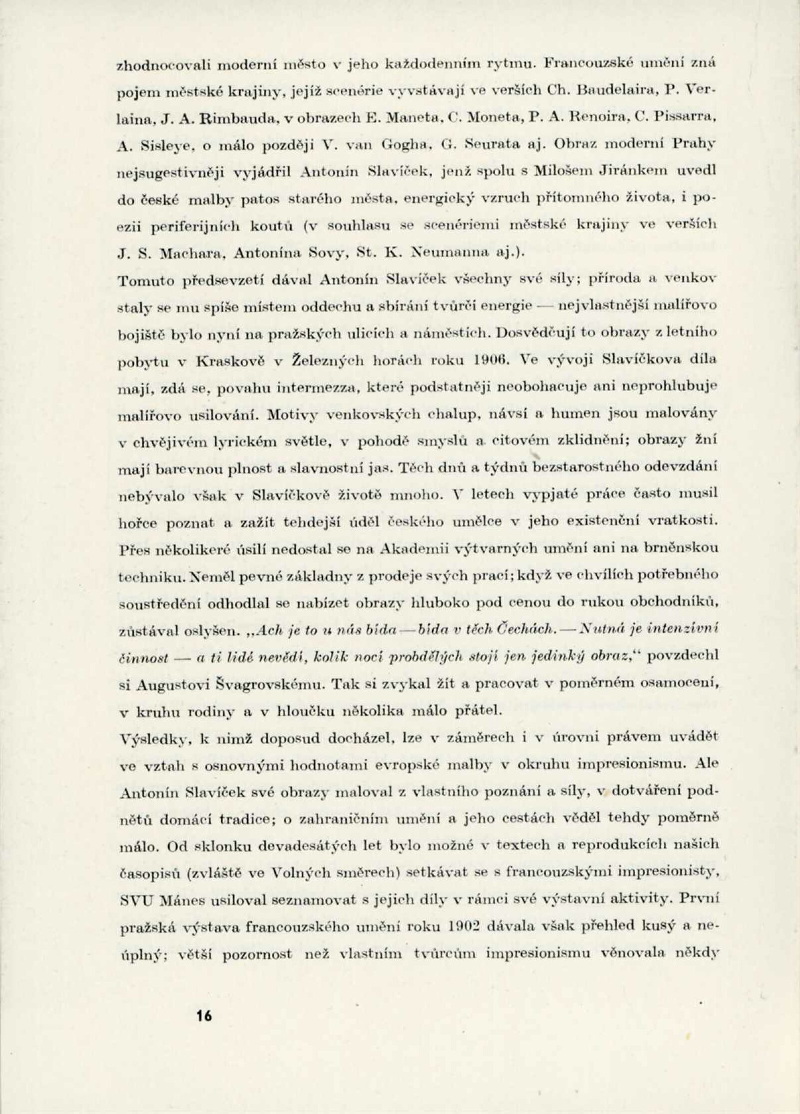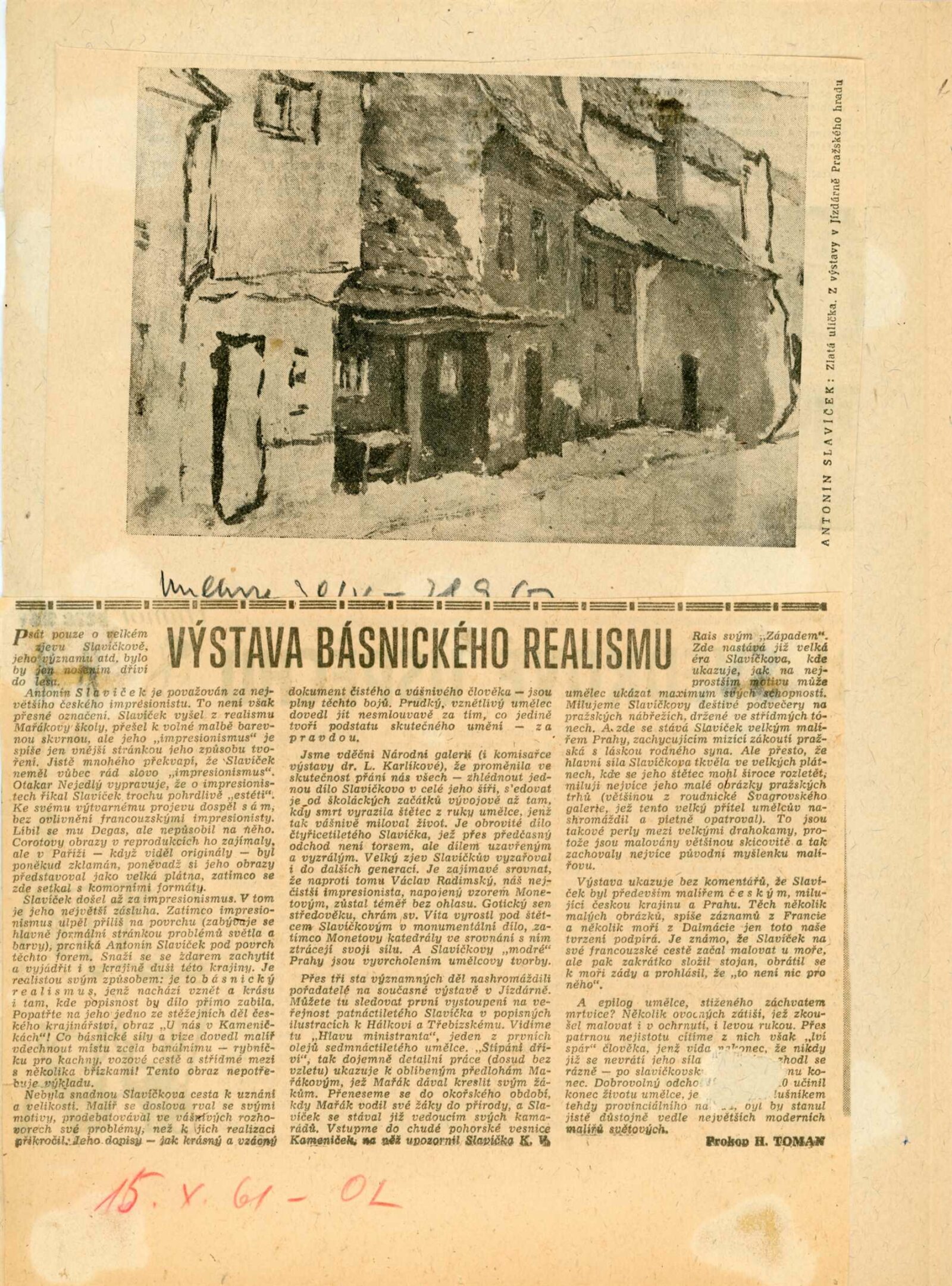 Antonín Slavíček 1870–1910: Dům umění města Brna, 21. 1. – 1. 4. 1962 / Text: Jiří Kotalík. – Praha: Národní galerie, 1962. – 31 s., 16 s. obr. příl., seznam exponátů 11 s., portrét, životopis, DU 410. – MZK; MG; MMB