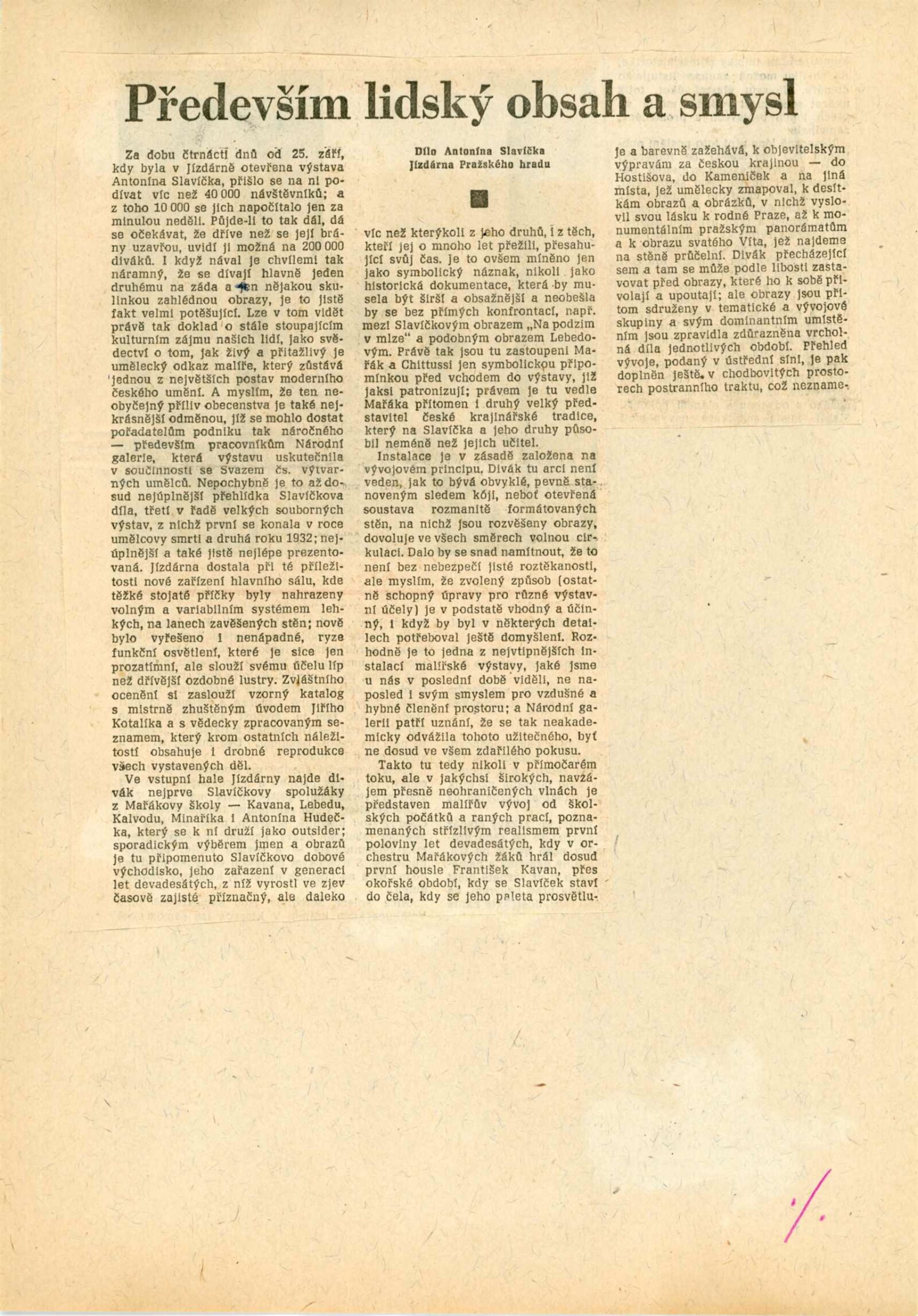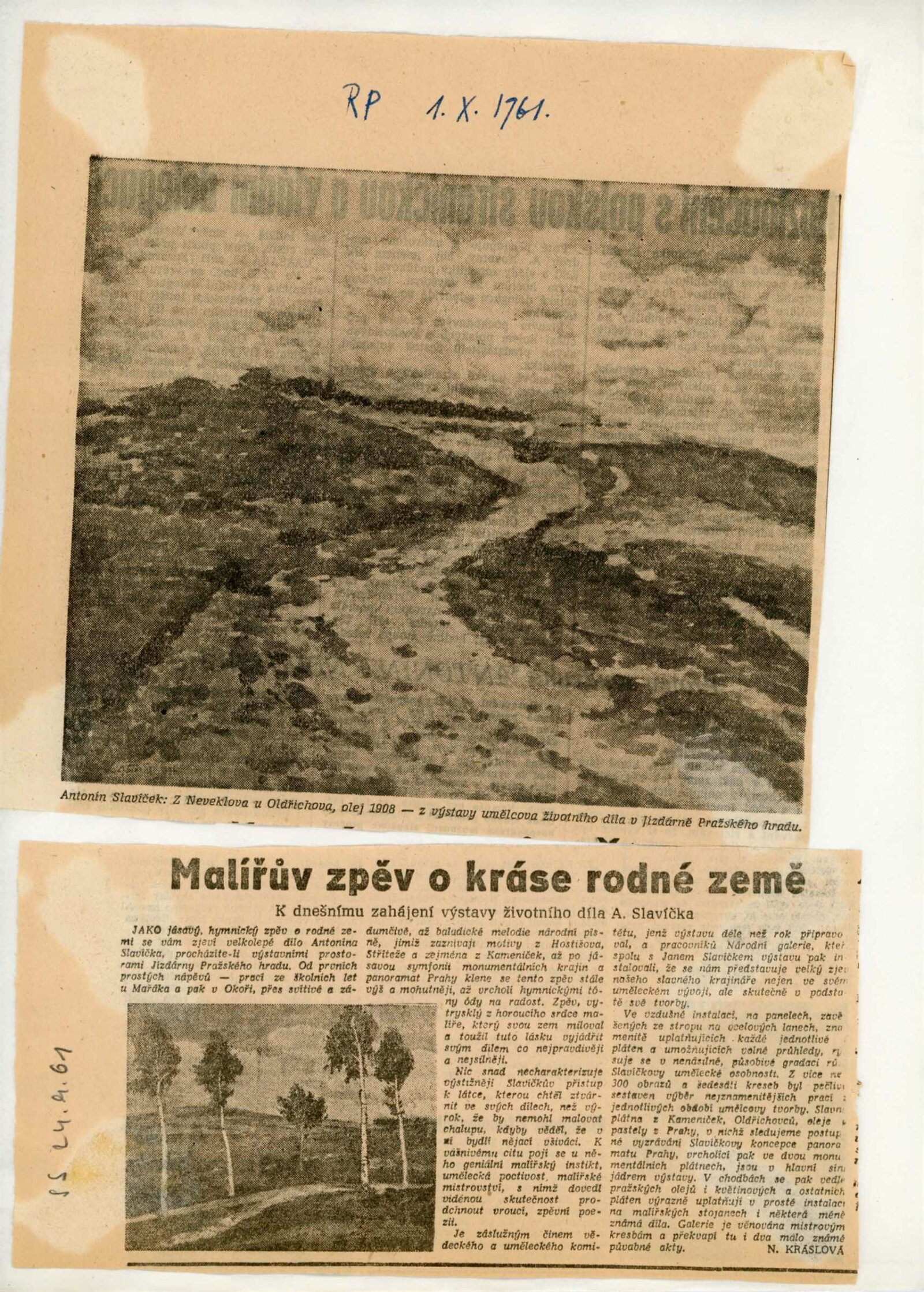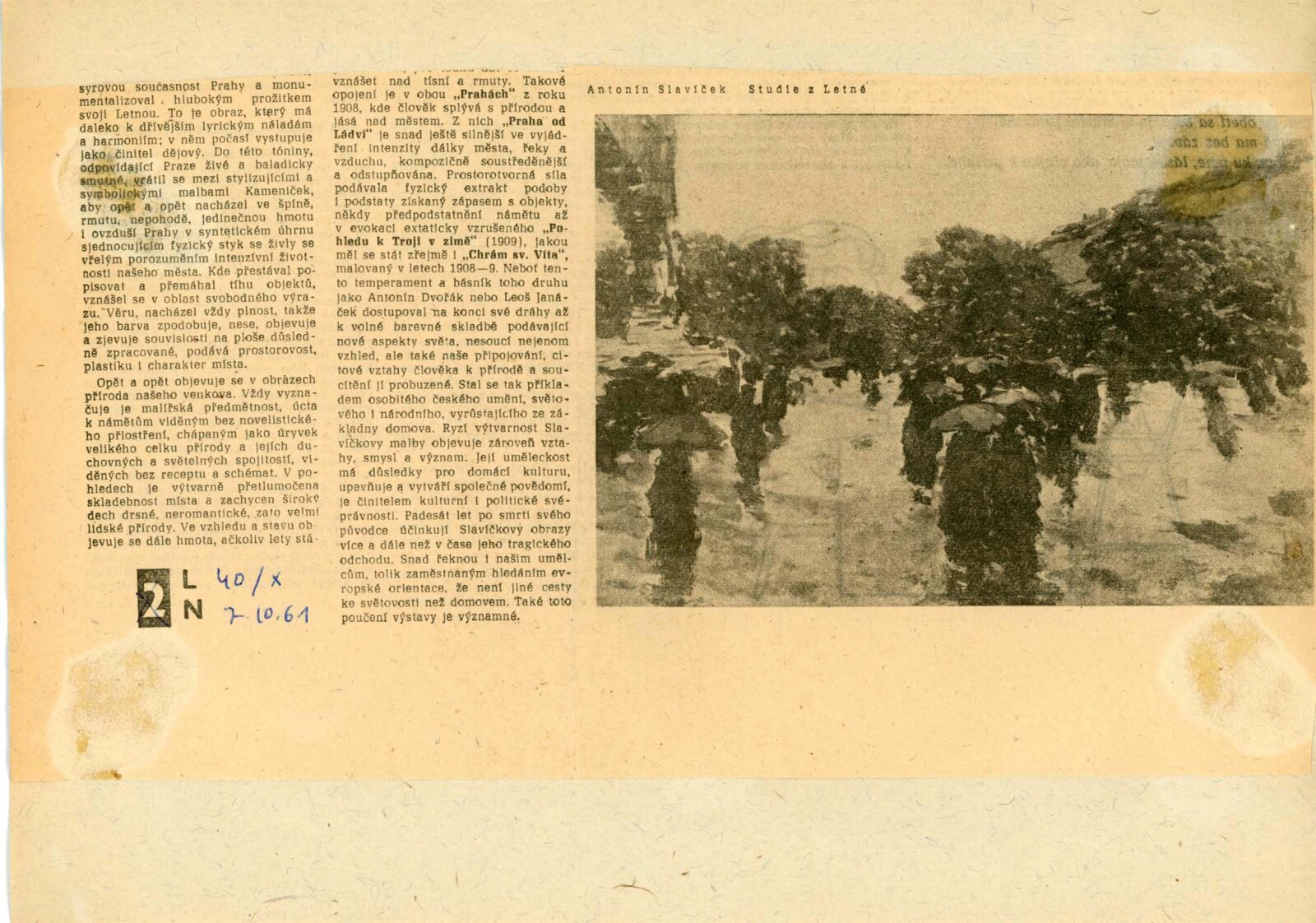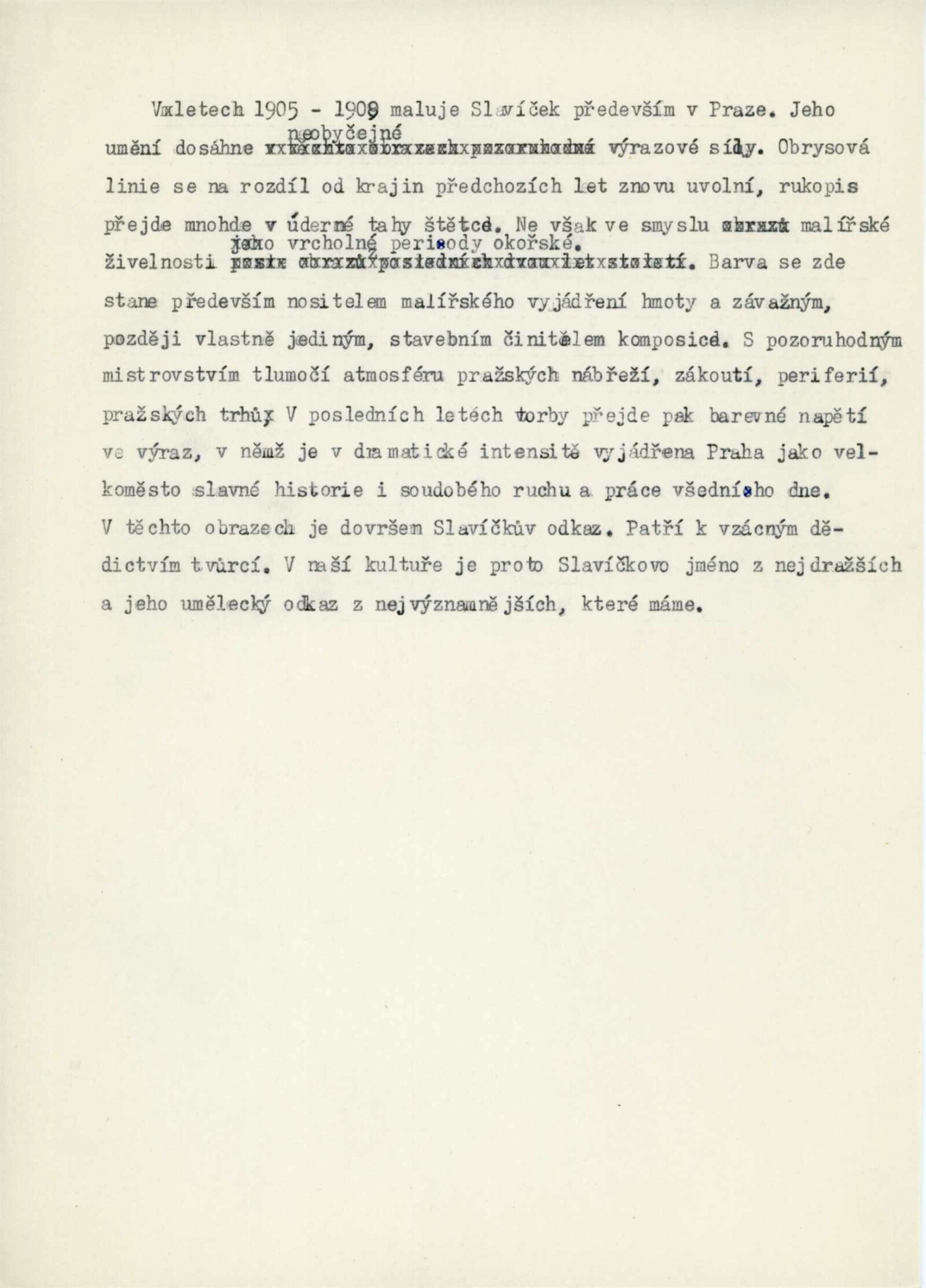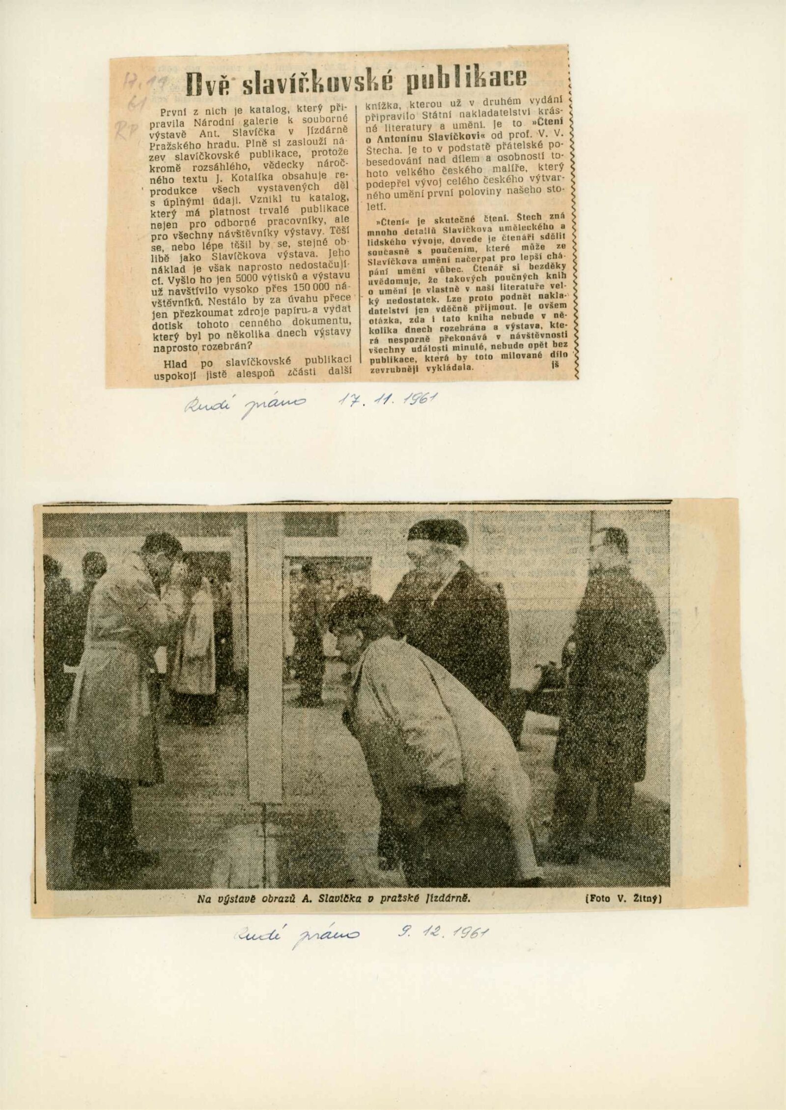 pozvánka, katalog + maketa katalogu, průvodní slovo (L. Karlíková + dopis, text Jiřího Kotalíka), seznamy prací, fotografie děl a z vernisáže, korespondence (o vytvoření kopií obrazů na výstavě, dopisy J. Slavíček a Adolfa Kroupy, o převzetí výstavy z Jízdárny NG do Brna, potvrzení dohody o výstavě, provozní korespondence, telegram V. V. Štecha), objednávky přípravných prací pro výstavu u ČFVU, přehled oslovených soukromých majitelů děl a institucí, žádosti o výklad pro skupiny, recenze v tisku, katalogy (SNG, NG a dotisk pro DU)