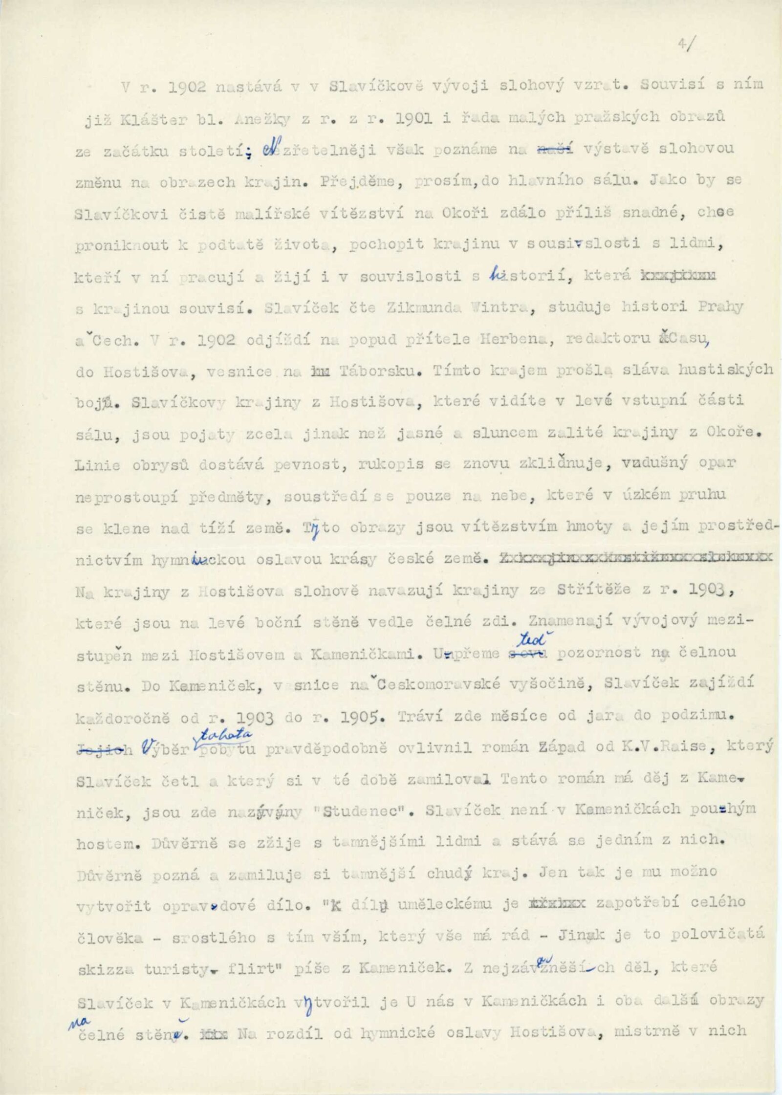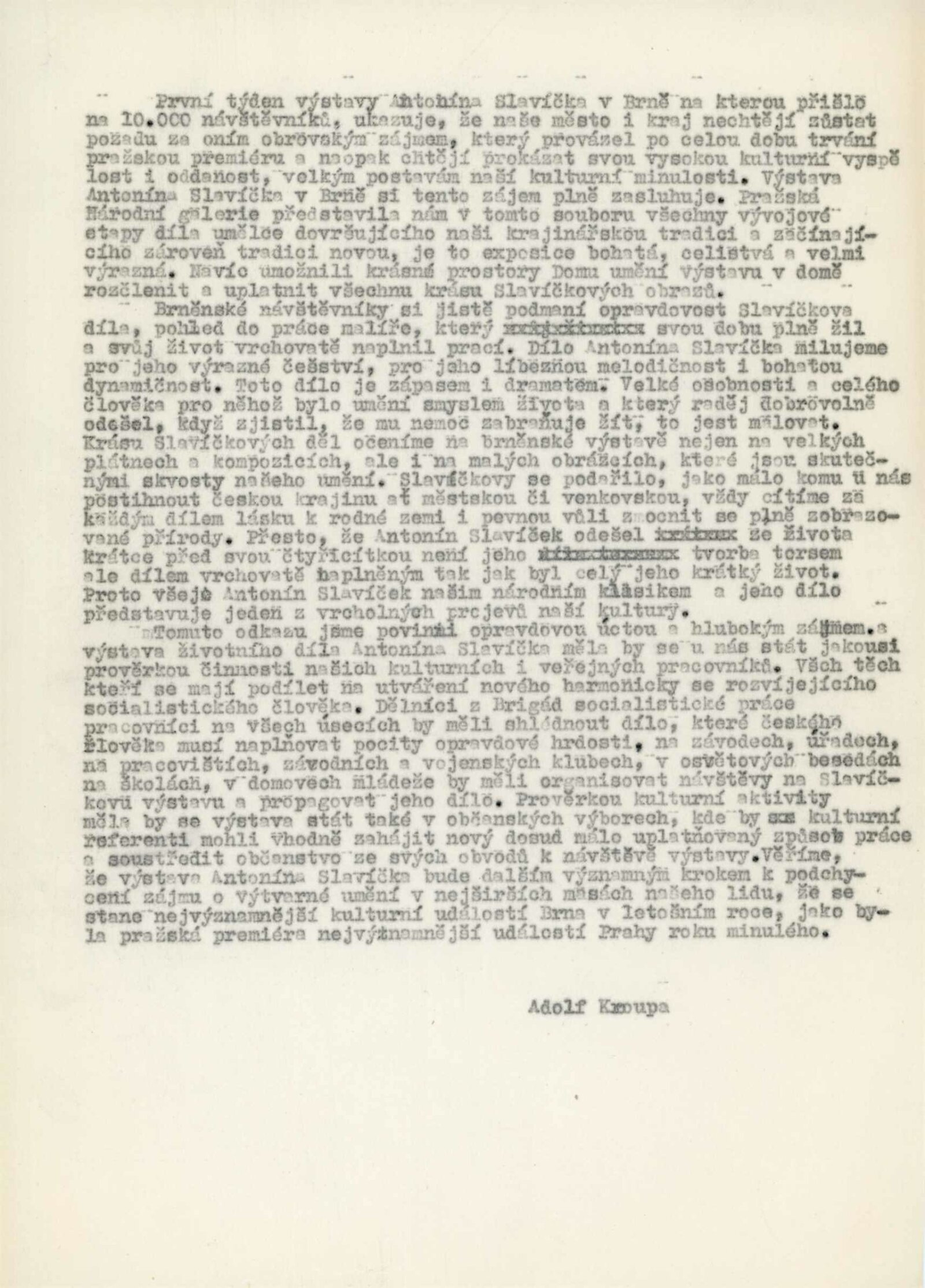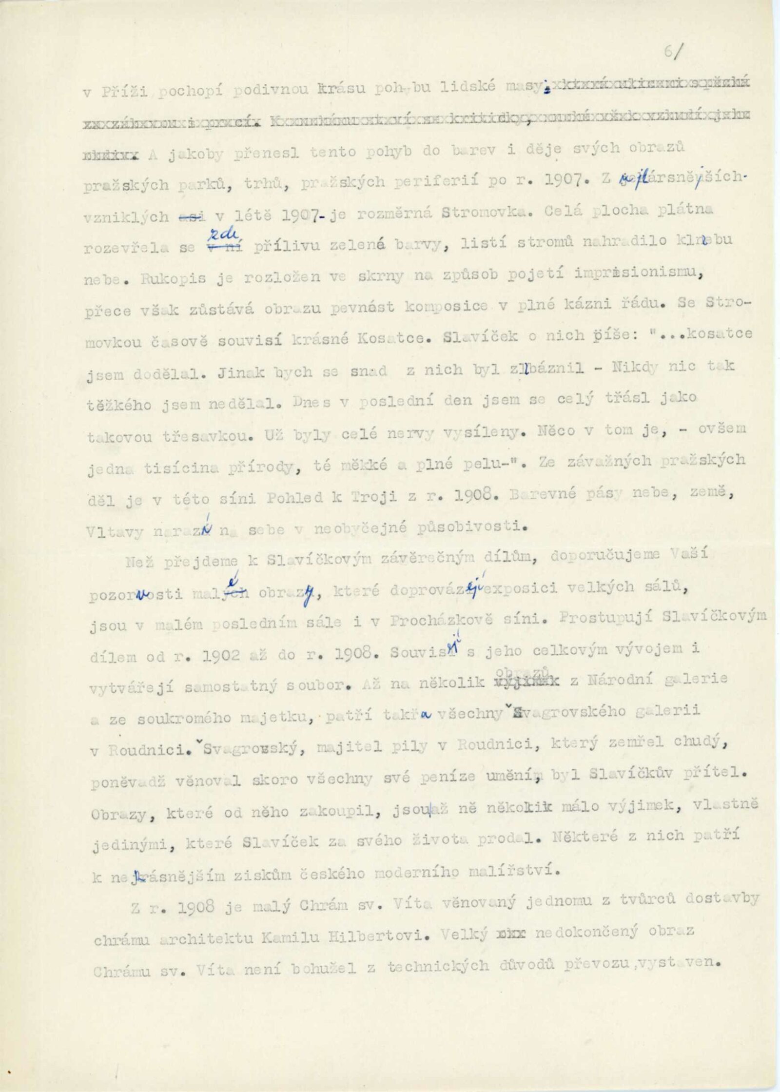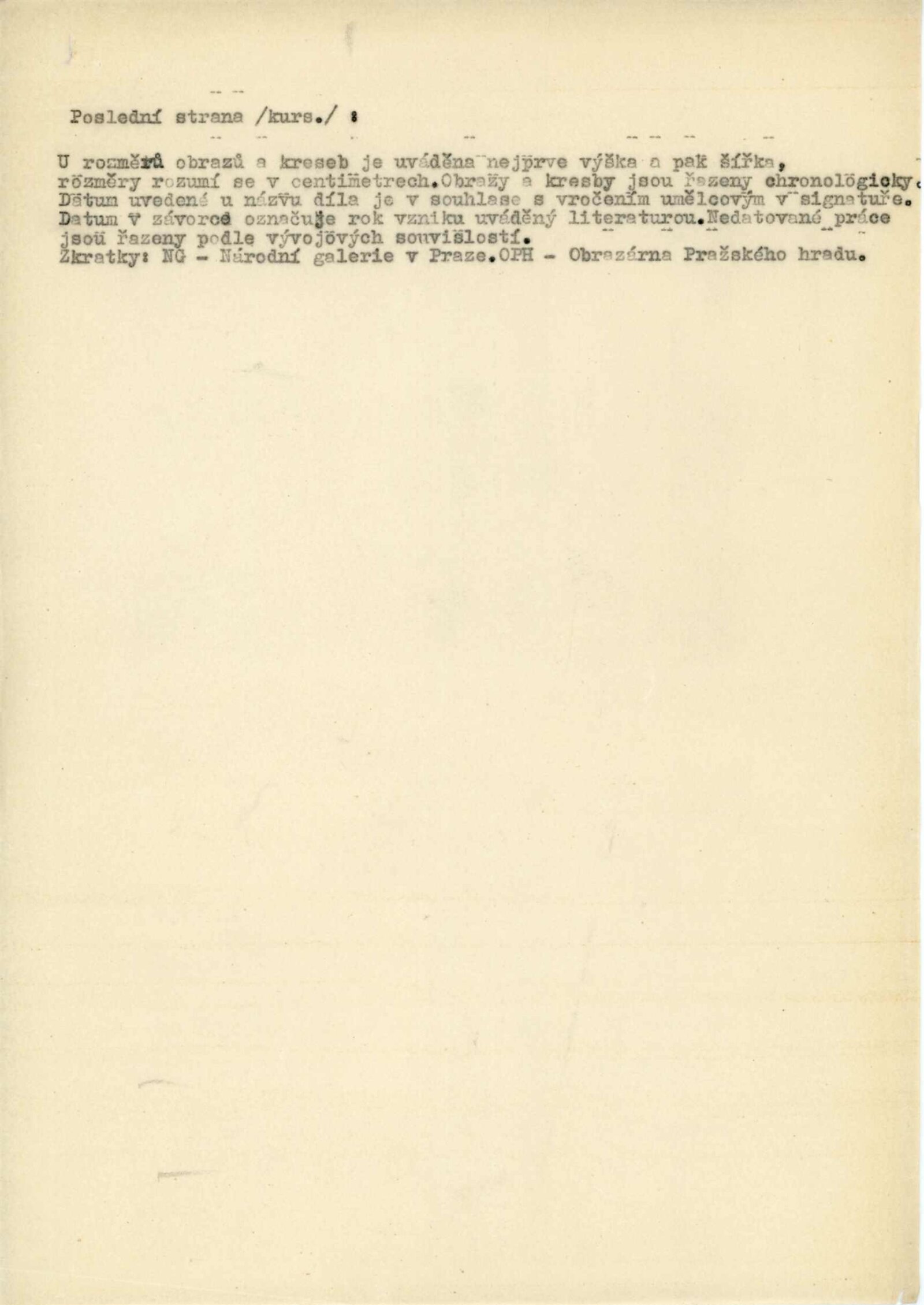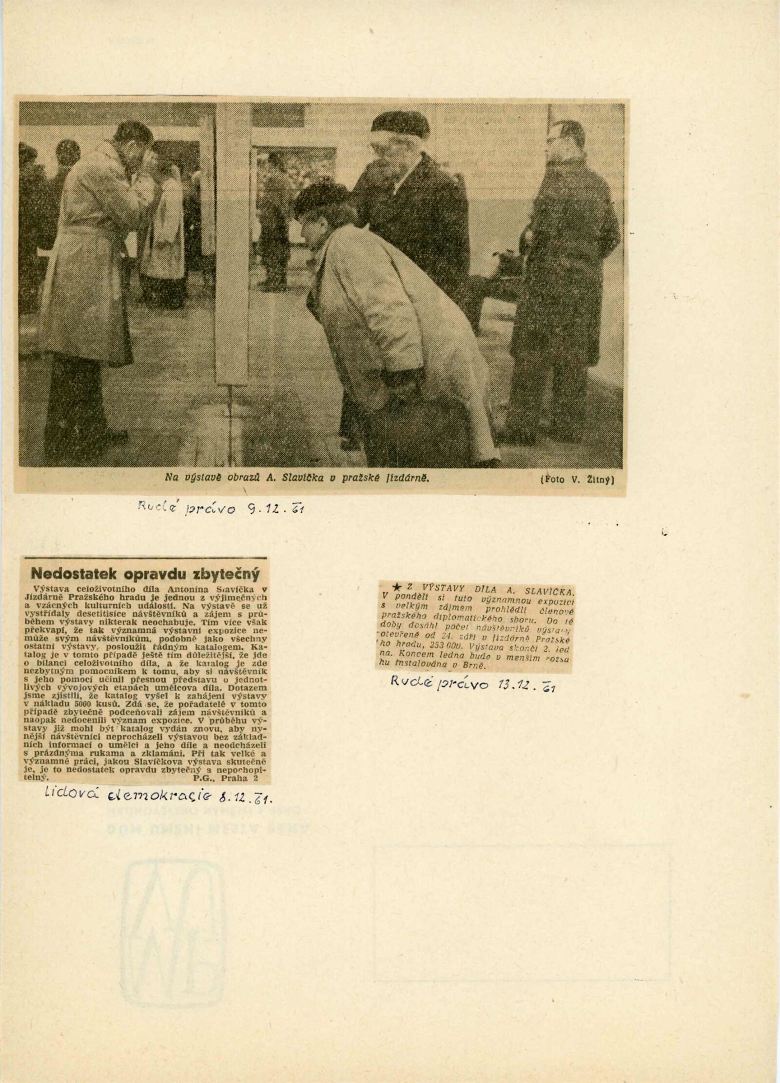 pozvánka, katalog + maketa katalogu, průvodní slovo (L. Karlíková + dopis, text Jiřího Kotalíka), seznamy prací, fotografie děl a z vernisáže, korespondence (o vytvoření kopií obrazů na výstavě, dopisy J. Slavíček a Adolfa Kroupy, o převzetí výstavy z Jízdárny NG do Brna, potvrzení dohody o výstavě, provozní korespondence, telegram V. V. Štecha), objednávky přípravných prací pro výstavu u ČFVU, přehled oslovených soukromých majitelů děl a institucí, žádosti o výklad pro skupiny, recenze v tisku, katalogy (SNG, NG a dotisk pro DU)