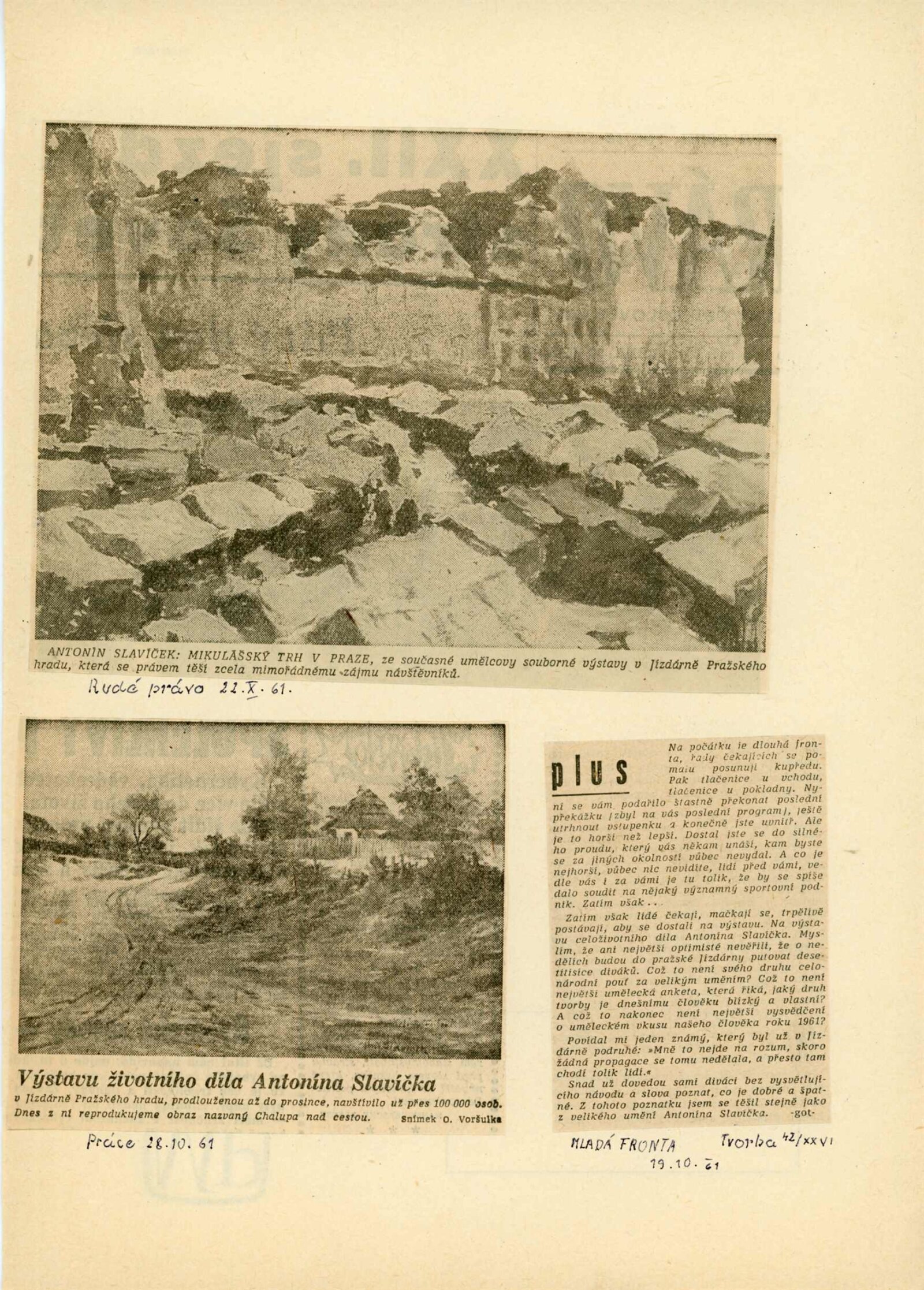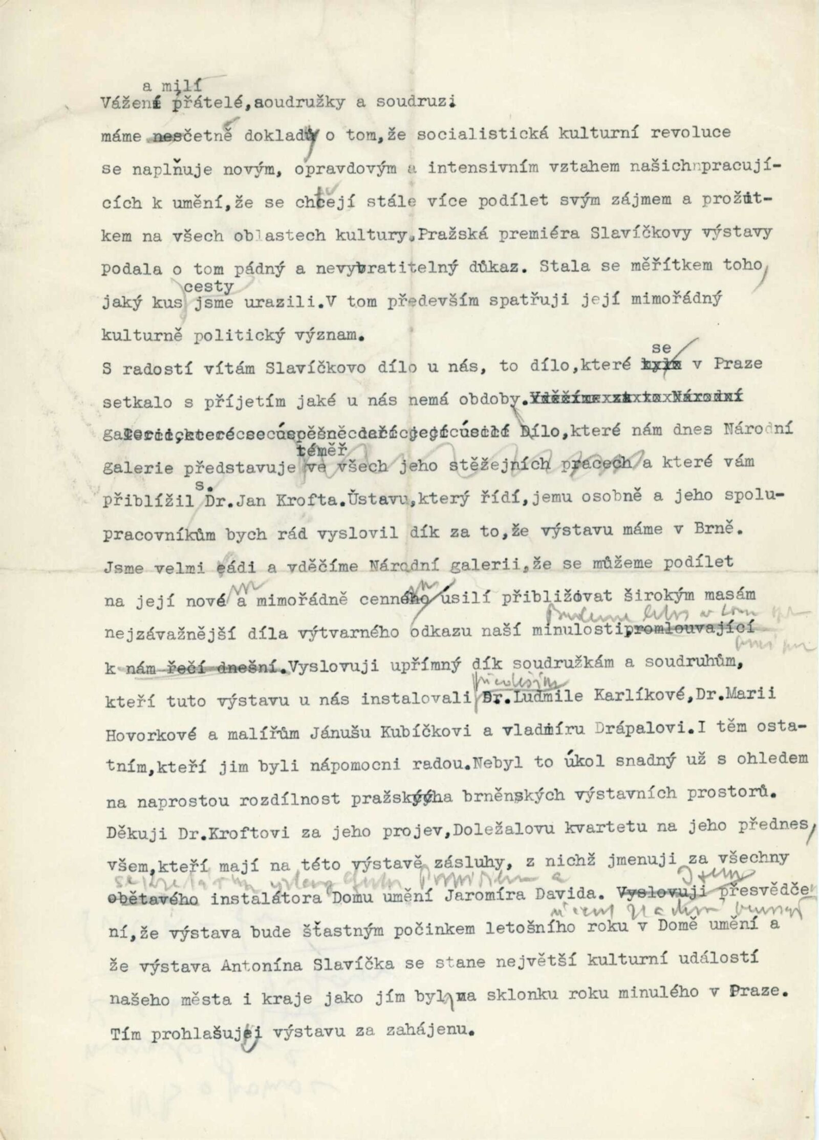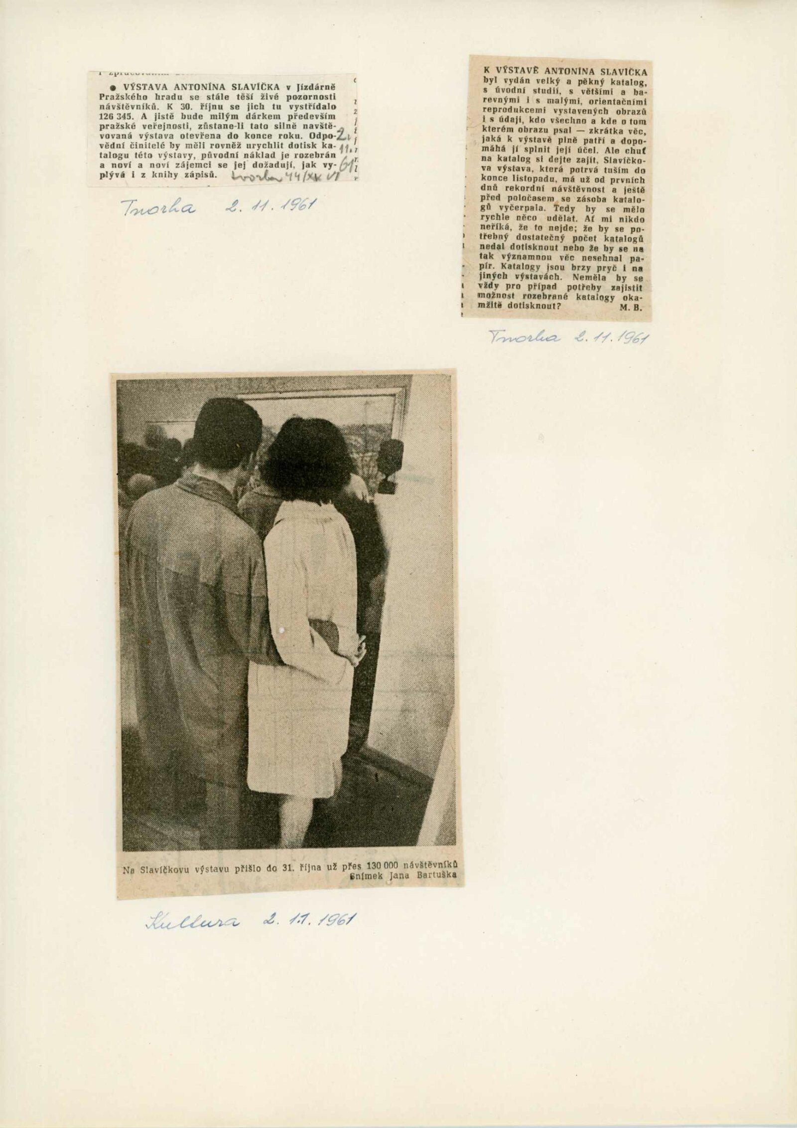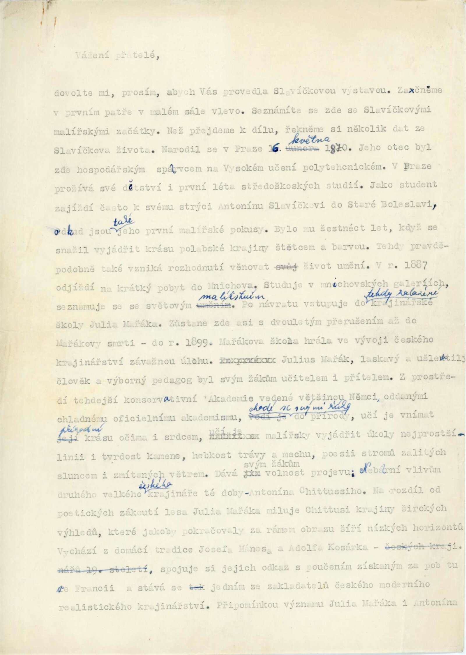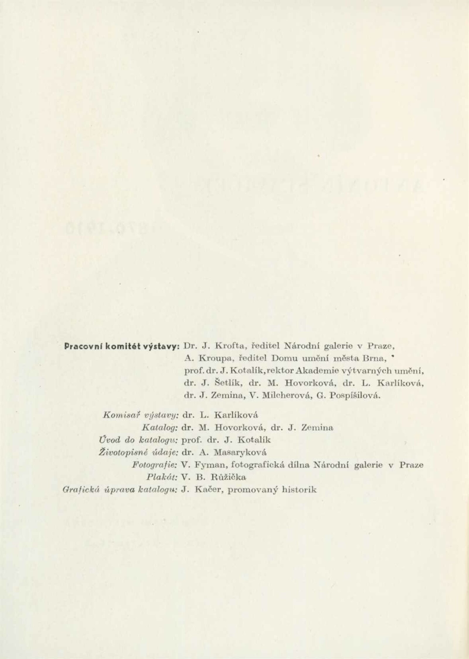 pozvánka, katalog + maketa katalogu, průvodní slovo (L. Karlíková + dopis, text Jiřího Kotalíka), seznamy prací, fotografie děl a z vernisáže, korespondence (o vytvoření kopií obrazů na výstavě, dopisy J. Slavíček a Adolfa Kroupy, o převzetí výstavy z Jízdárny NG do Brna, potvrzení dohody o výstavě, provozní korespondence, telegram V. V. Štecha), objednávky přípravných prací pro výstavu u ČFVU, přehled oslovených soukromých majitelů děl a institucí, žádosti o výklad pro skupiny, recenze v tisku, katalogy (SNG, NG a dotisk pro DU)