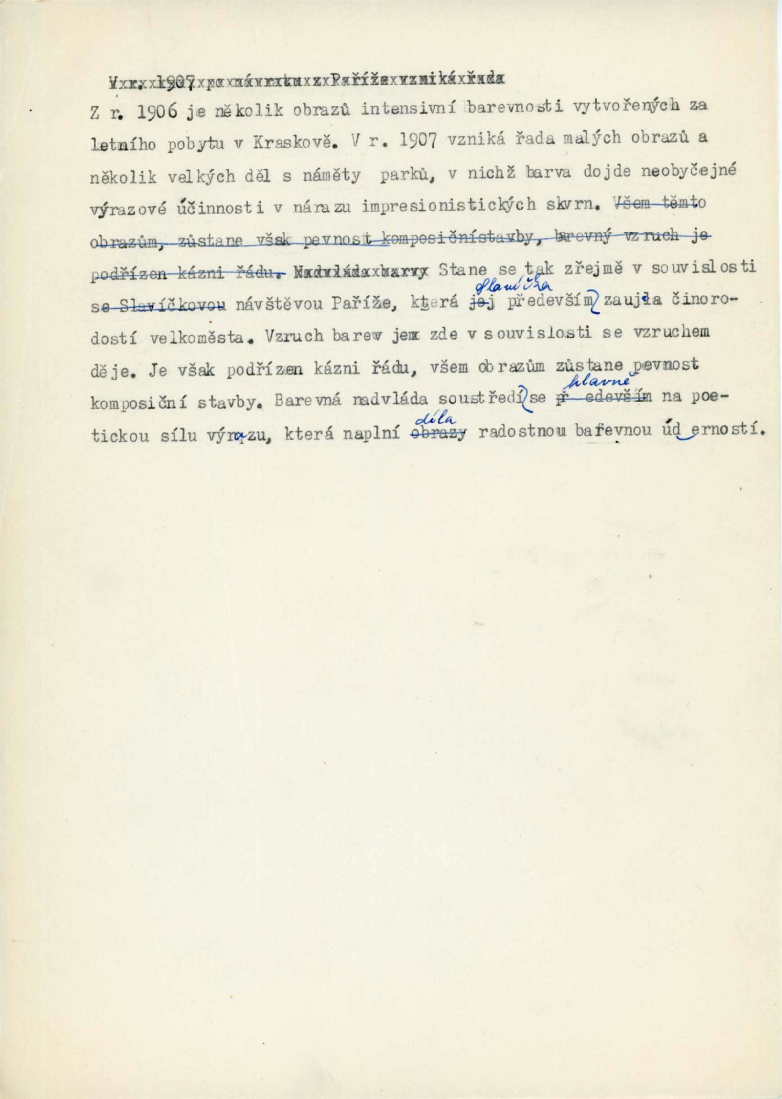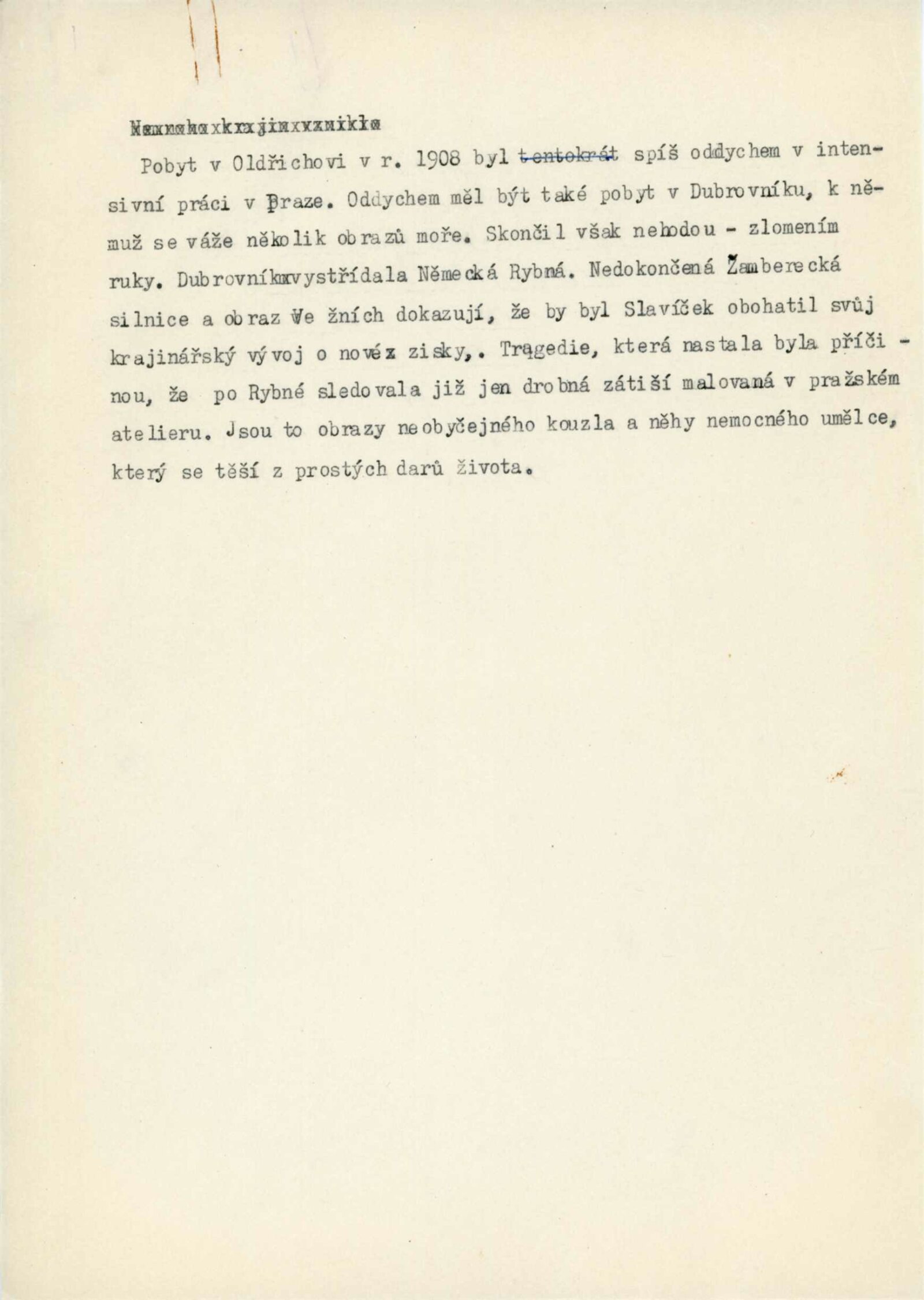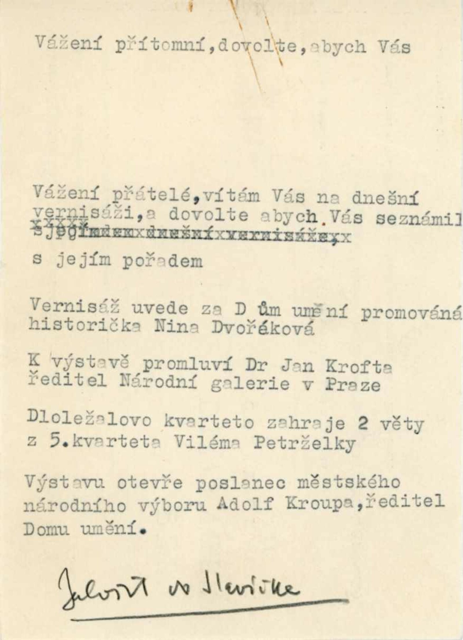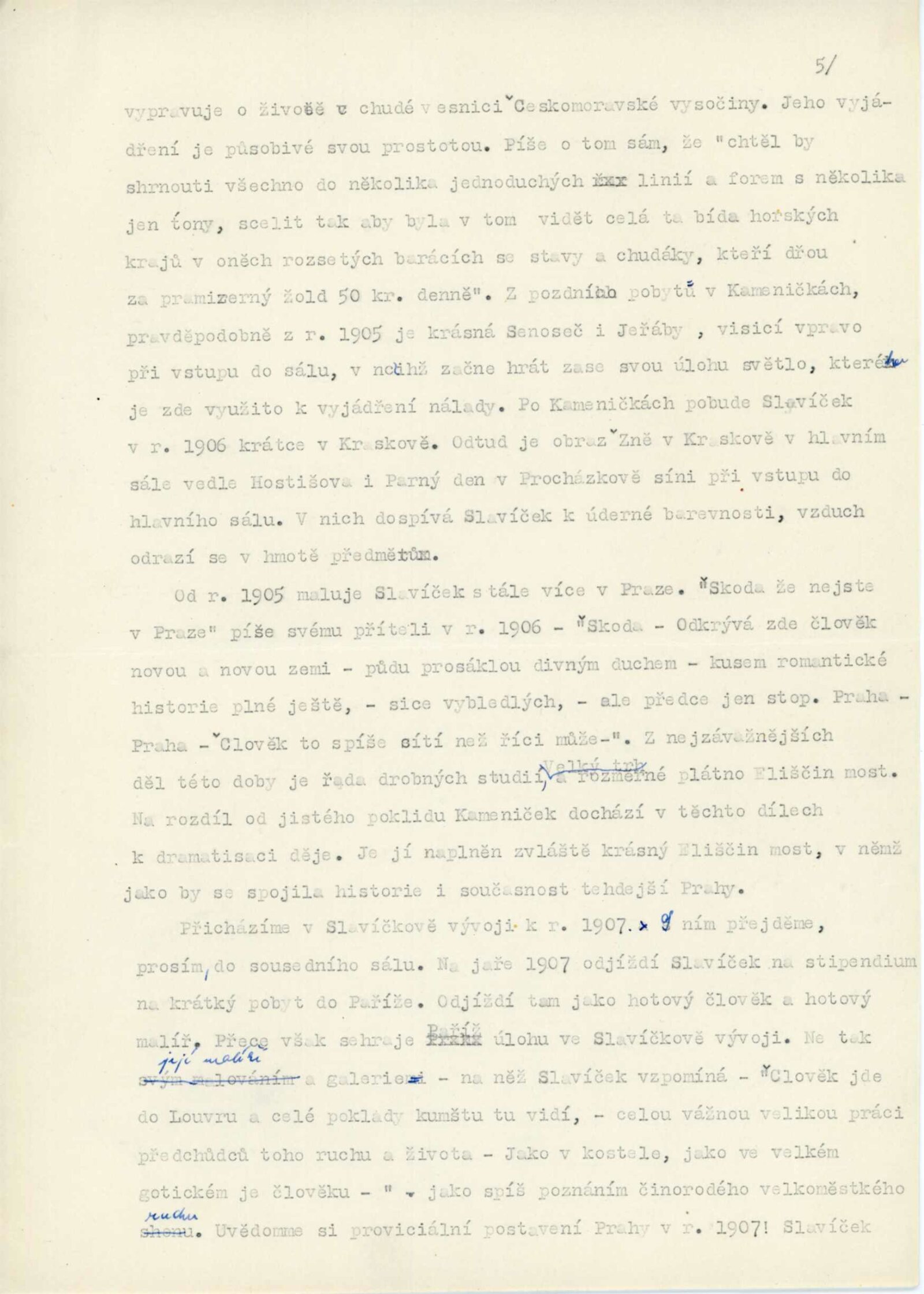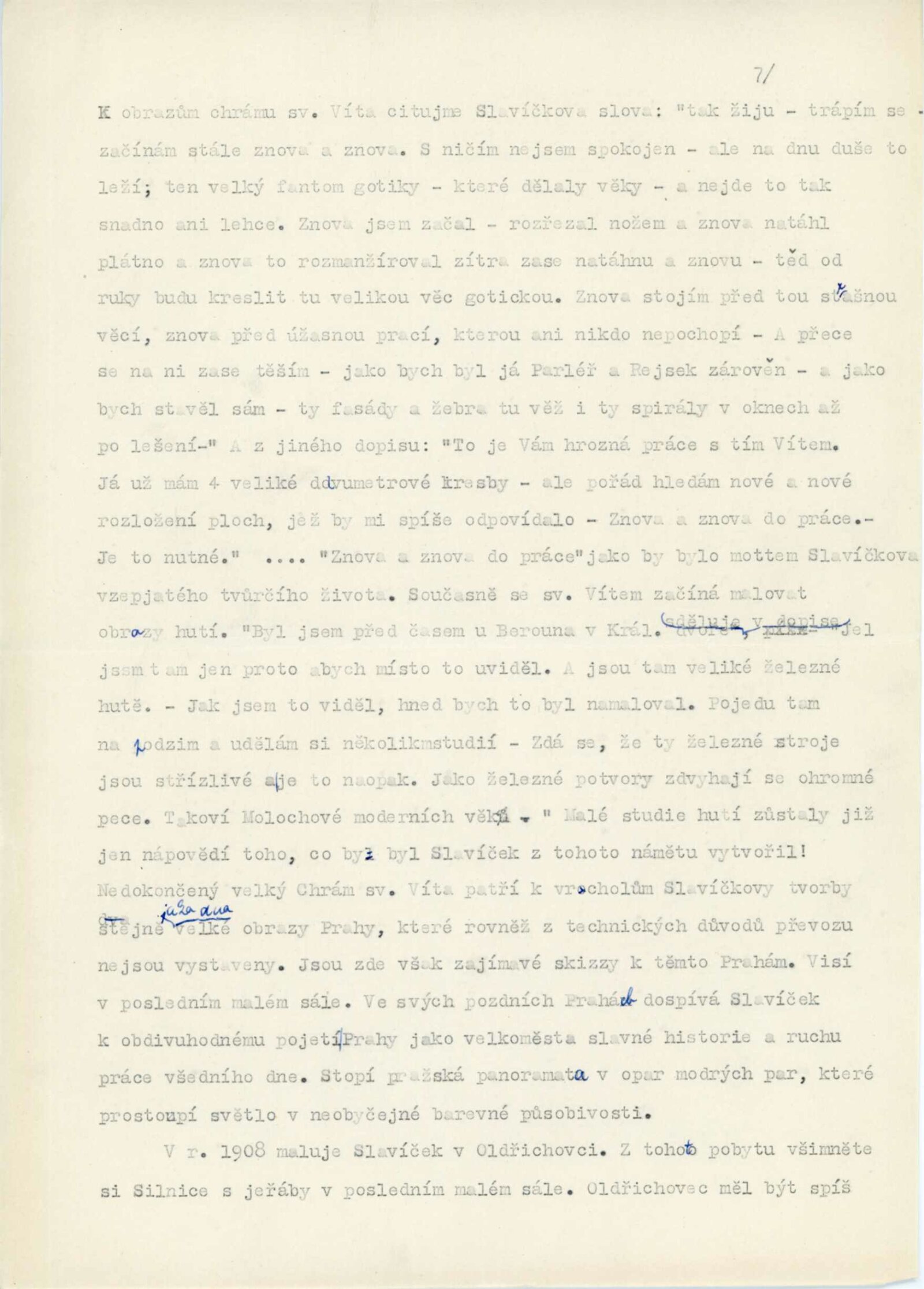 pozvánka, katalog + maketa katalogu, průvodní slovo (L. Karlíková + dopis, text Jiřího Kotalíka), seznamy prací, fotografie děl a z vernisáže, korespondence (o vytvoření kopií obrazů na výstavě, dopisy J. Slavíček a Adolfa Kroupy, o převzetí výstavy z Jízdárny NG do Brna, potvrzení dohody o výstavě, provozní korespondence, telegram V. V. Štecha), objednávky přípravných prací pro výstavu u ČFVU, přehled oslovených soukromých majitelů děl a institucí, žádosti o výklad pro skupiny, recenze v tisku, katalogy (SNG, NG a dotisk pro DU)