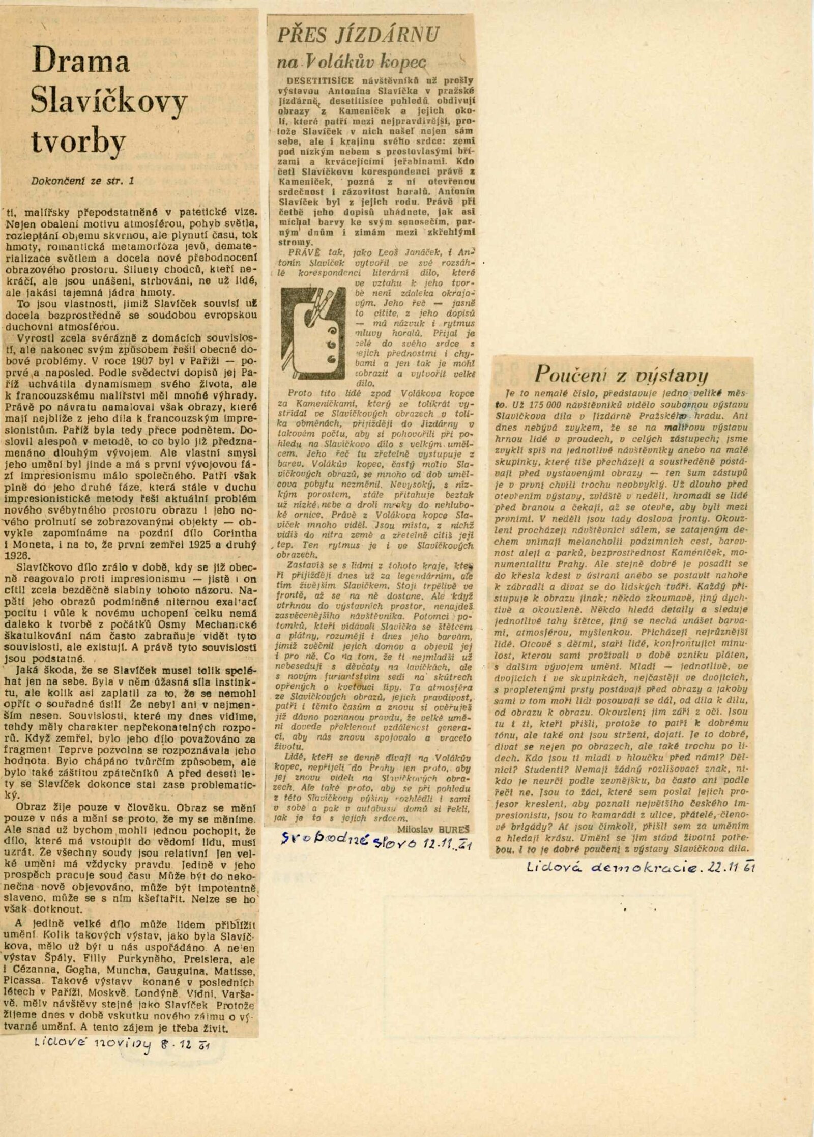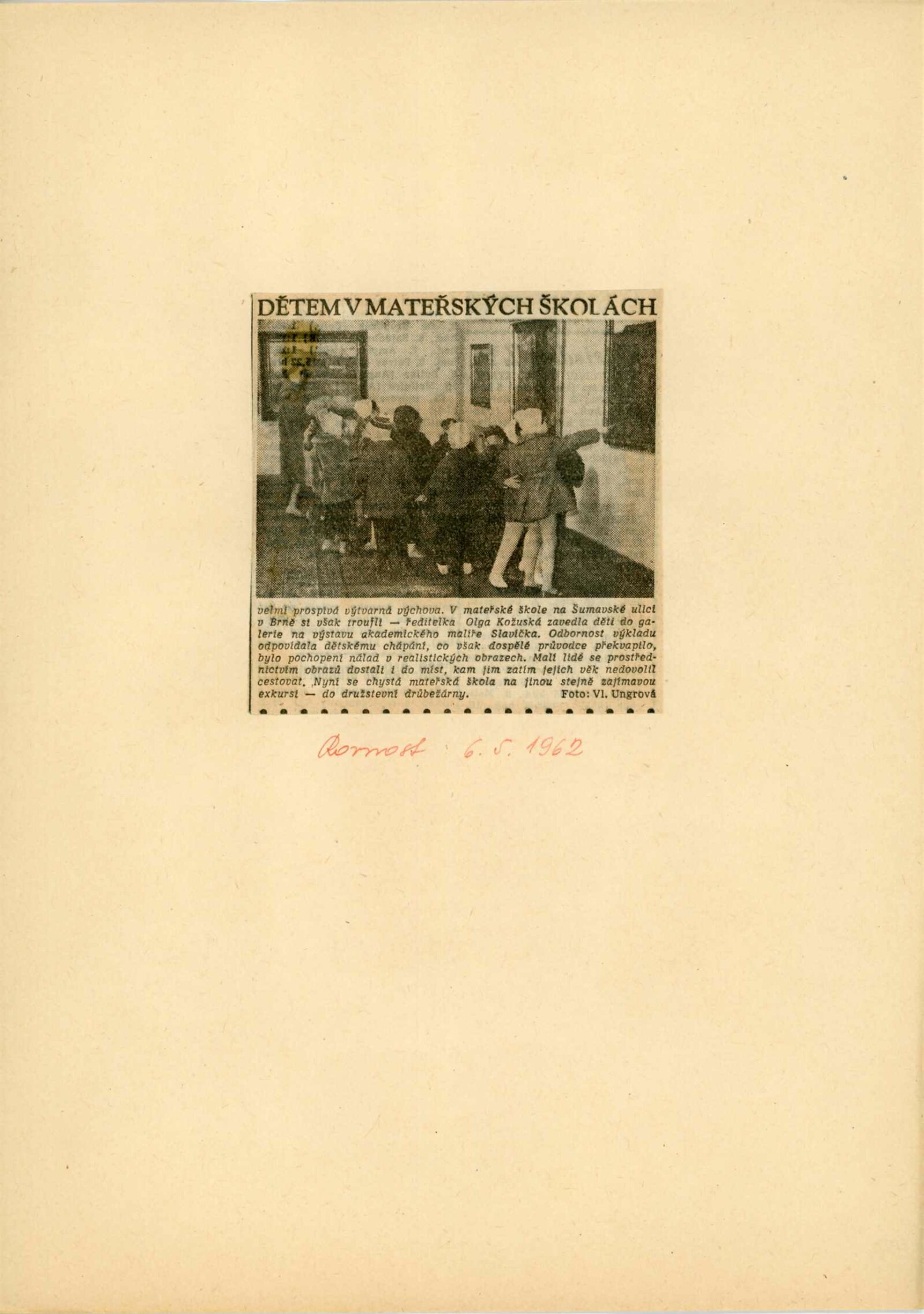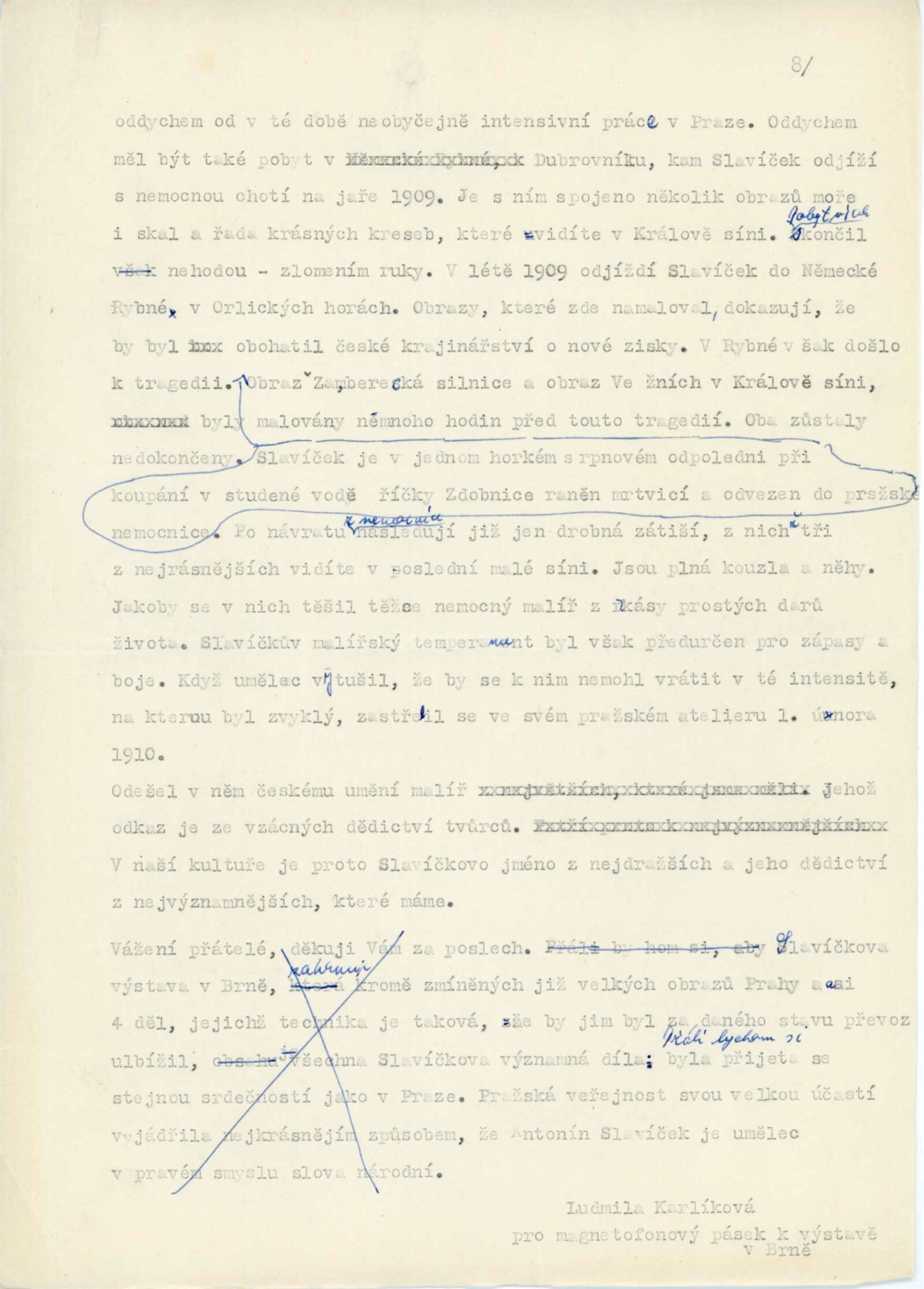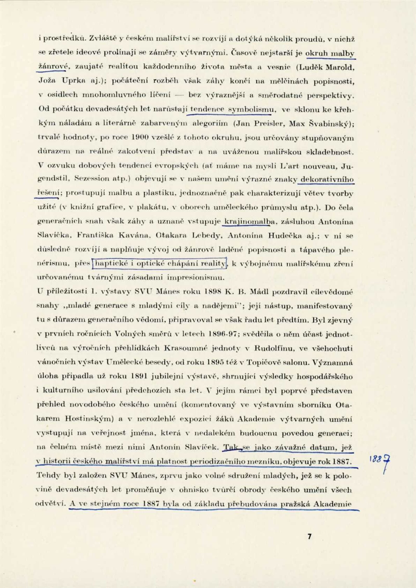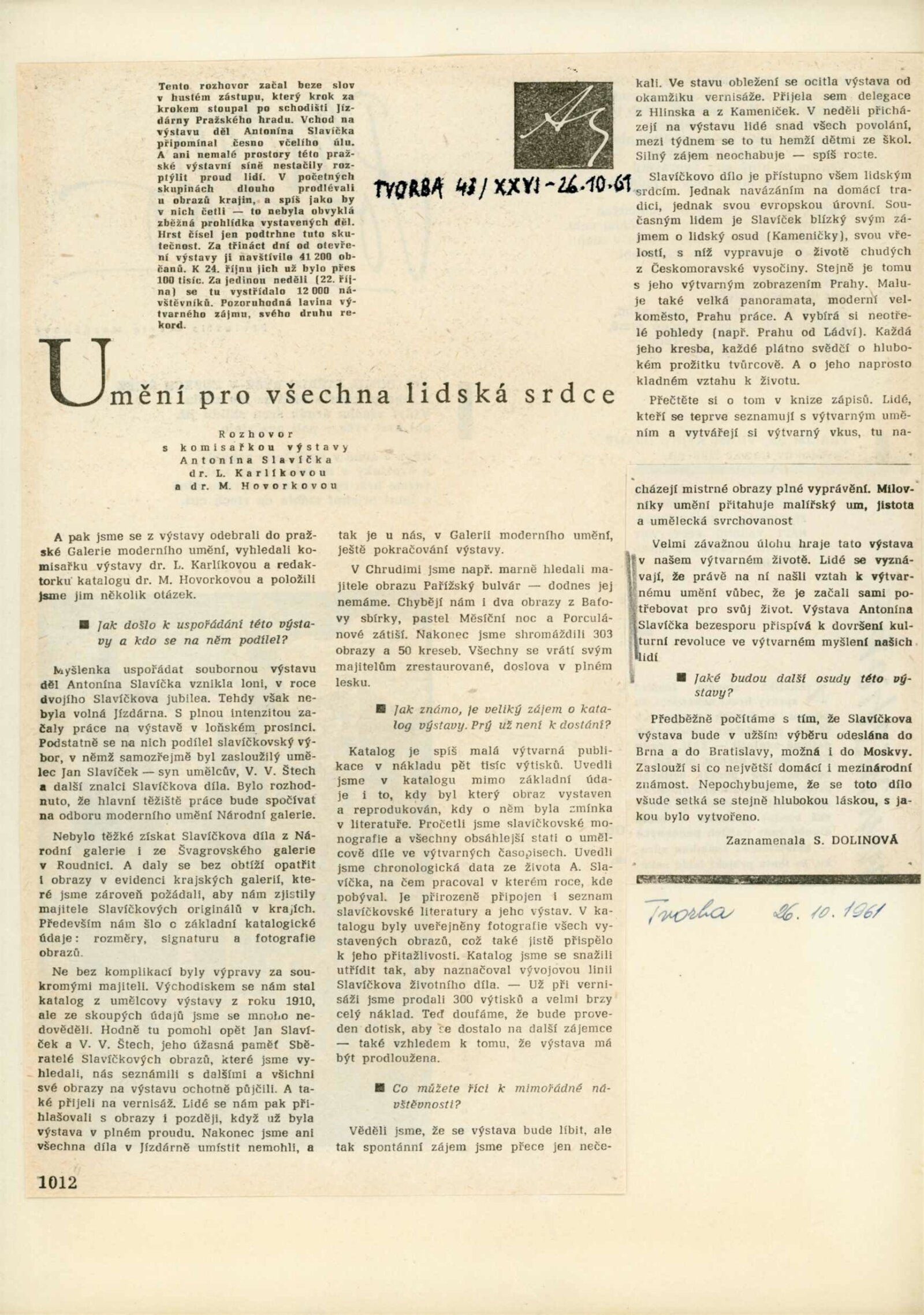 pozvánka, katalog + maketa katalogu, průvodní slovo (L. Karlíková + dopis, text Jiřího Kotalíka), seznamy prací, fotografie děl a z vernisáže, korespondence (o vytvoření kopií obrazů na výstavě, dopisy J. Slavíček a Adolfa Kroupy, o převzetí výstavy z Jízdárny NG do Brna, potvrzení dohody o výstavě, provozní korespondence, telegram V. V. Štecha), objednávky přípravných prací pro výstavu u ČFVU, přehled oslovených soukromých majitelů děl a institucí, žádosti o výklad pro skupiny, recenze v tisku, katalogy (SNG, NG a dotisk pro DU)