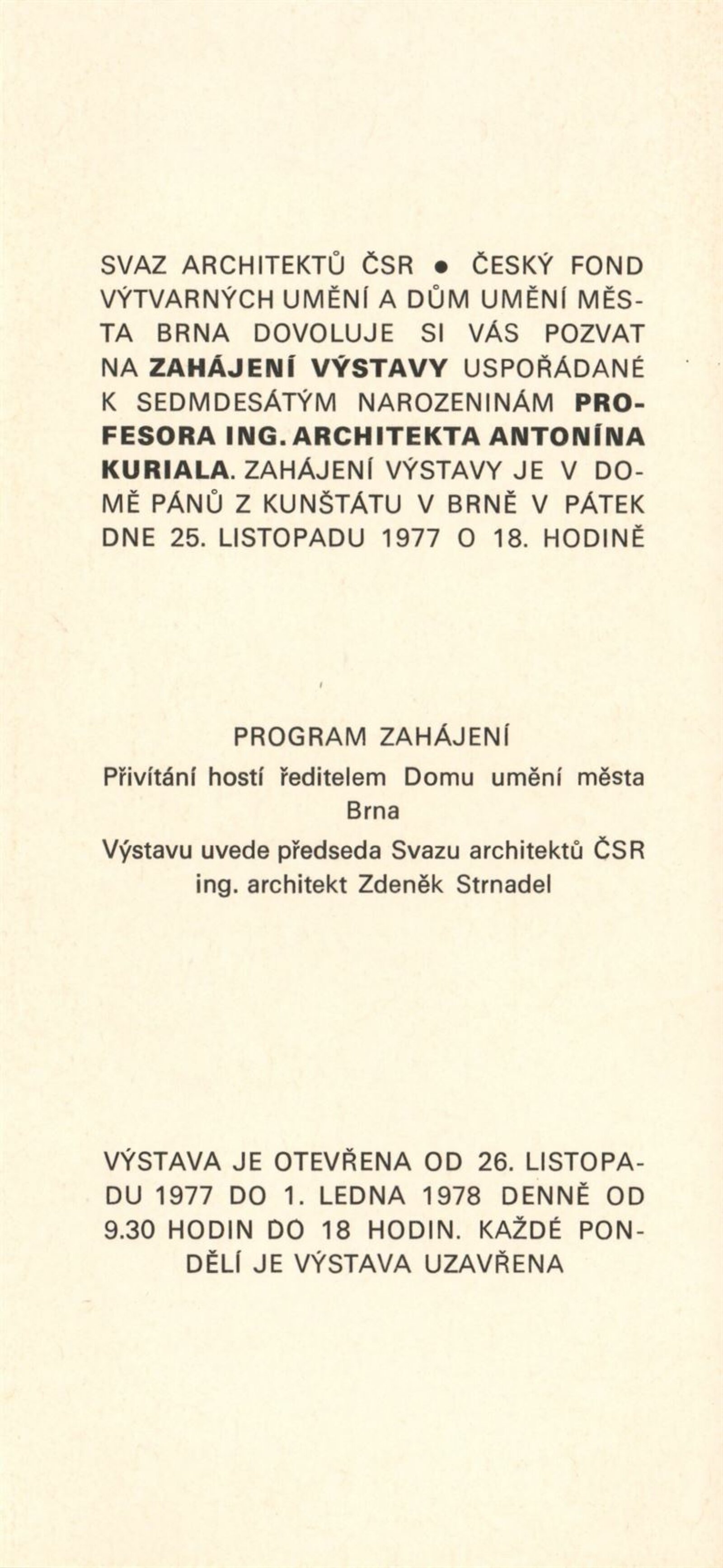 Architekt Antonín Kurial: Dům umění / Dům pánů z Kunštátu, 26. 11. 1977 – 1. 1. 1978 / Vydáno při příležitosti sedmdesátých narozenin profesora arch. Ing. Antonína Kuriala k propagaci vývoje české architektury a k výstavě jeho celoživotní práce. – Texty: Zdeněk Denk, Felix Haas, Josef Poulík, Václav Richter, Antonín Kurial. – Brno: Svaz architektů ČSR, 1977. – 47 s., obr., 8 l. bar. příl., portrét, seznam prací, DPK 662. – MZK; MG.
