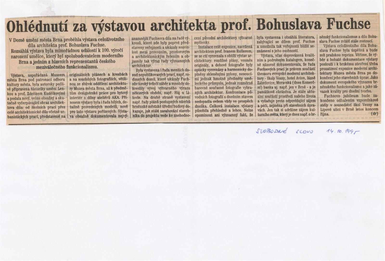 pozvánka, katalog, fotografie výstavy (DU exteriér), recenze v tisku, poznámky, digitalizovaný dokumentární film ČT - cyklus z filmových archívů STOPY, Ke 100. výročí narození architekta Bohuslava Fuchse