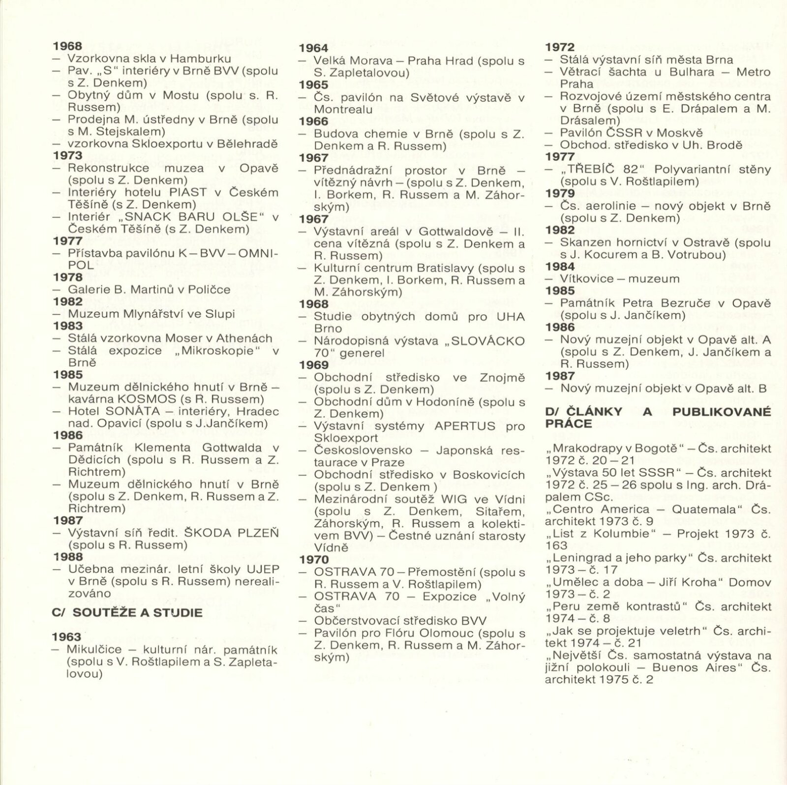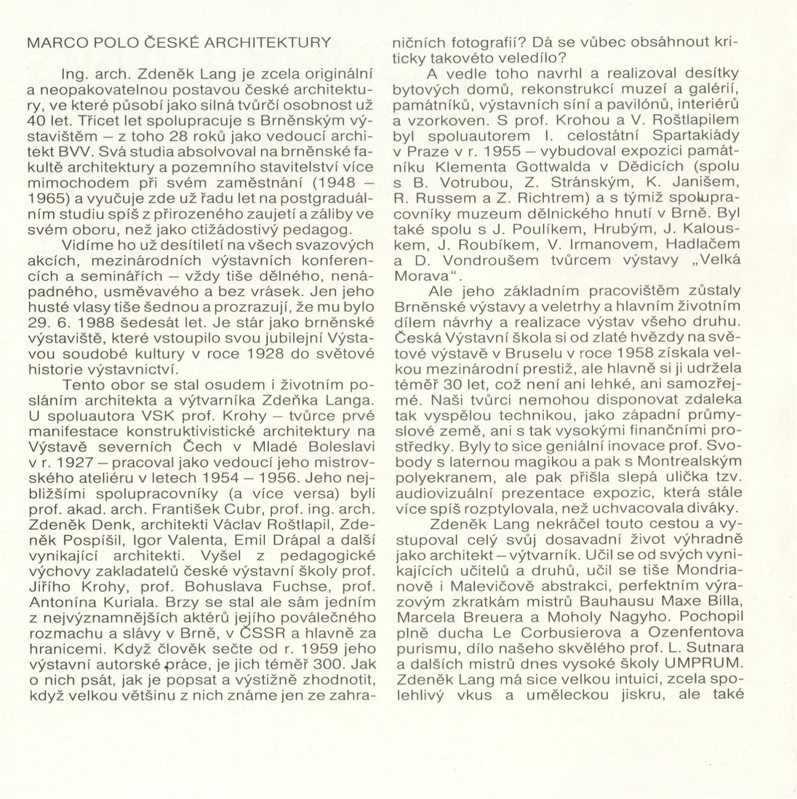 Architekt ing. Zdeněk Lang: Galerie Stará radnice, Kabinet architektury, 7. 9. – 16. 10. 1988 / Texty: Otka Nový, Josef Hrubý. – Brno: Svaz českých architektů, 1988. – [52] s., obr., seznam díla, bibliografie, GSR 32