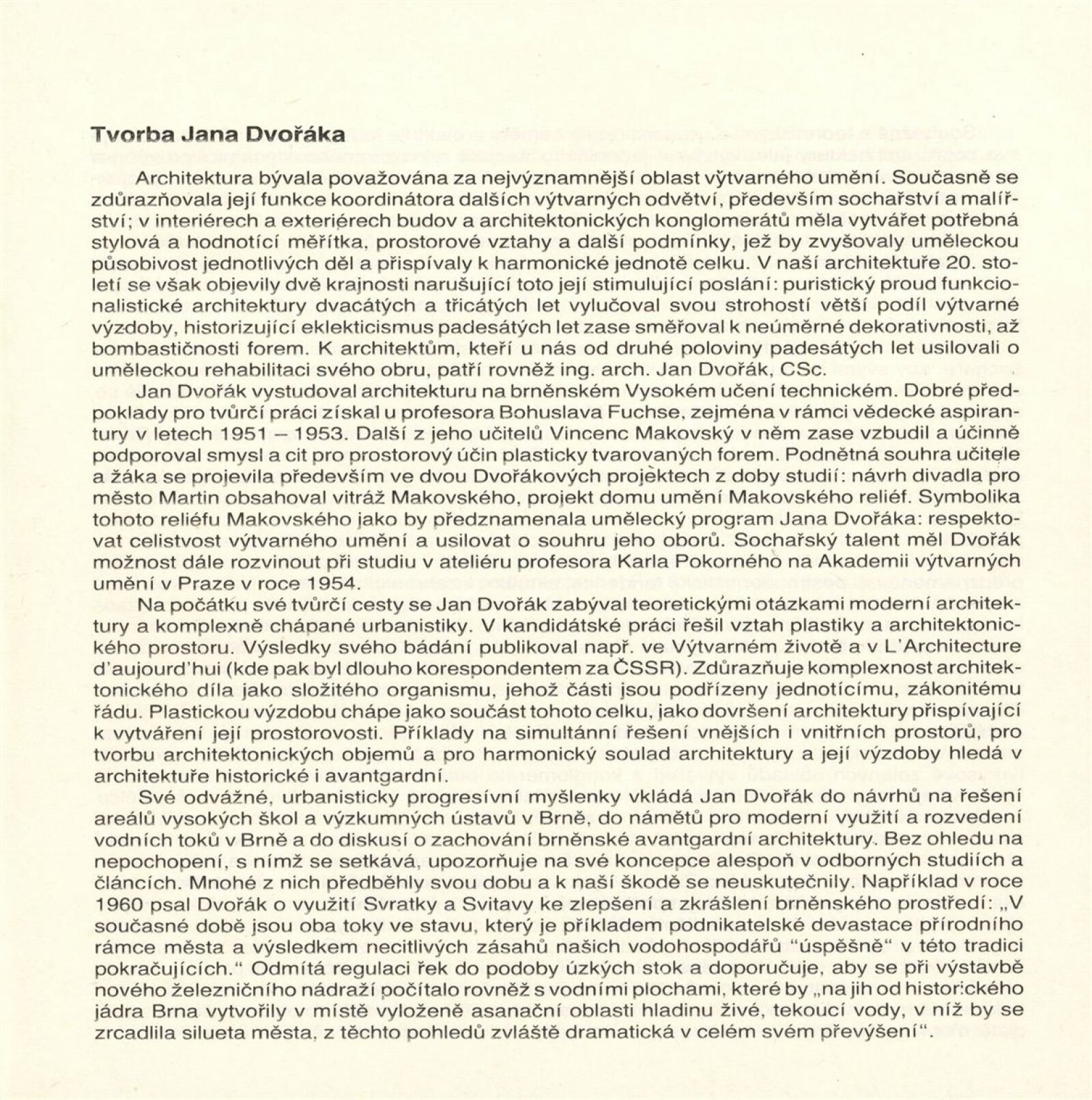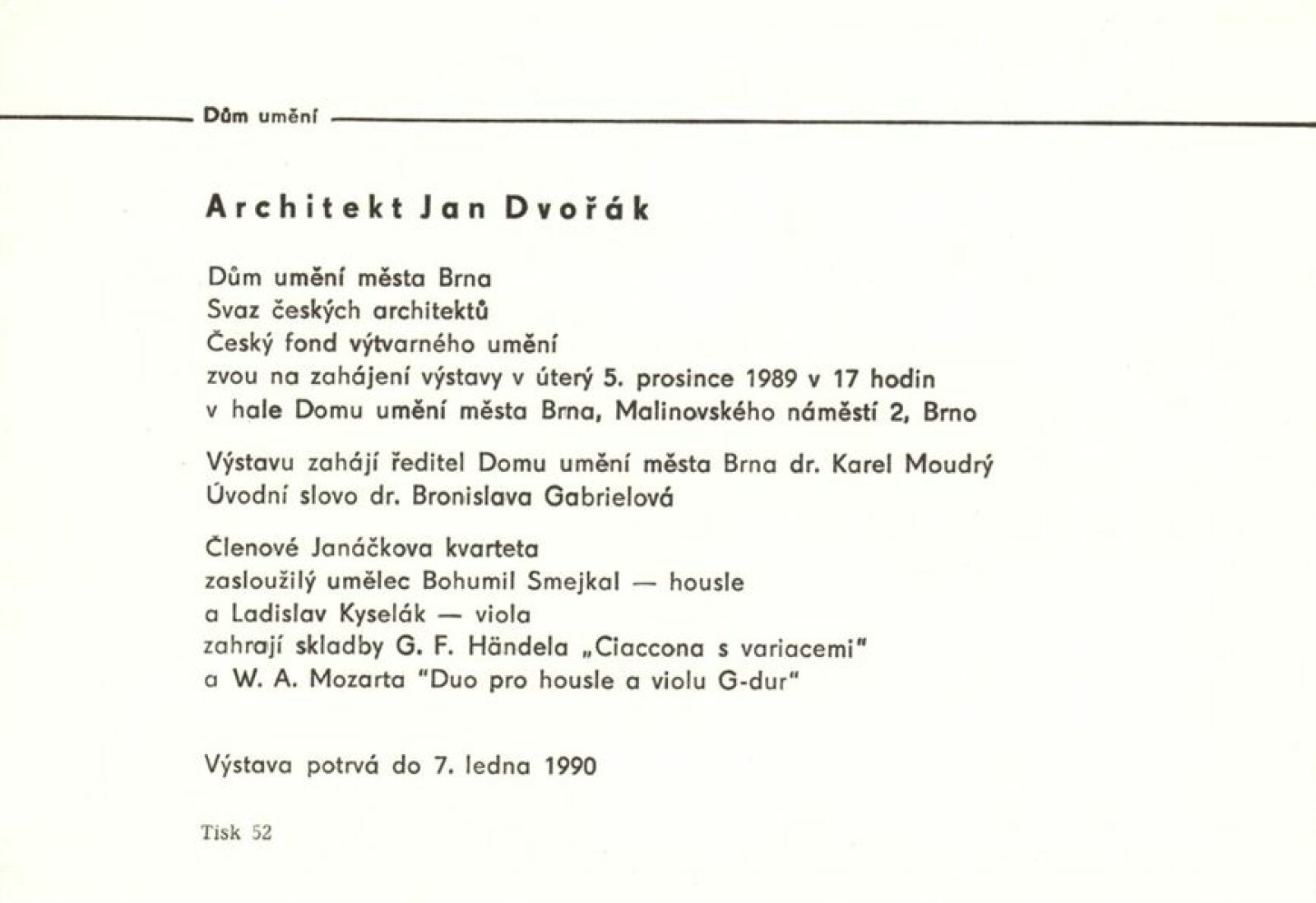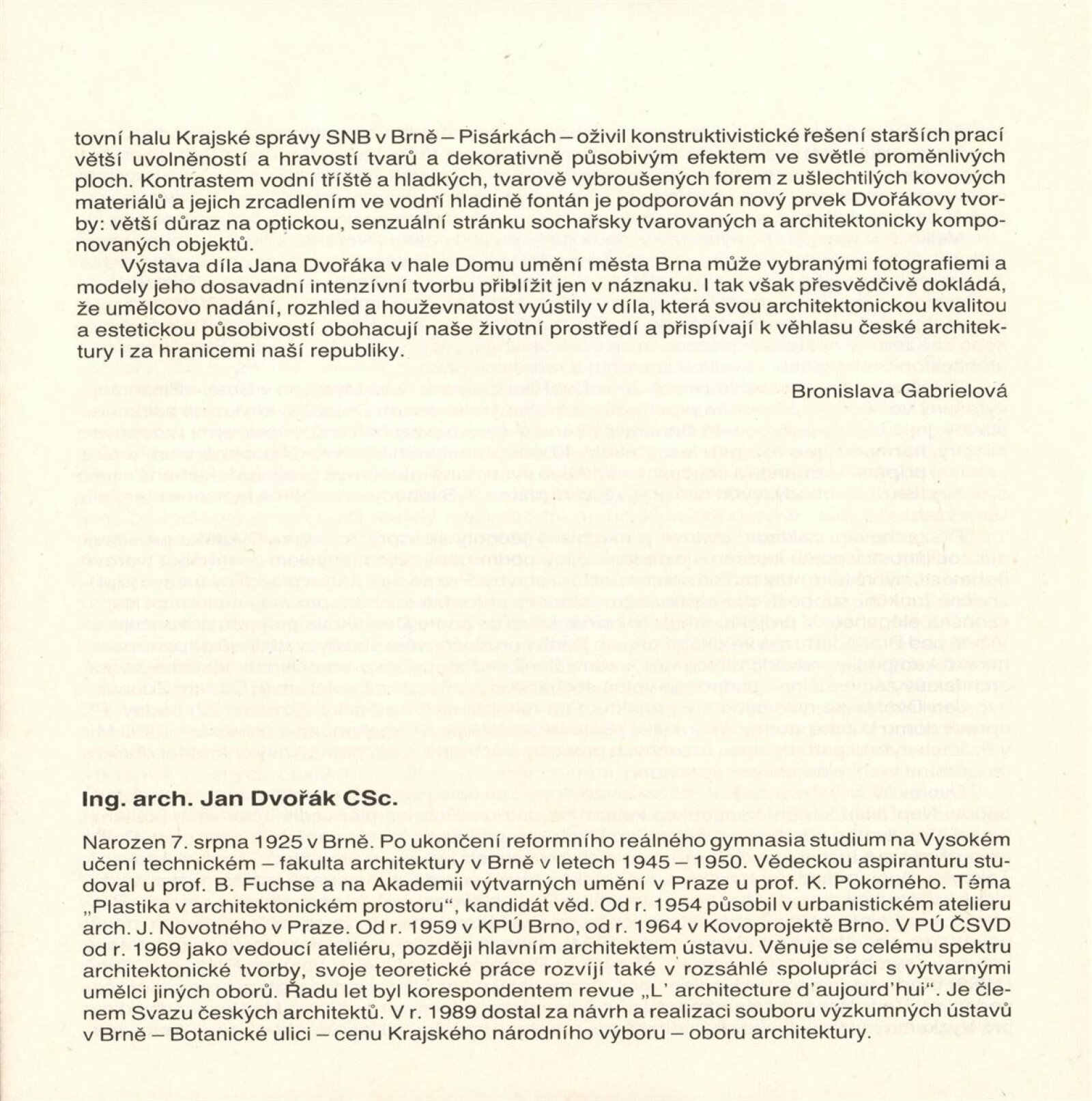 Architekt Jan Dvořák: Dům umění města Brna, hala, 5. 12. 1989 – 7. 1. 1990 / Text: Bronislava Gabrielová. – Brno: DUmB, 1989. – [34] s., obr., životopis, soupis prací, DU 876. – MZK; MG