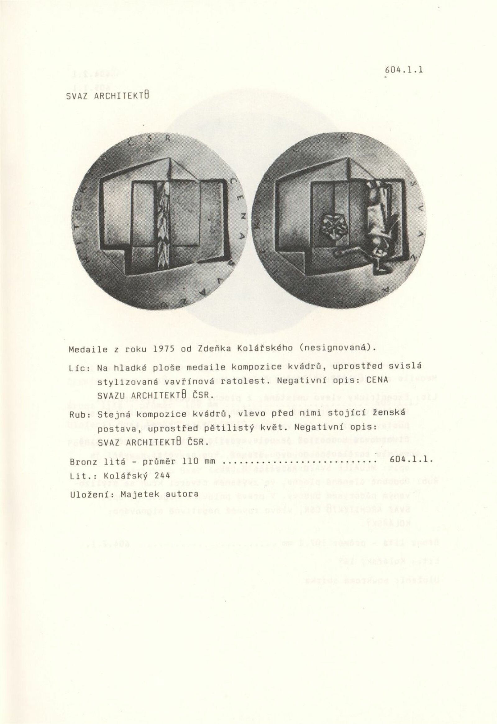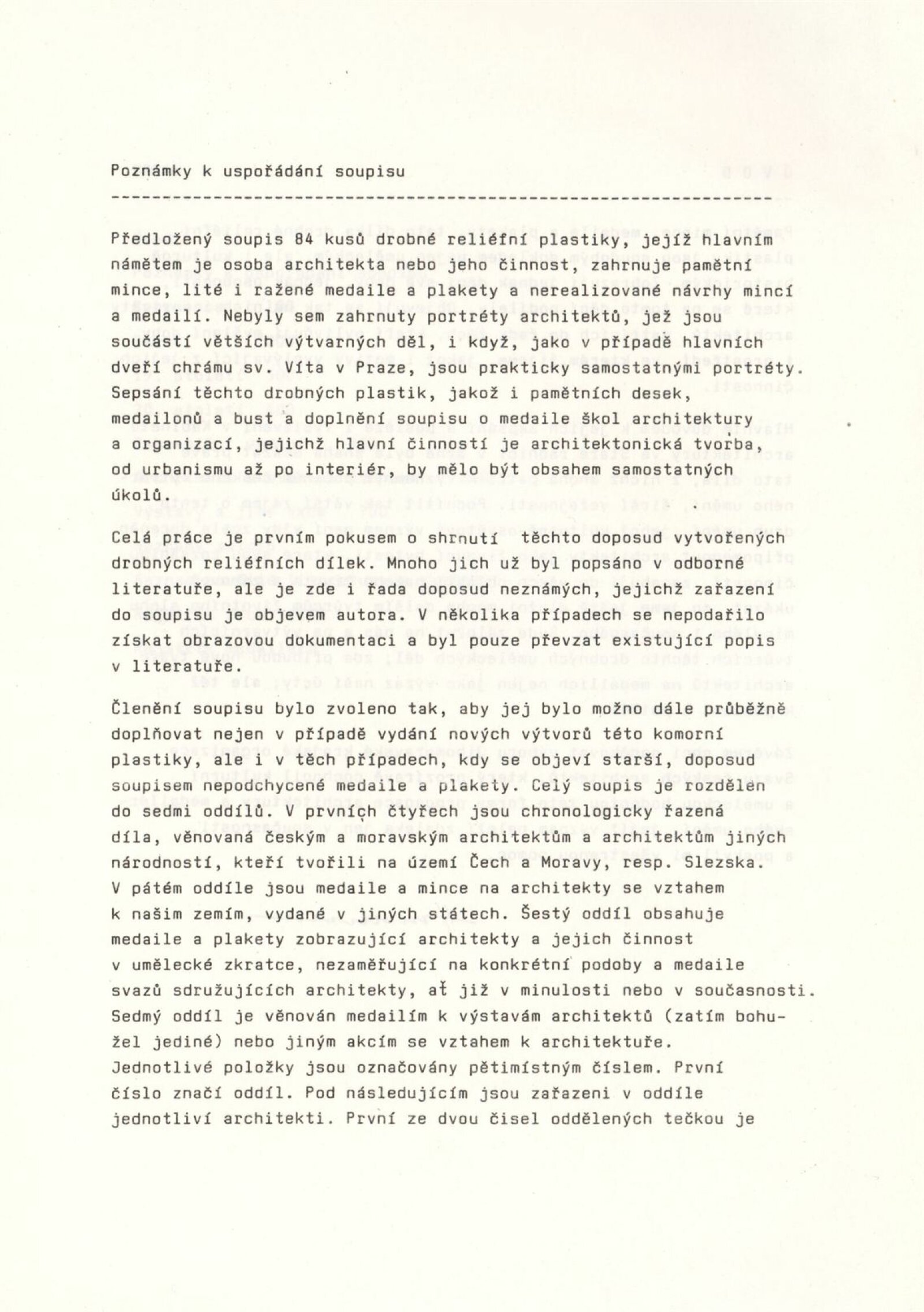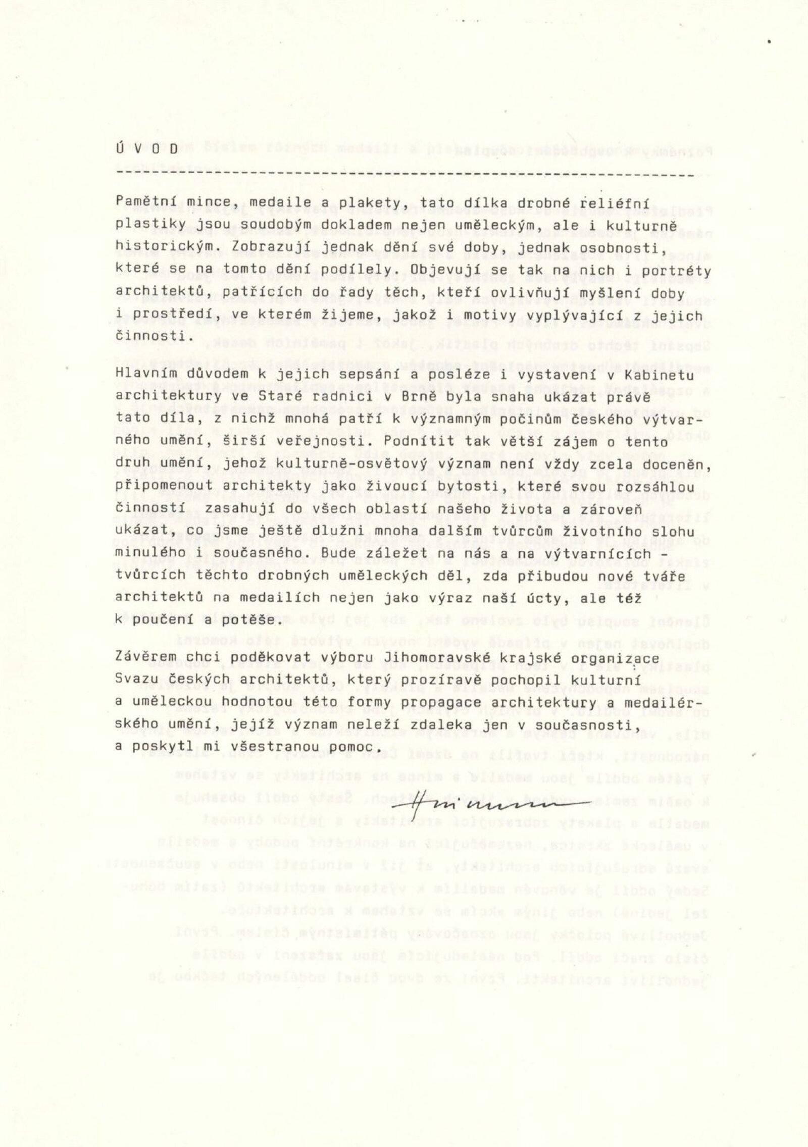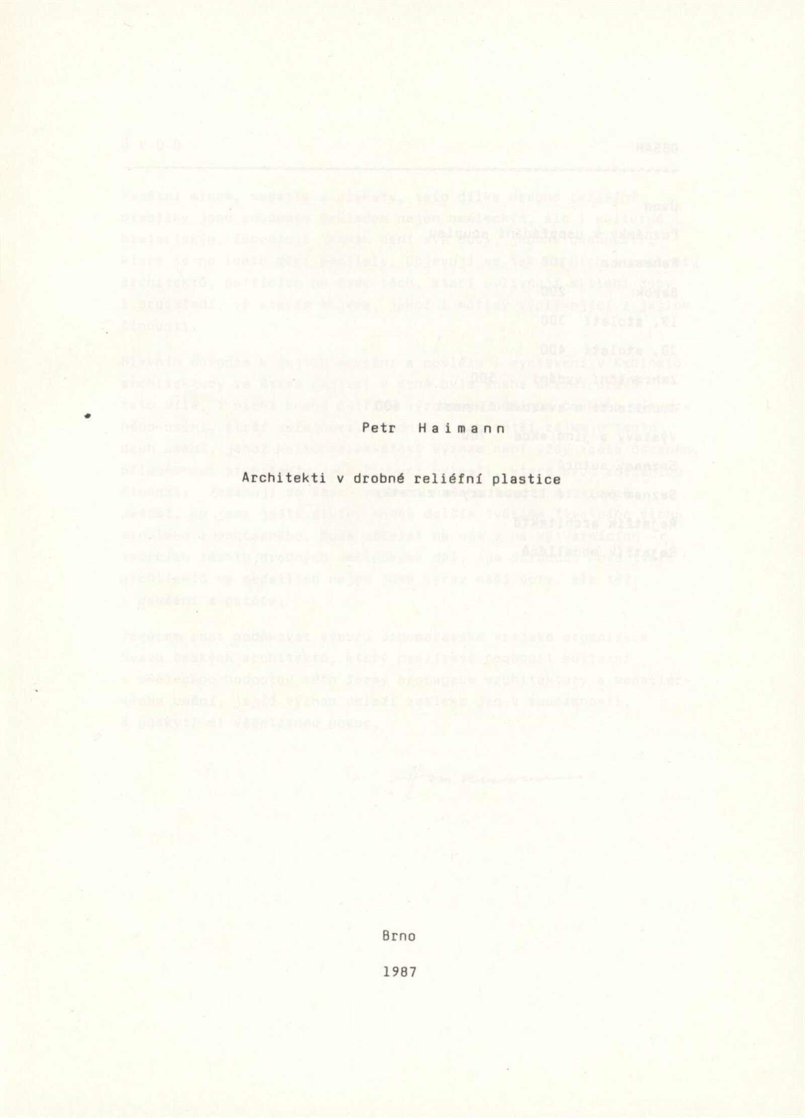 Architekti v drobné reliéfní plastice: Galerie Stará radnice, Kabinet architektury, 25. 11. 1987 – 17. 1. 1988 / Text: Petr Haimann. – Brno: ČFVU, 1987. – [80] s., obr., soupis, bibliografie, GSR 12. – MG