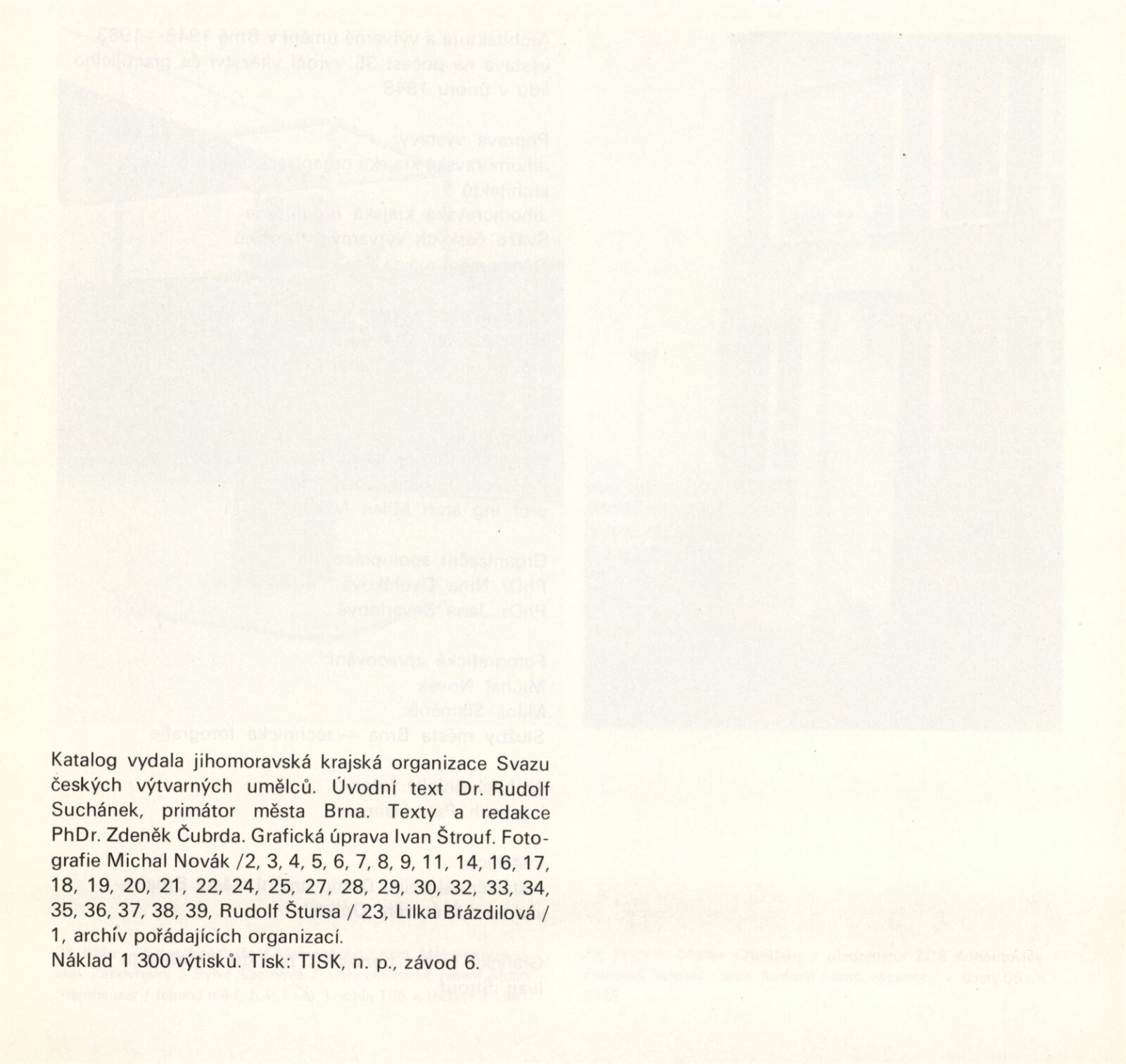 Architektura a výtvarné umění v Brně 1948–1983: Dům umění města Brna, 1. patro, 11. 10. – 13. 11. 1983 / Texty: Rudolf Suchánek, Zdeněk Čubrda. – Brno: SČVU, 1983. – 36 s., obr., DU 767. – MZK; MG