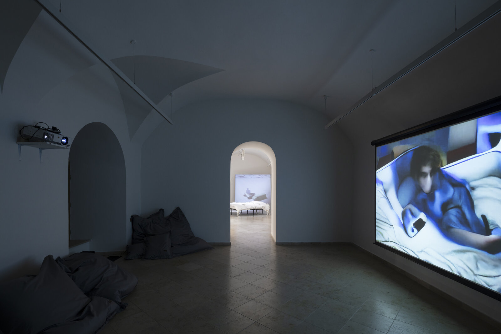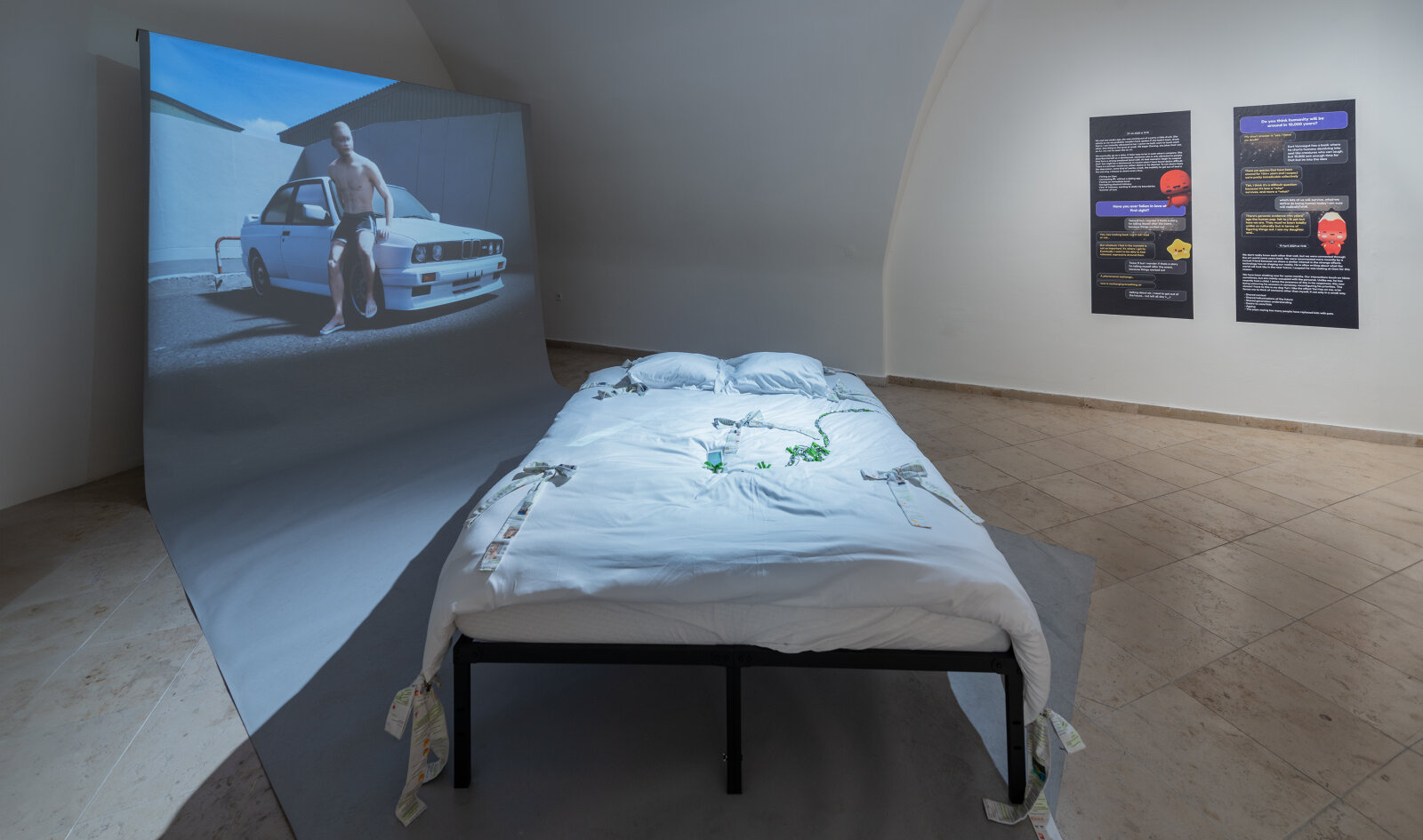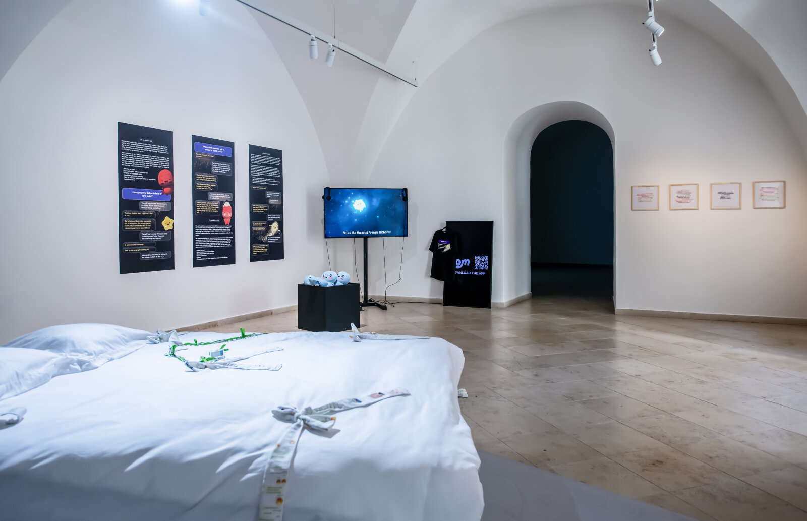 The exhibition Artificial Intimacies explores the rise of recreational romance by drawing parallels between the emotional manipulation of romance scammers and the emergence of companion chatbots like Replika. It examines the gamification of dating apps and reflects on the evolving emotional dynamics between humans and non-humans in the age of AI.