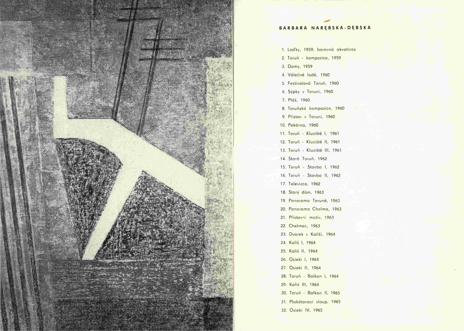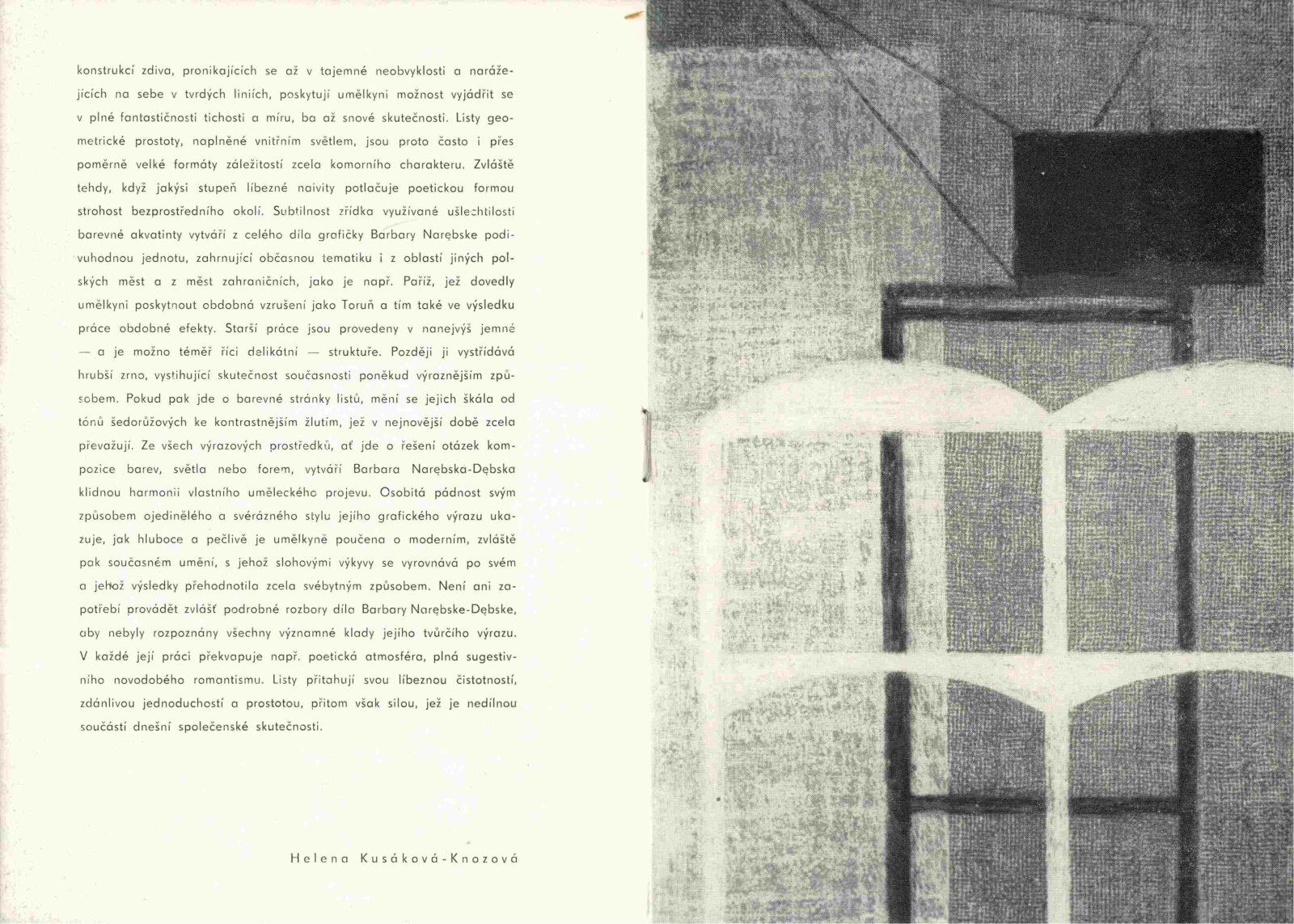 Barbara Narebska-Debska: Dům umění města Brna / Dům pánů z Kunštátu, 70. výstava Kabinetu grafiky, 5. 11. – 28. 11. 1965 / Text: Helena Kusáková-Knozová. – Brno: DUmB, 1965. – 8 s., obr., DPK 284. – MZK; MG; MMB