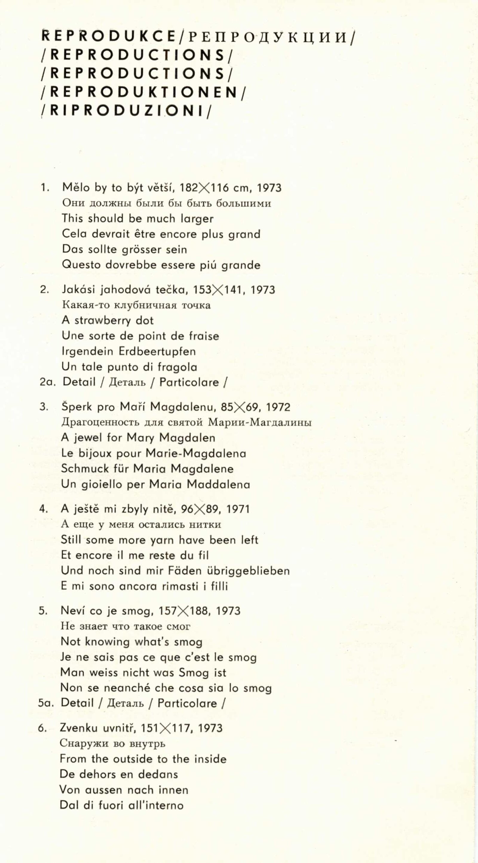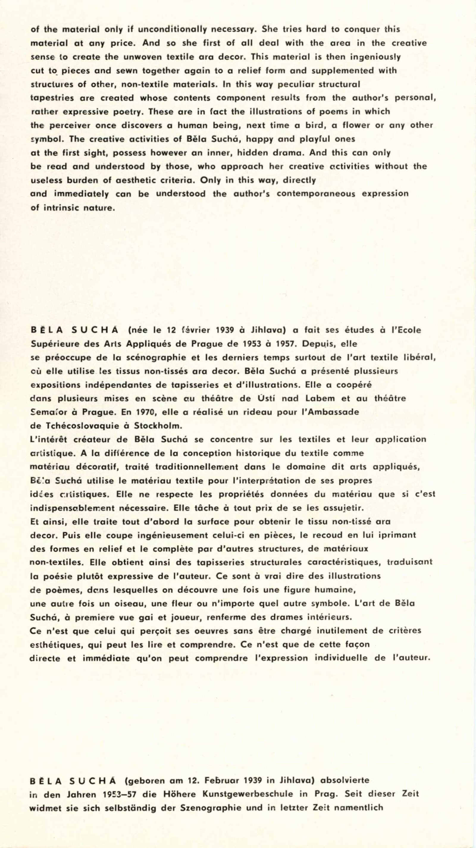 Běla Suchá. Tapiserie: Dům umění, 56. výstava v Galerii Jaroslava Krále, 27. 11. 1973 – 1. 1. 1974 / Text: Zdeněk Čubrda. – Brno: ČFVU, 1973. – 10 s., obr., bar. obr. příl. volně, seznam vystavených prací 2 s., portrét, životopis, výstavy, DU 599. – MZK; MG; MMB