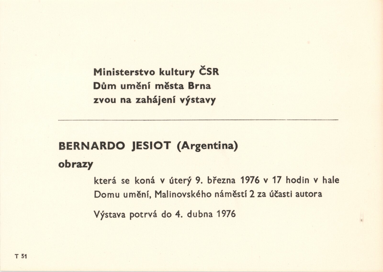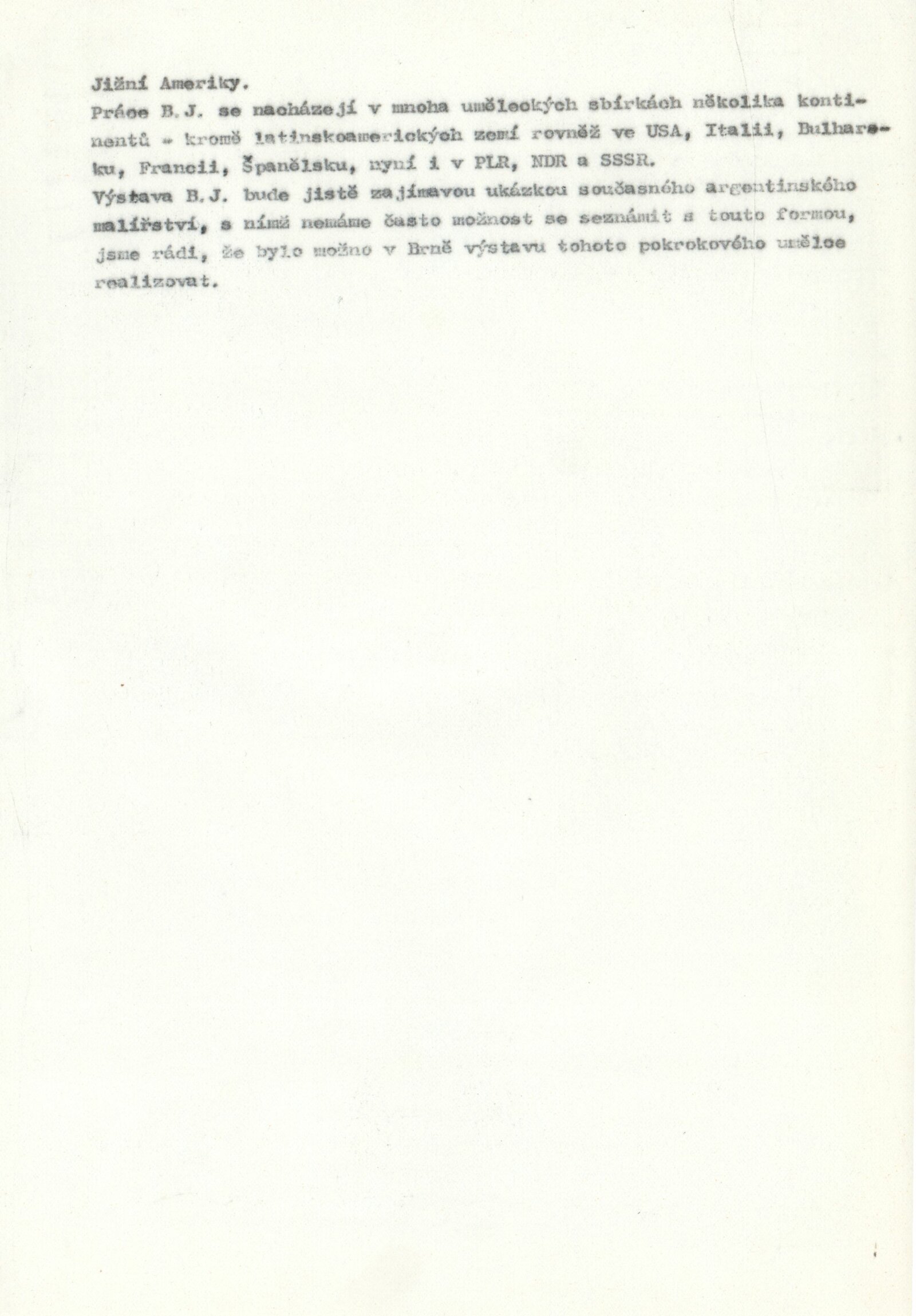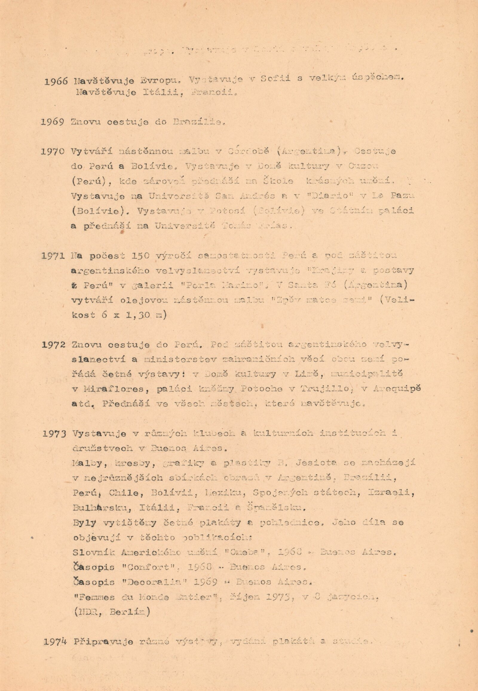 pozvánka, fotografie vernisáže, fotoreprodukce děl pro katalog, seznam vystavených děl, strojopis textu k výstavě, podklady pro katalog, životopis, korespondence, provozní korespondence, žádost o schválení a registraci výstavy (MKČSR), adresa umělce, recenze v tisku