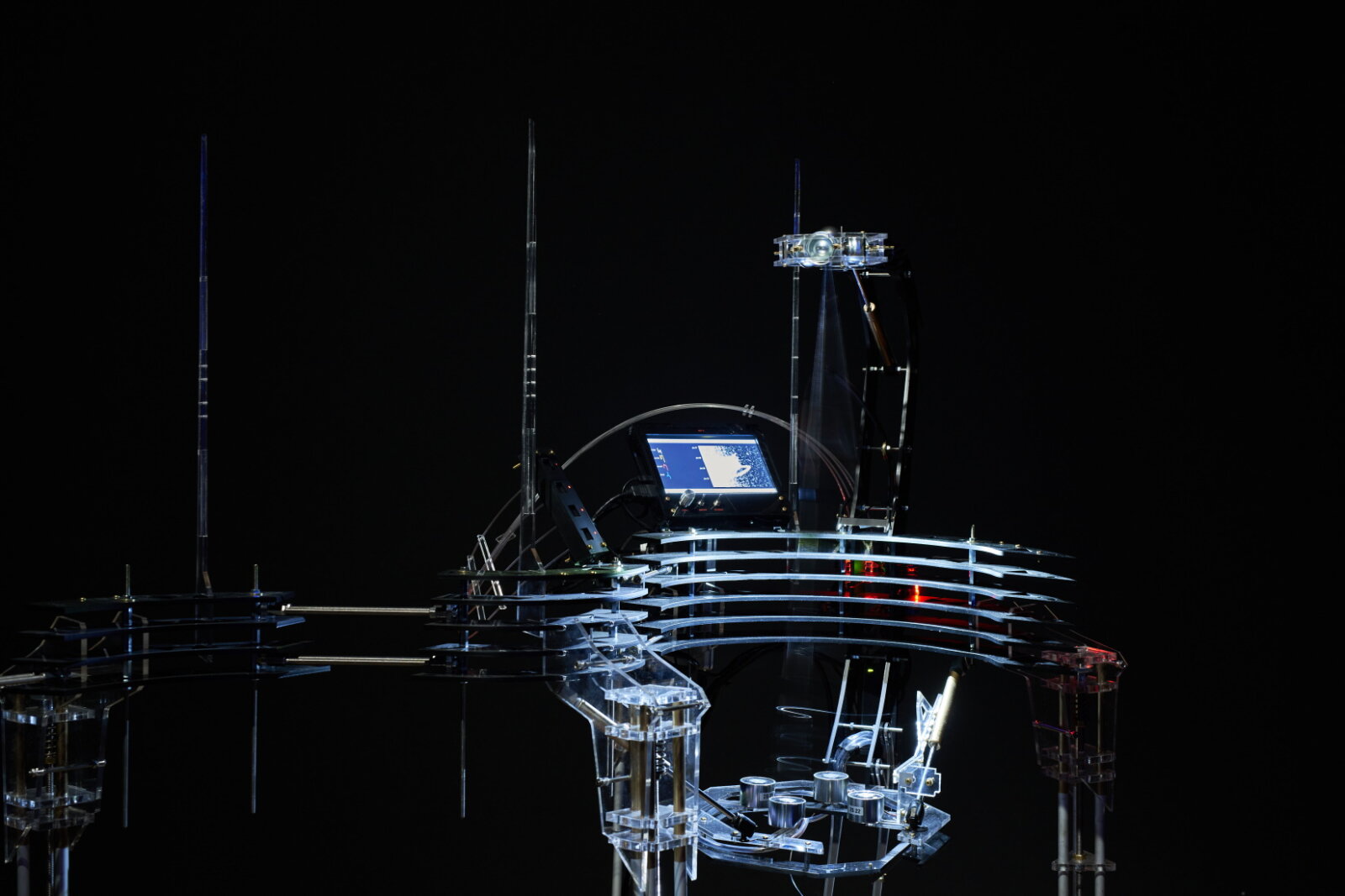 The international exhibition Beyond the Sound presents a contemporary approach to the specific and lively artistic field of sound art. Sound is presented not as an independent aesthetic form, but as a medium used to explore and reveal phenomena that are often unrecognisable to the eye. Each of the selected artists represents a different approach in the use of sound as a communication medium. The exhibition explores the ways in which sounds are created, as well as a reading of the semantic qualities that the signal chain entails. From sonifications of planetary phenomena such as fluctuations of telluric currents between the earth and the ionosphere (Ganchrow), Schumann resonances (::vtol::) or changes in the electrical potentials of cells (Interspecifics), to masterfully crafted field recordings of soundscapes at the borders of melting glaciers (Winderen), acoustic phenomena in liquid analogue computers or the gradual destruction of data memory by UV light (Moser), to the inaudible ultrasound causing the implosion of air micro-bubbles (Domnitch + Gelfand) - all the selected installations and objects are connected by their interest in innovatively exploring the world through sound and giving an ephemeral but important message about its intricate complexity and fragility of relationships. At the same time, the selected artists are also attentive to visual expression and object form and understand their work as complex, interdisciplinary and often technologically quite pioneering.
