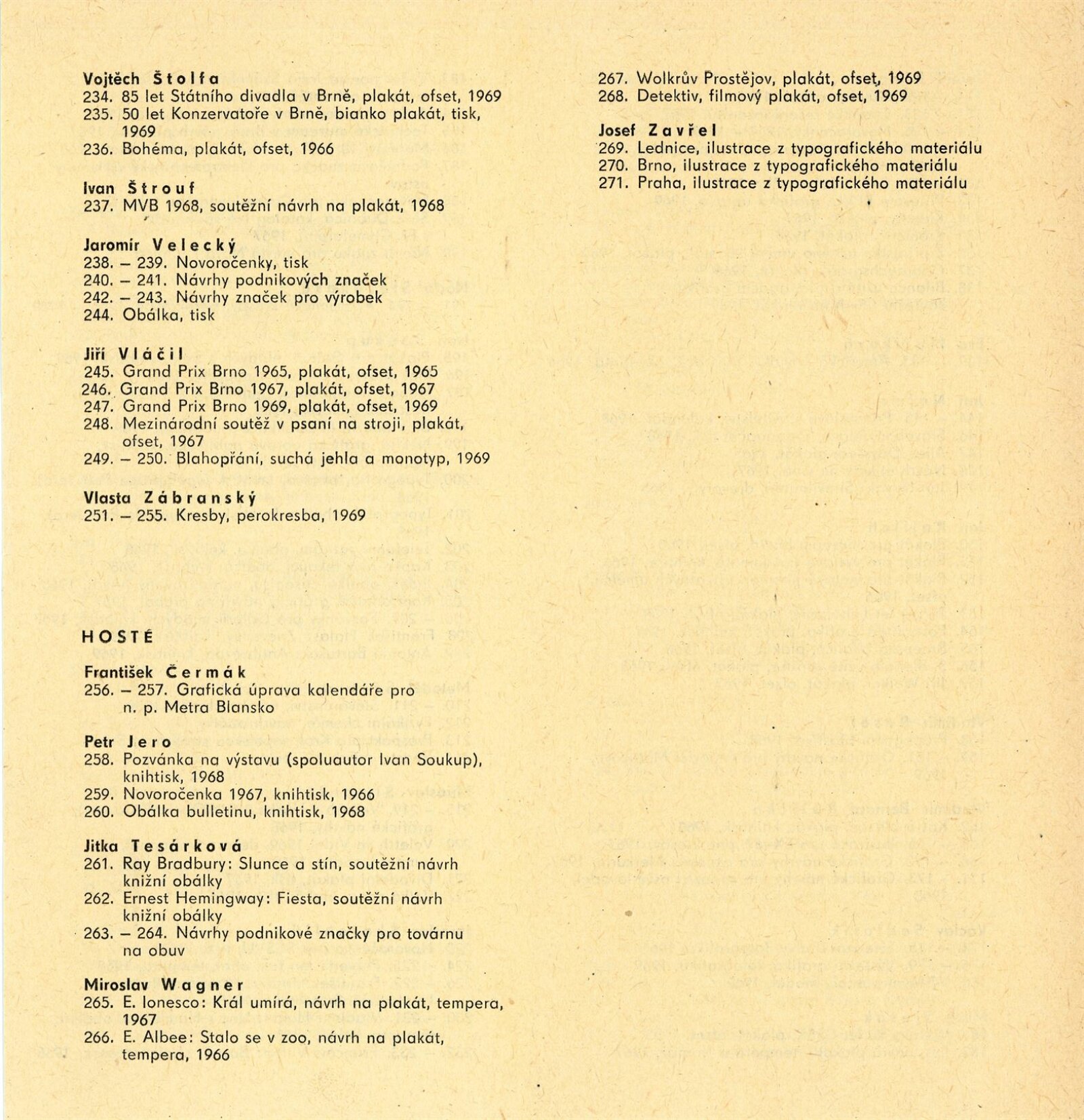 Bilance užité a propagační grafiky: Dům umění města Brna / Dům pánů z Kunštátu, 7. 11. – 7. 12. 1969 / Text: Jan Šebela. – Brno: SČVU, 1969. – 32 s., obr., seznam vystavených prací 4 s., životopisy vystavujících, DPK 421. – MZK; MG