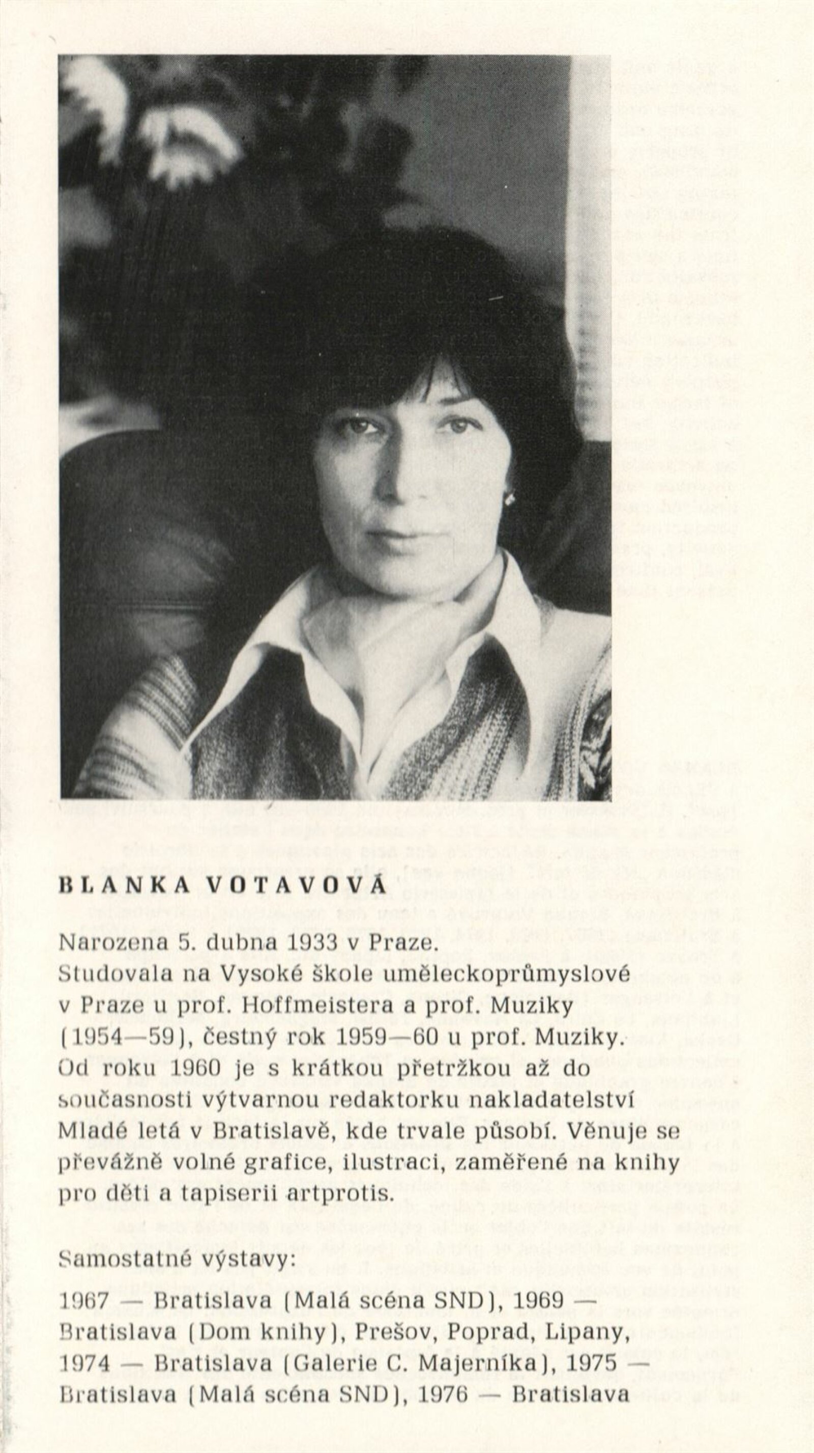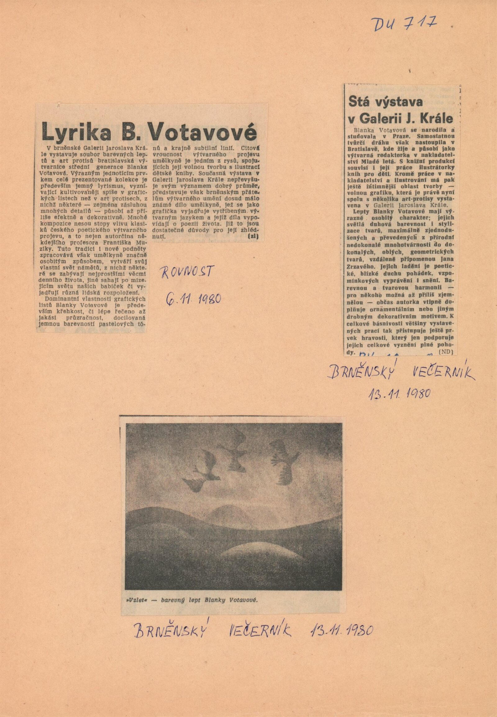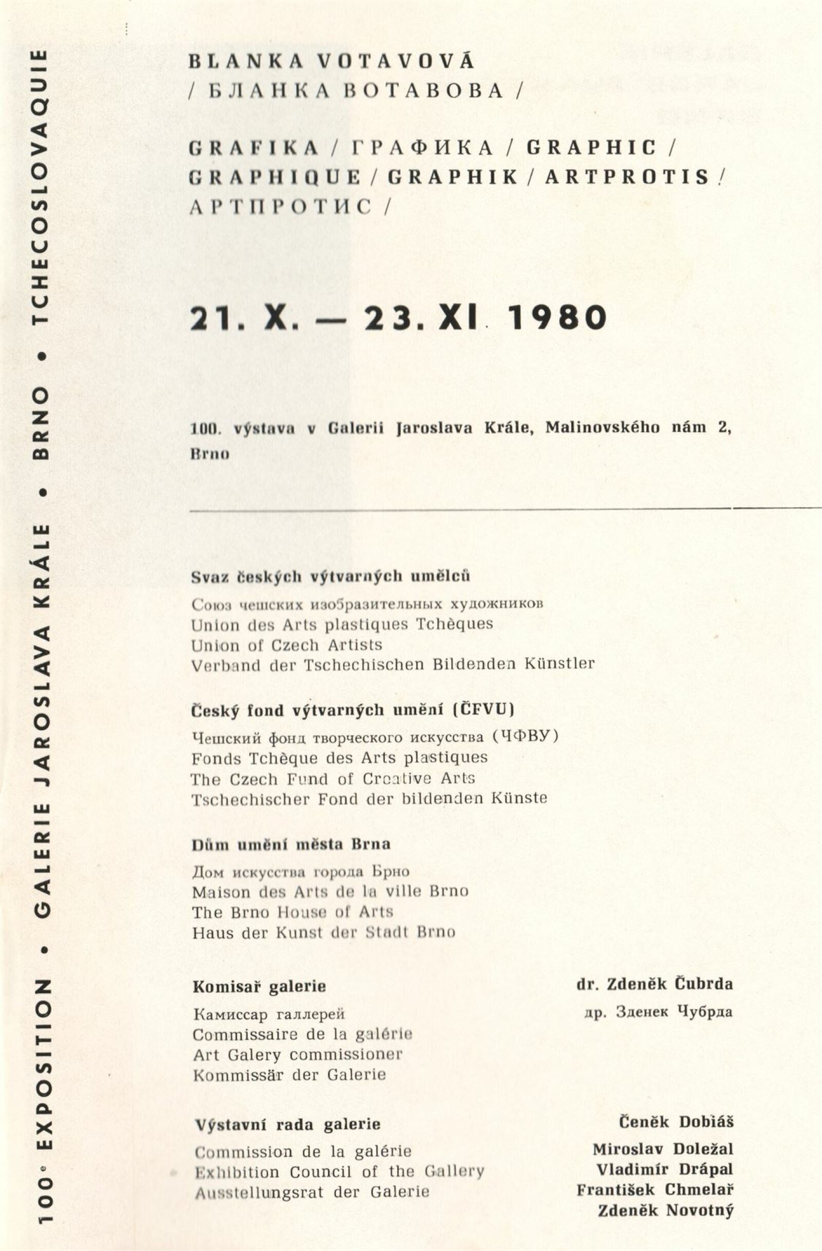 Blanka Votavová. Grafika, art protis: Dům umění, 100. výstava v Galerii Jaroslava Krále, 21. 10.– 23. 11. 1980. / Text: Fedor Kriška. – Brno: ČFVU, 1980. – 10 s., obr., seznam vystavených prací 2 s., portrét, životní data, výstavy, DU 717. – MMB
