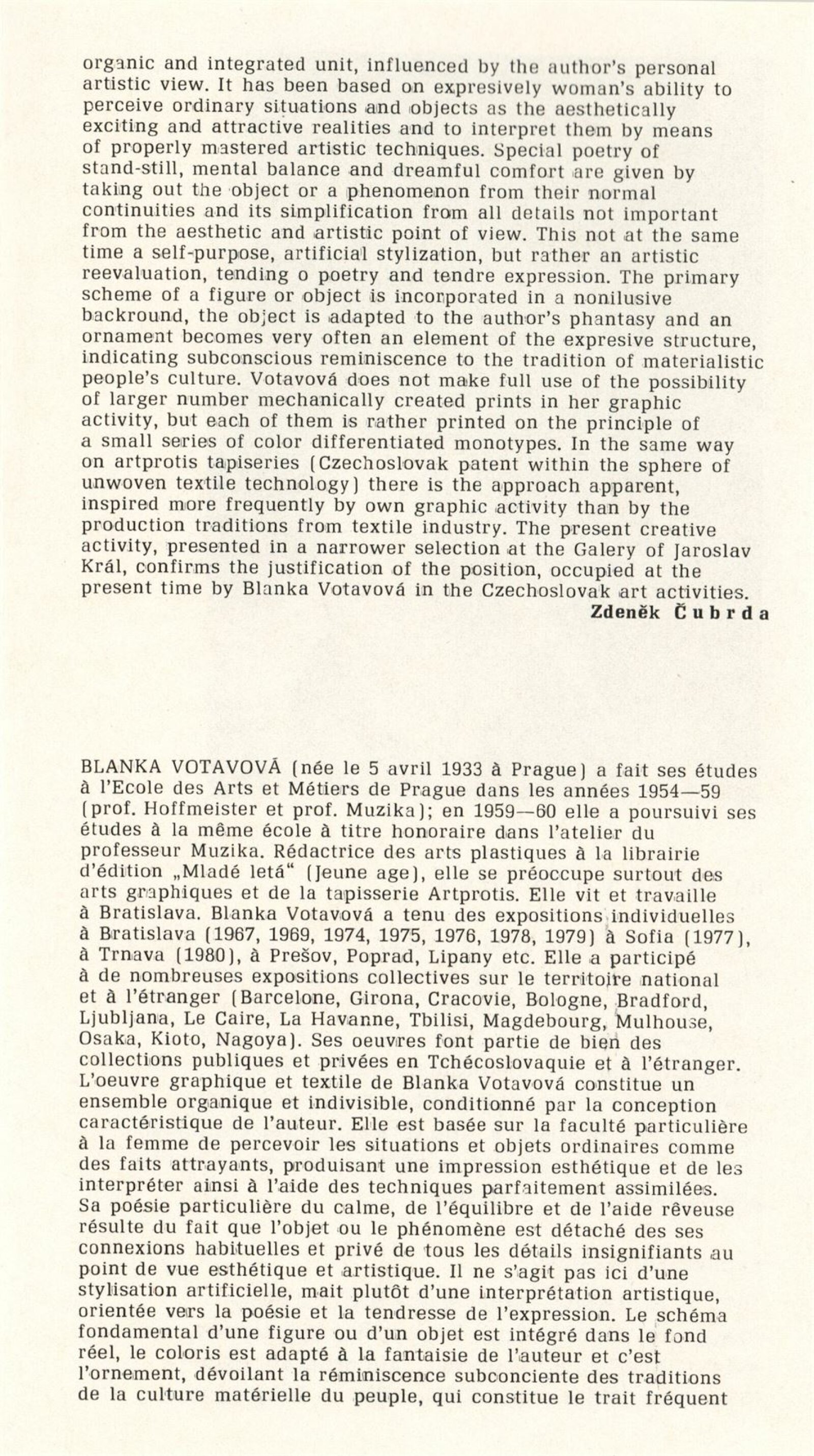 pozvánka, katalog, fotografie díla, recenze v tisku, katalog výstavy Blanky Votavové v Galérii C. Majerníka (1974)