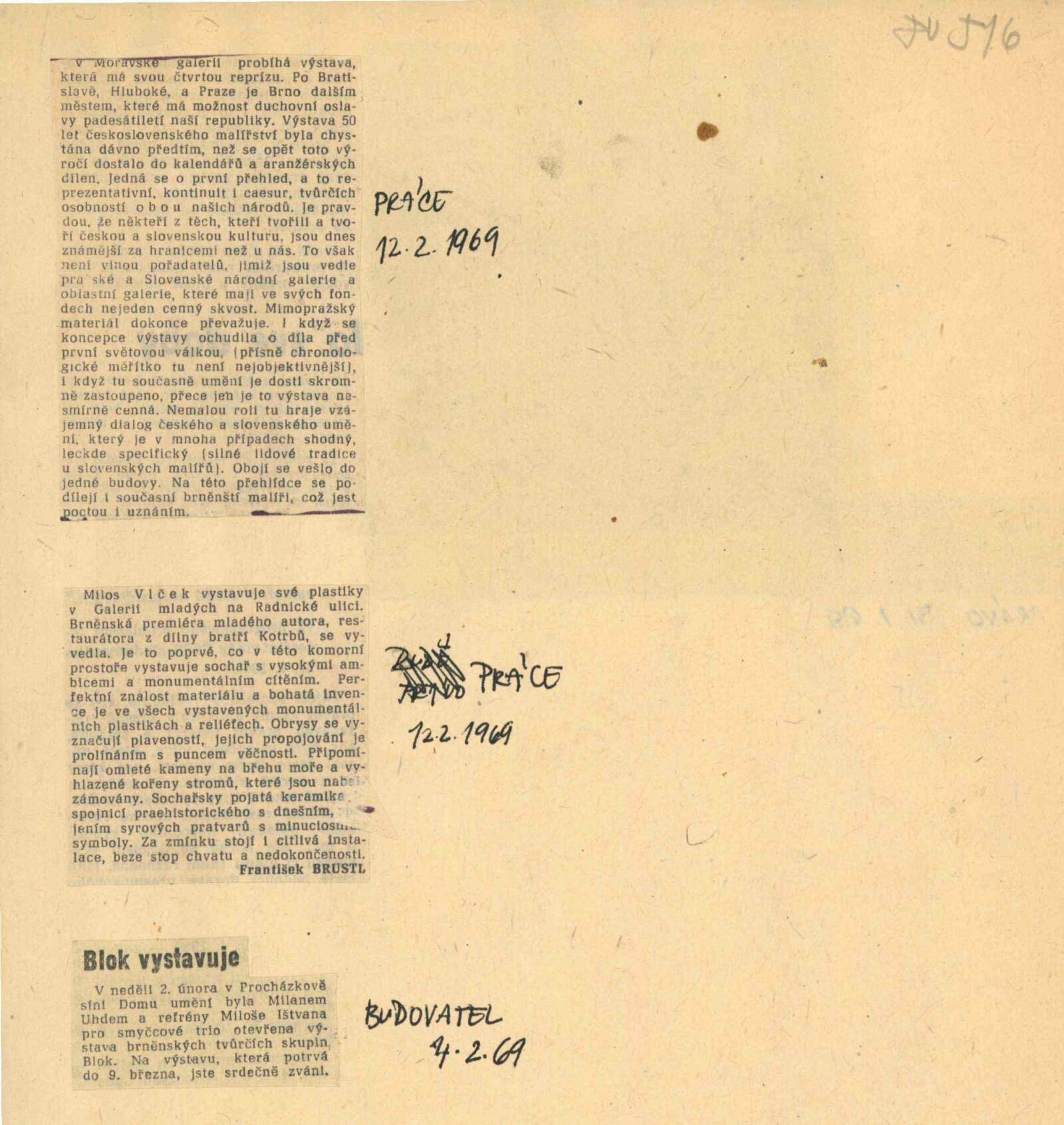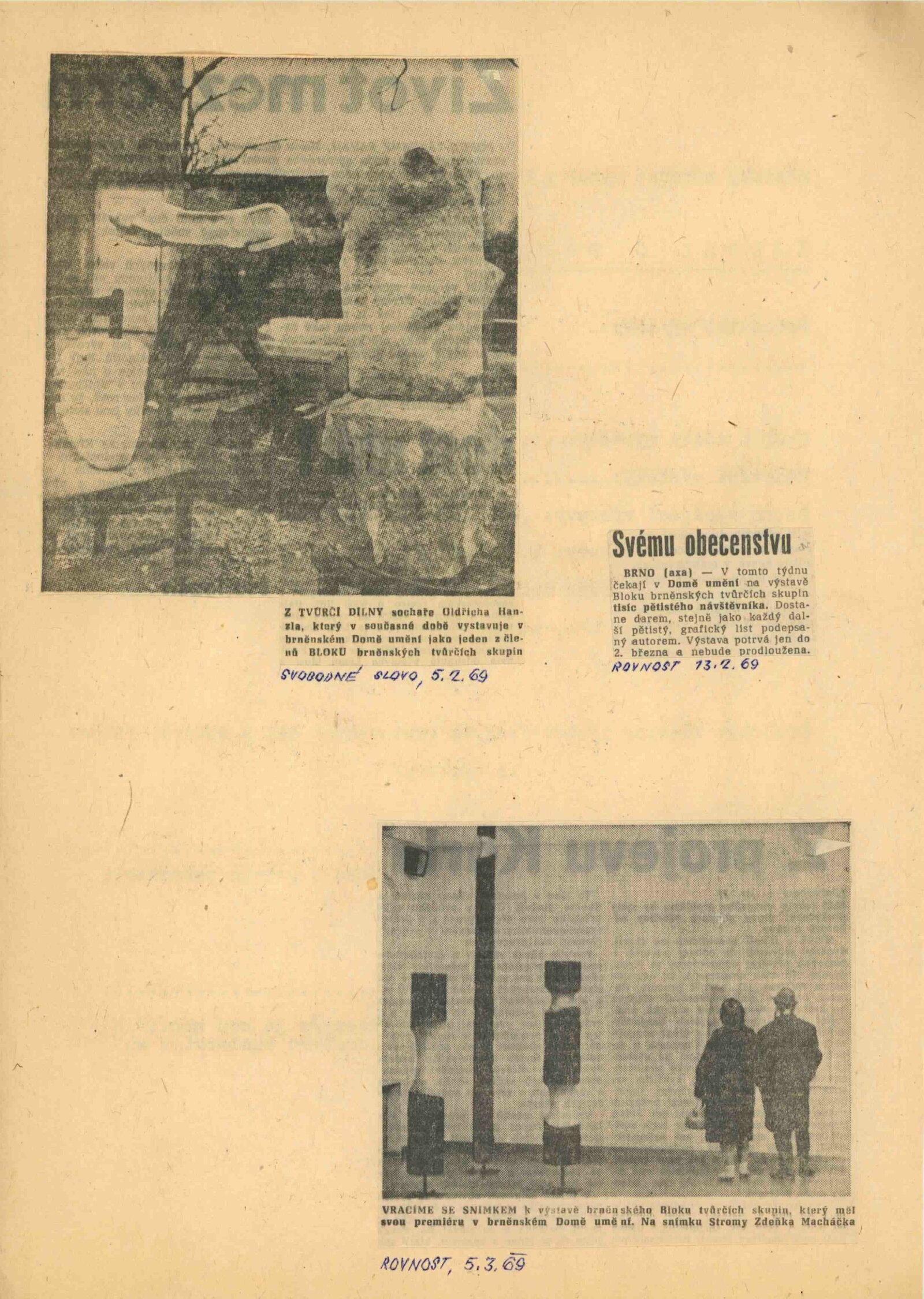 Blok brněnských tvůrčích skupin: Dům umění města Brna, 2. 2. – 2. 3. 1969 / Text: prohlášení Bloku, odpovědi autorů na otázky. – Brno: SČSVU, 1969. – 32 s., obr., DU 516. – Kubíček 7522; MZK; MG