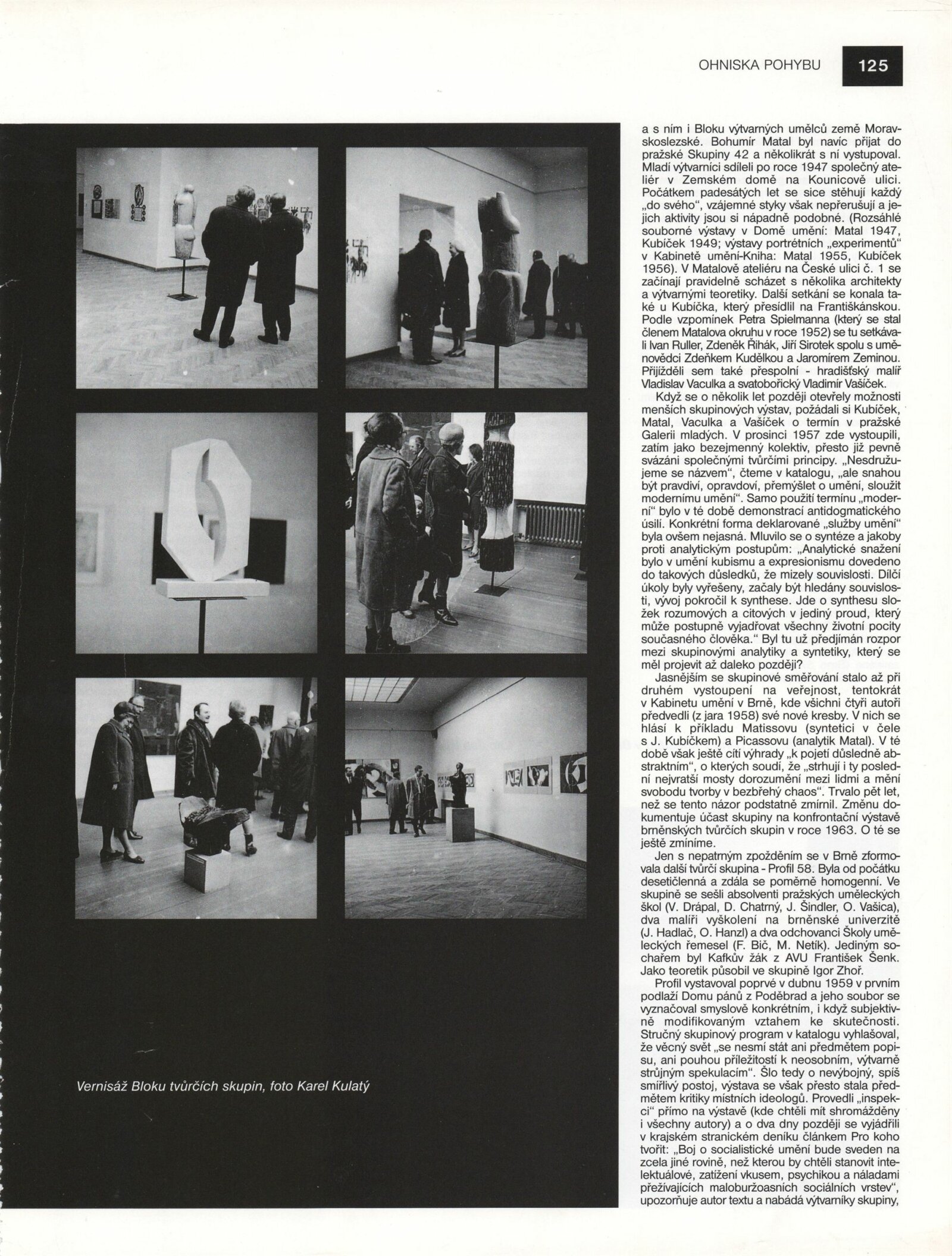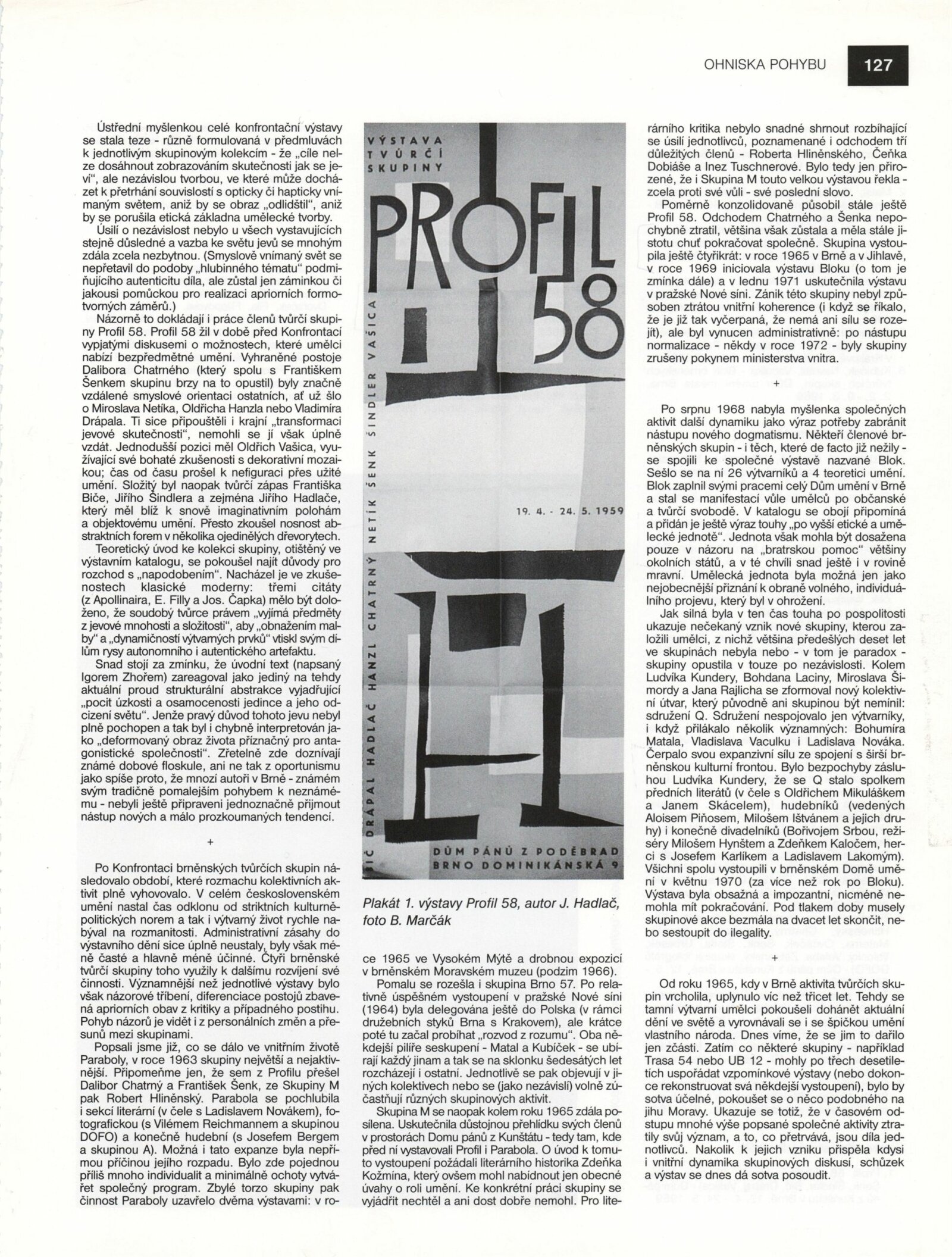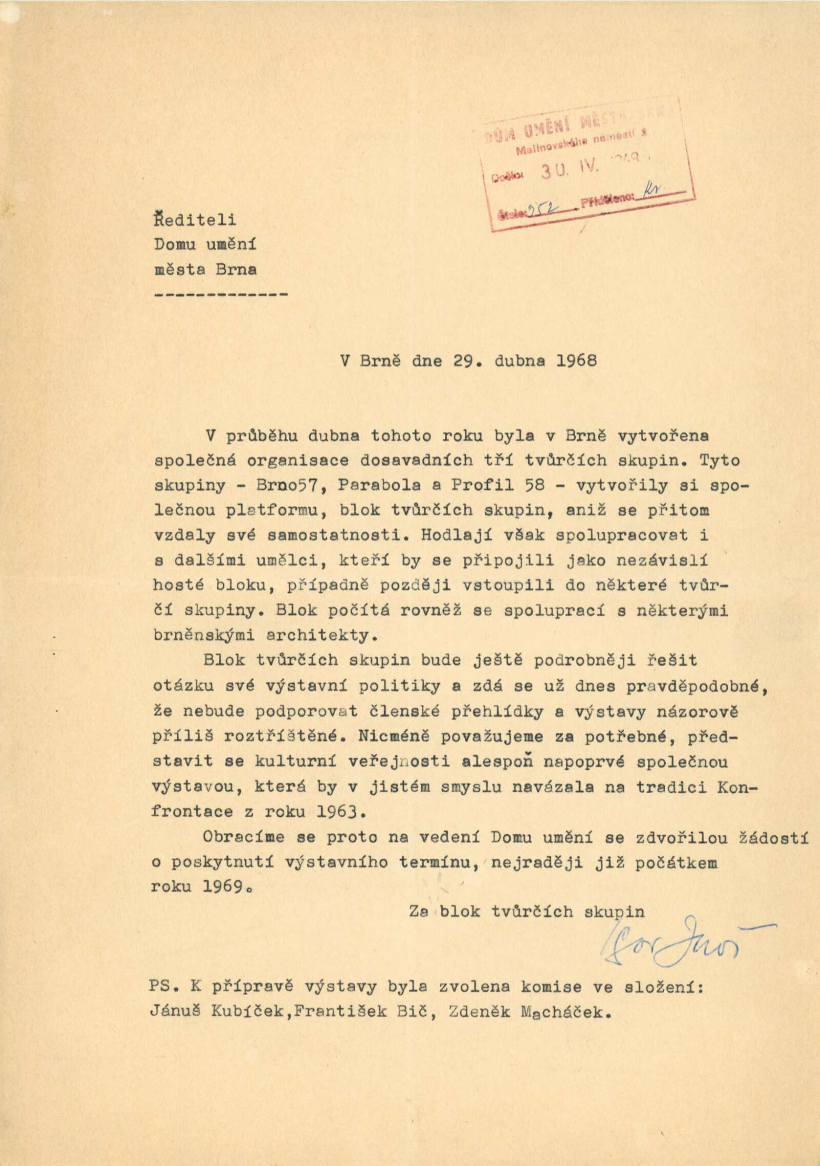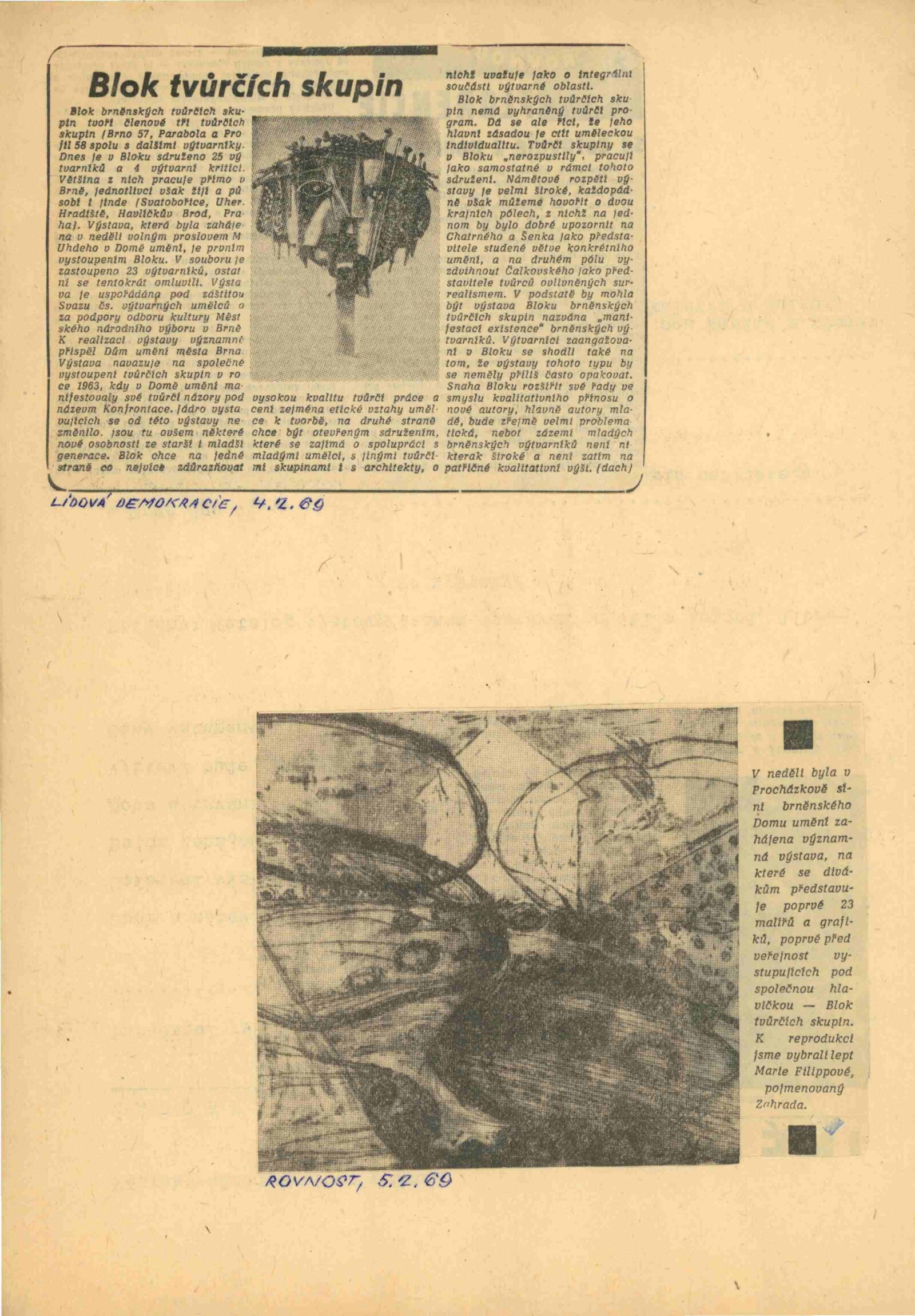Na jaře roku 1968 vznikl Blok brněnských tvůrčích skupin, organizace sdružující spřízněné výtvarné skupiny Brno 57, Profil 58 a Parabola, které od druhé poloviny padesátých let rozvíjely v Brně uměleckou tvorbu navazující na odkaz předválečné umělecké moderny a usilující o samostatný a soudobý abstrahující výtvarný projev, mimo požadavky oficiální kultury. Vznik Bloku jako zaštiťující platformy tvůrčích skupin, ale také jednotlivců, byl motivovaný jak společným výtvarným názorem a spřízeností uvedených skupin, osobními kontakty a přátelskými vztahy brněnských umělců, ale především potřebou spojit se ve větší organizaci, která mohla lépe odolat politickému a ideologickému tlaku po okupaci Československa sovětskými vojsky v srpnu roku 1968. Prohlášení Bloku, přednesené na shromáždění uměleckých svazů přednesl na jaře roku 1968 brněnský historik umění a architektury Zdeněk Kudělka. Blok měl vytvářet otevřené a zastřešující zázemí pro skupiny umělců, podporující individualitu jednotlivých autorů a přístupné pro přijímání dalších členů i skupin (o připojení měla v roce 1969 zájem brněnská sekce Klubu konkretistů) a podporou mladých tvůrců (v jednom ze zápisů schůzí výboru bylo odsouhlaseno utvoření tzv. Mladého Bloku pro začínající umělce). Schůze Bloku probíhaly v pravidelných měsíčních intervalech od dubna roku 1968 v Domě umění města Brna. Předsedou výboru byl zvolen Igor Zhoř, teoretik skupiny Profil 58, teoretik výtvarné pedagogiky a umění, pedagog, který společně s dalšími členy inicioval uspořádání společné skupinové výstavy. Výstava Bloku v roce 1969 navázala na společnou prezentaci v roce 1963 na výstavě Konfrontace brněnských tvůrčích skupin ve stejných výstavních sálech Domu umění. Přestože Zhoř uvažoval v dalším výhledu především o úžeji koncipovaných výběrových výstavách členů Bloku, považoval za důležité, připravit na začátku konfrontační přehledovou výstavu aktuálních výtvarných stanovisek jednotlivých umělců. Přípravným výborem výstavy byli pověřeni František Bič, Zdeněk Macháček a Jánuš Kubíček. Na společné výstavě se představilo celkem dvacet tři umělců - malířů, grafiků a sochařů. Na vernisáži výstavy, která tehdy běžně probíhala z důvodu prosazování sekularizace společnosti v neděli dopoledne, promluvil Milan Uhde. Činnost Bloku brněnských tvůrčích skupin byla restriktivně ukončena pravděpodobně v roce 1970-1971. (ms)