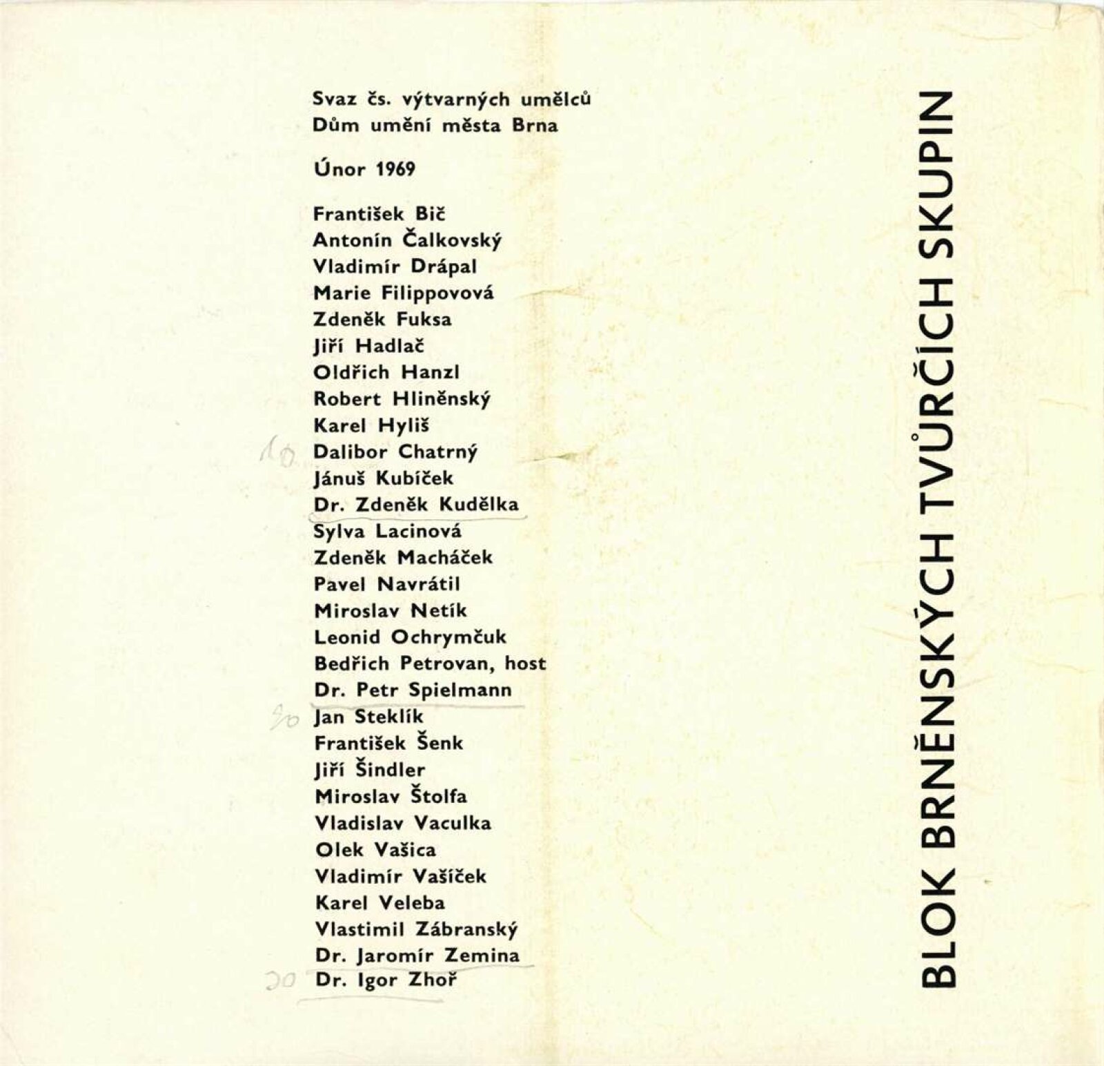 František Bič, Antonín Čalkovský, Vladimír Drápal, Marie Filippovová, Zdeněk Fuksa, Jiří Hadlač, Oldřich Hanzl, Robert Hliněnský, Dalibor Chatrný, Jánuš Kubíček, Sylva Lacinová, Zdeněk Macháček, Pavel Navrátil, Miroslav Netík, Leonid Ochrymčuk, Bedřich Petrovan, František Šenk, Jiří Šindler, Miroslav Štolfa, Vladislav Vaculka, Olek Vašica, Vladimír Vašíček, Karel Veleba