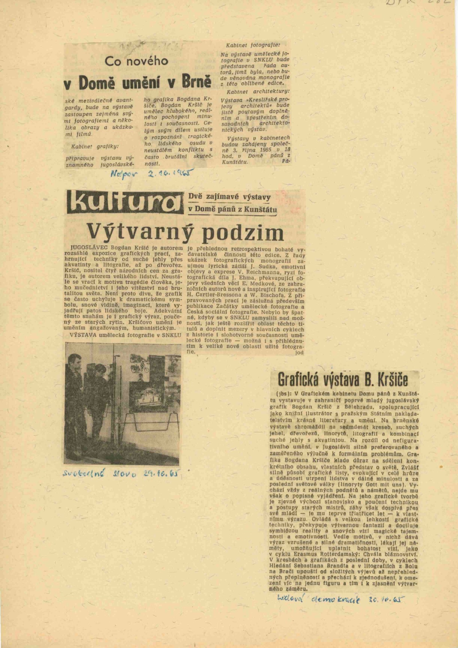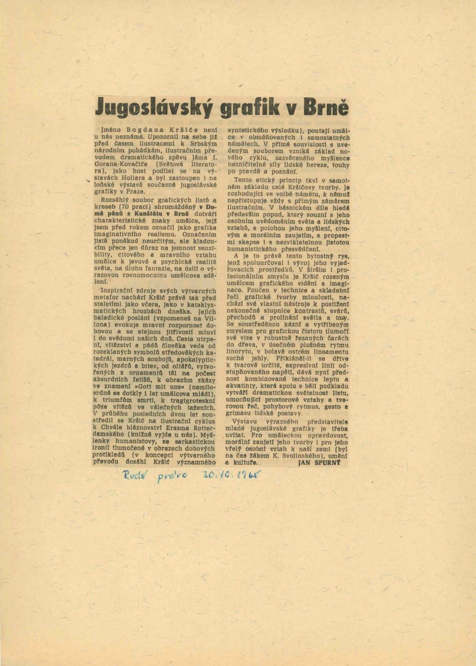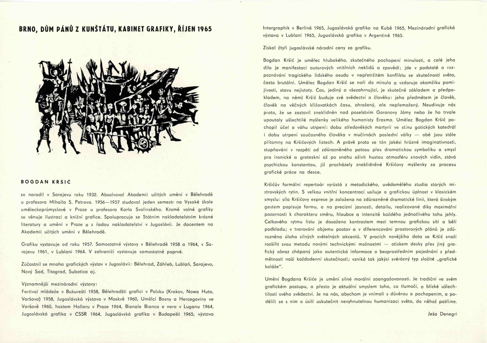 Bogdan Kršić. Grafika: Dům umění města Brna / Dům pánů z Kunštátu, 69. výstava Kabinetu grafiky, 8. 10. – 31. 10. 1965 / Text: Ješa Denegri. – Brno: DUmB, 1965. – skládačka, 6 s., obr., DPK 282. – MZK; MG; MMB