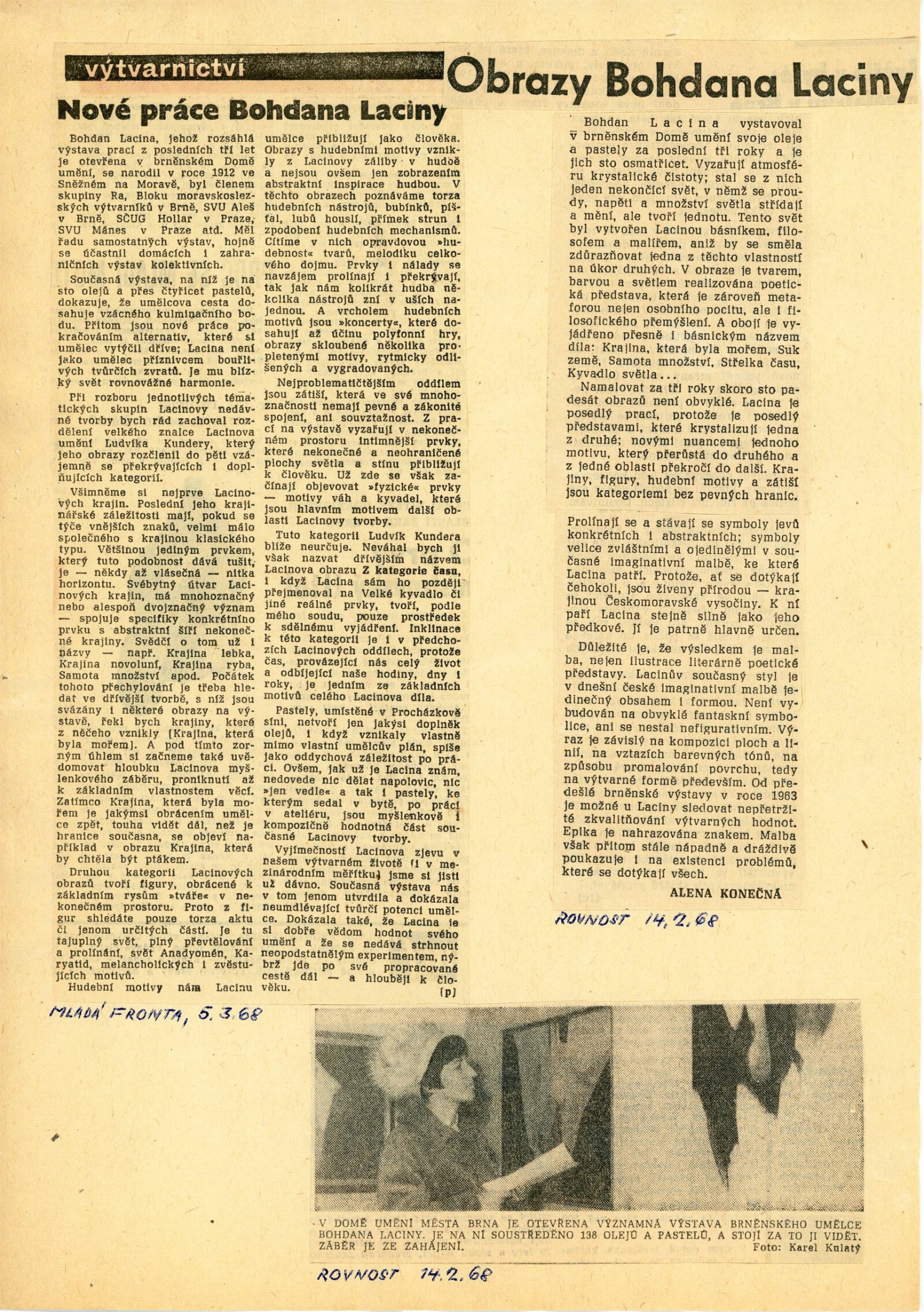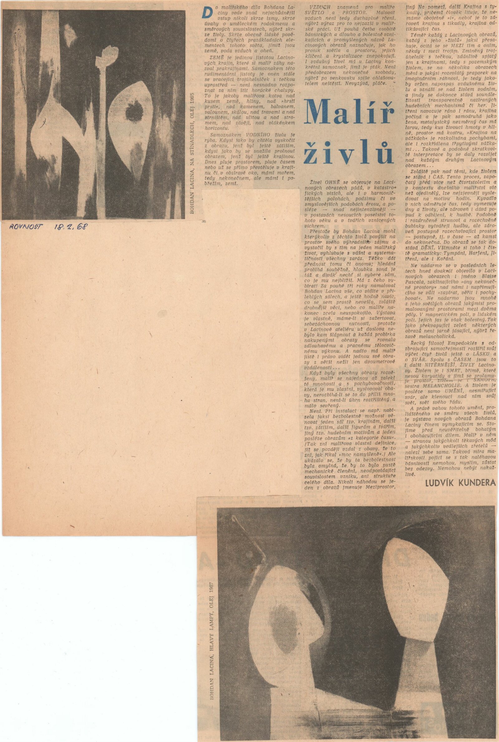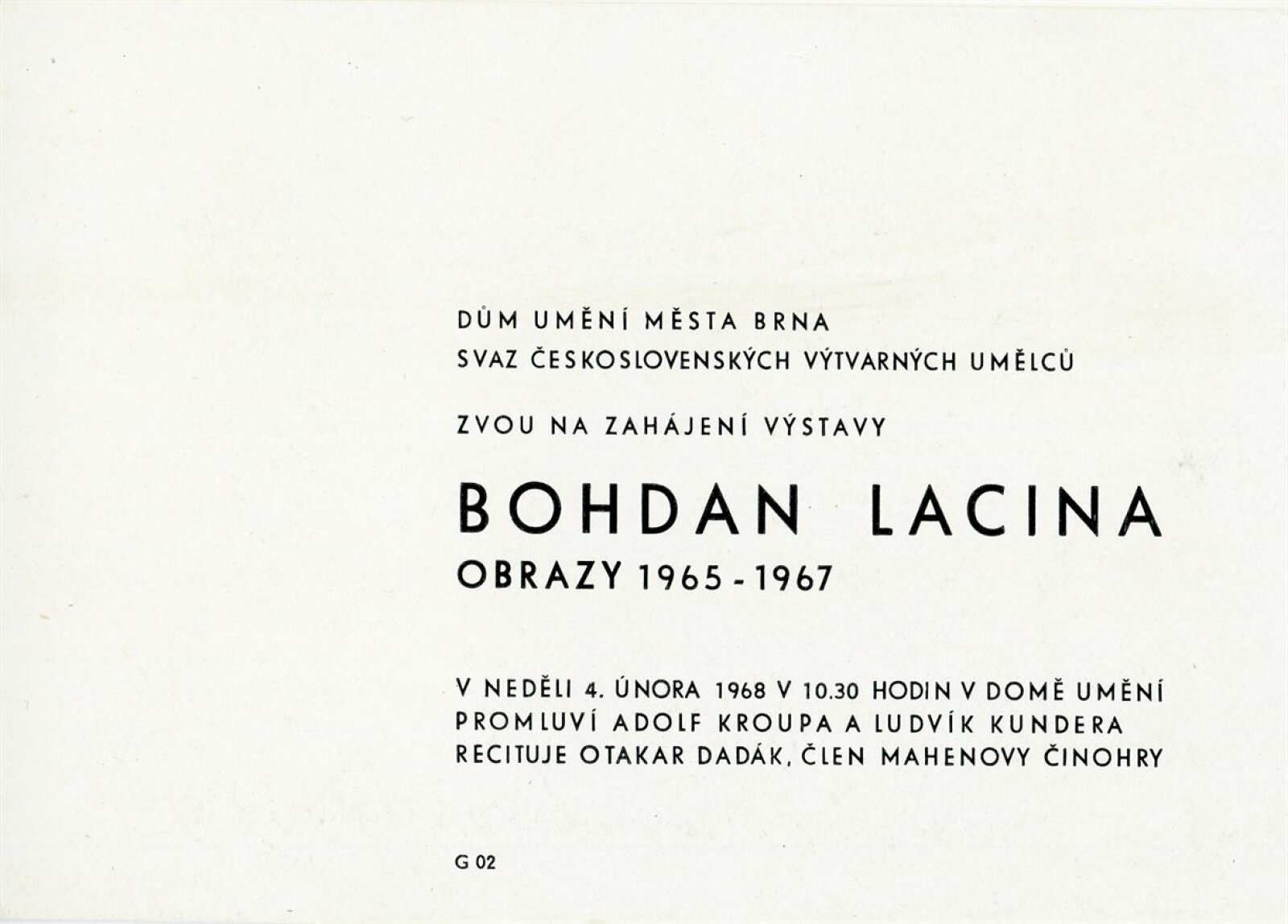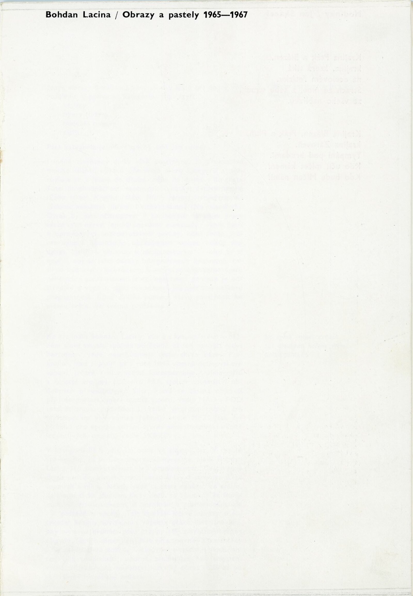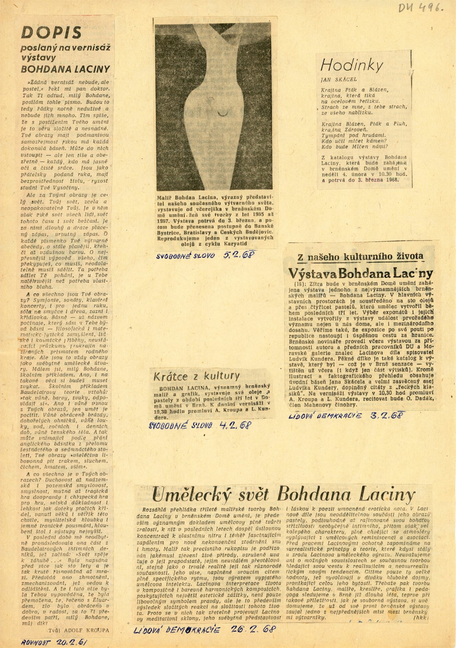 Bohdan Lacina. Obrazy a pastely 1965–1967: Dům umění města Brna, 1. patro, 4. 2. – 3. 3. 1968/ Text: Ludvik Kundera. – Brno: DUmB, 1968. – 32 s., obr, seznam obrazů 4 s., báseň Jan Skácel, DU 496. – MZK; MG; MMB