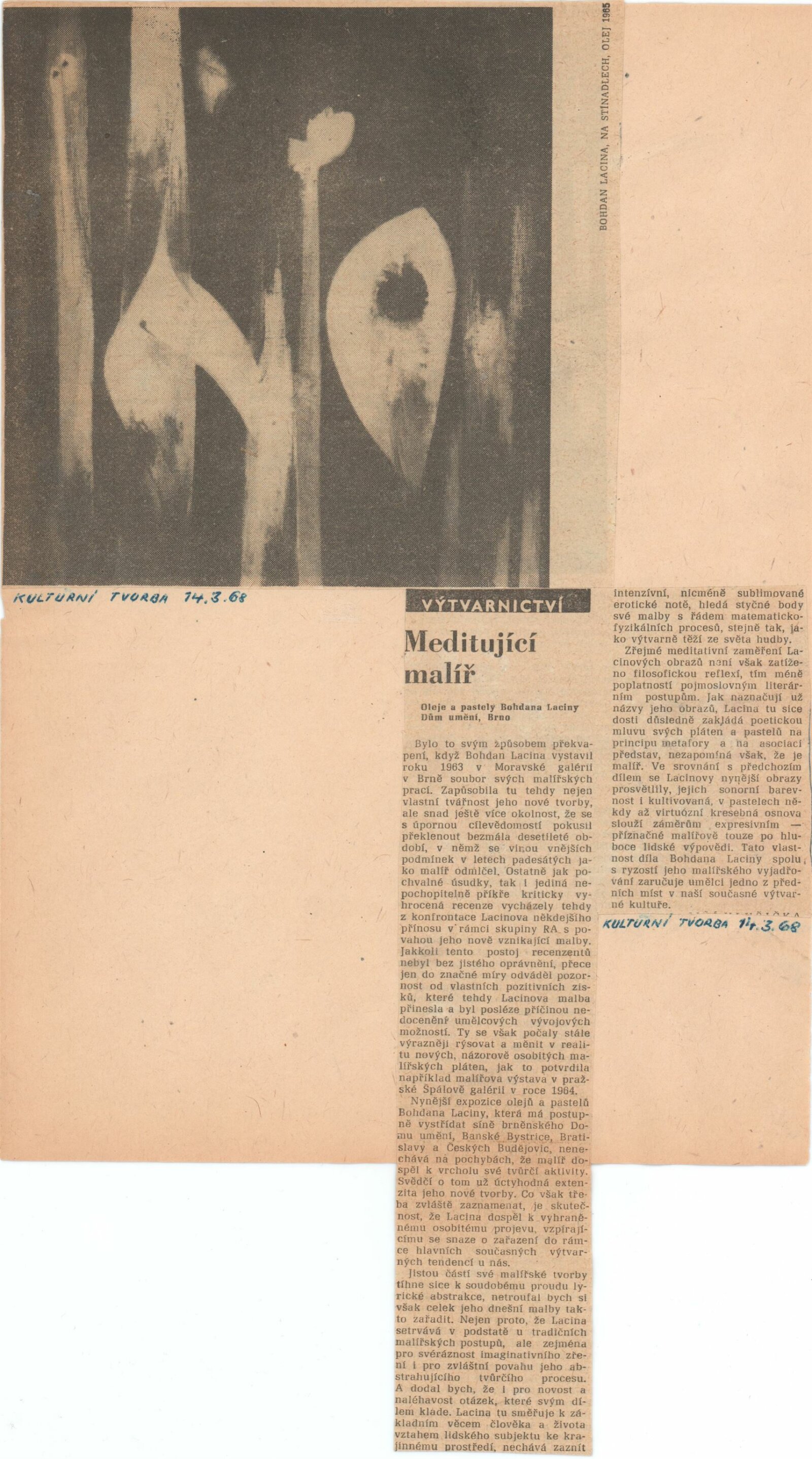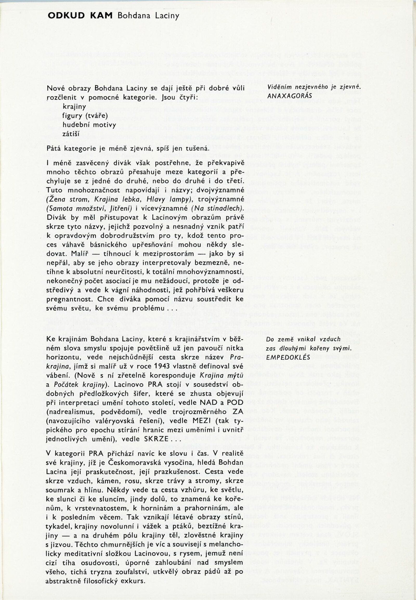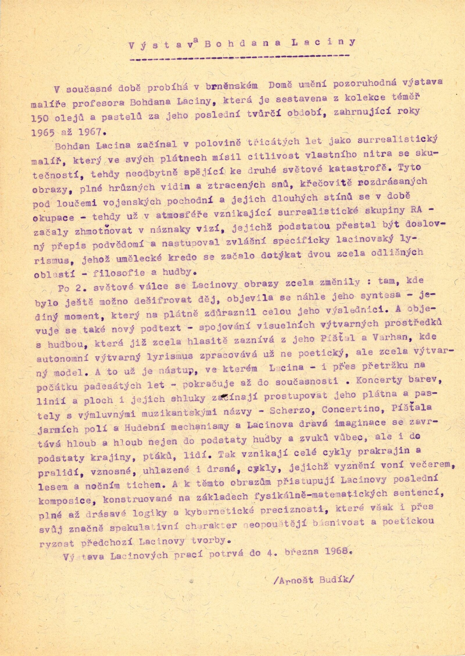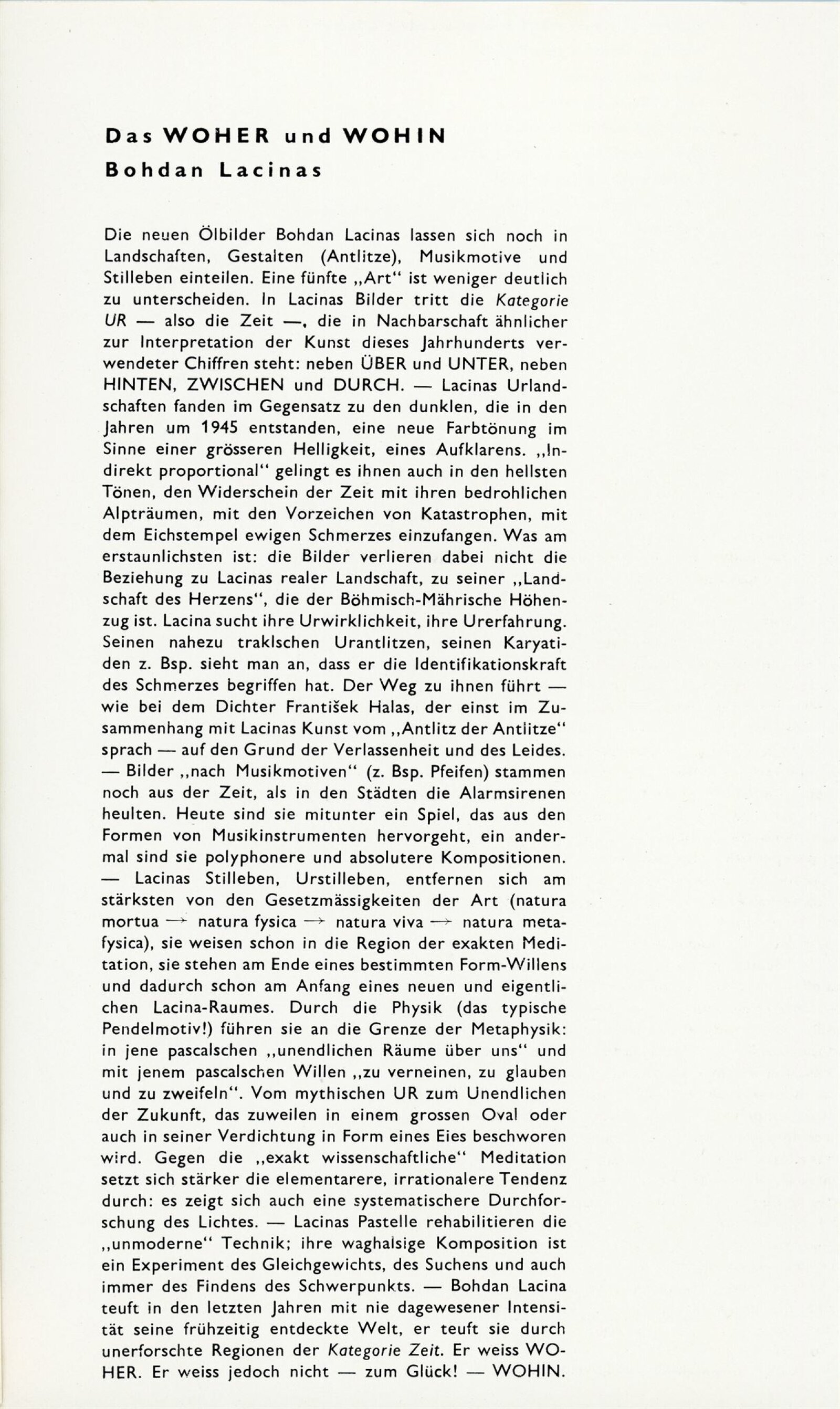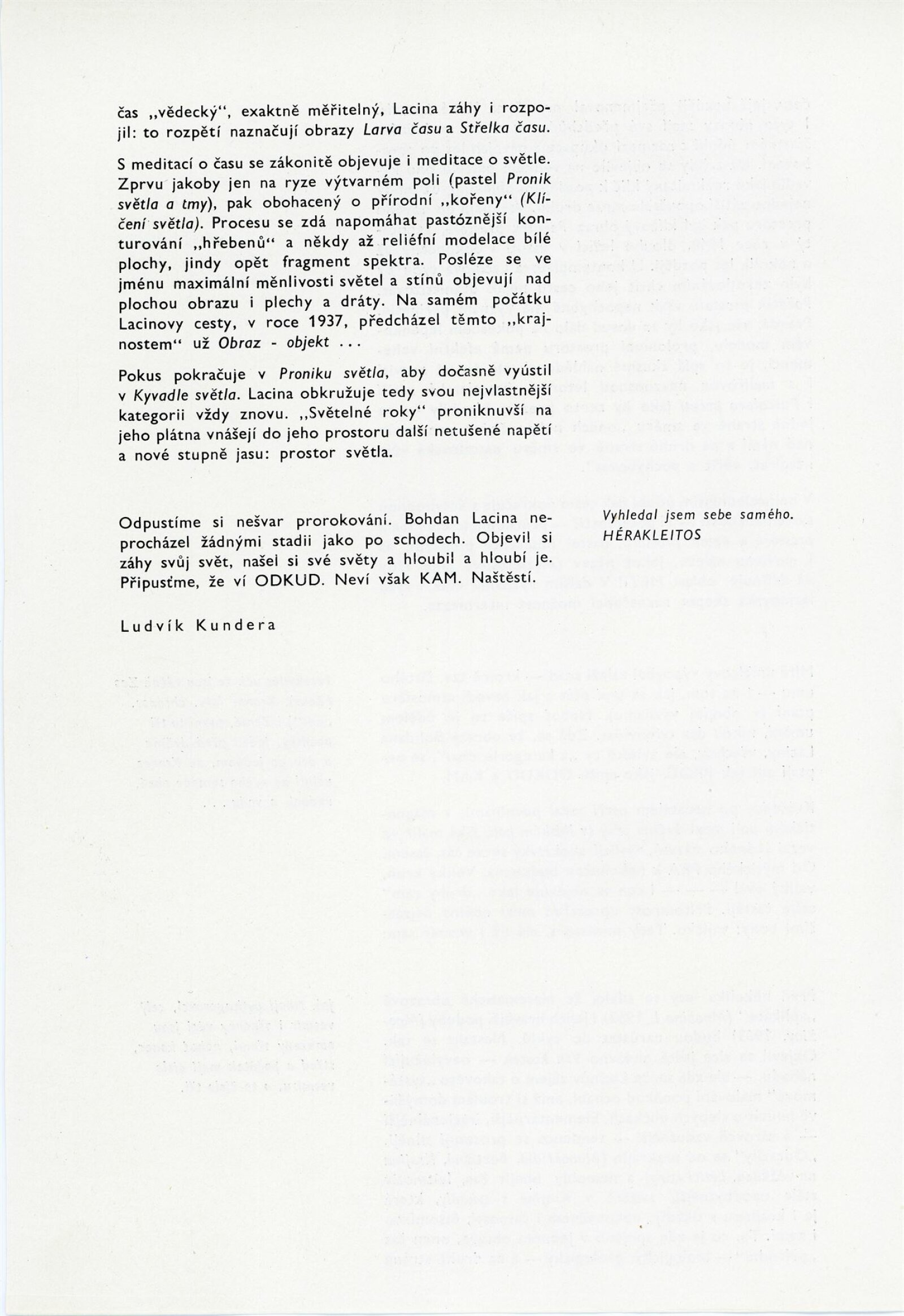 Bohdan Lacina. Obrazy a pastely 1965–1967: Dům umění města Brna, 1. patro, 4. 2. – 3. 3. 1968/ Text: Ludvik Kundera. – Brno: DUmB, 1968. – 32 s., obr, seznam obrazů 4 s., báseň Jan Skácel, DU 496. – MZK; MG; MMB
