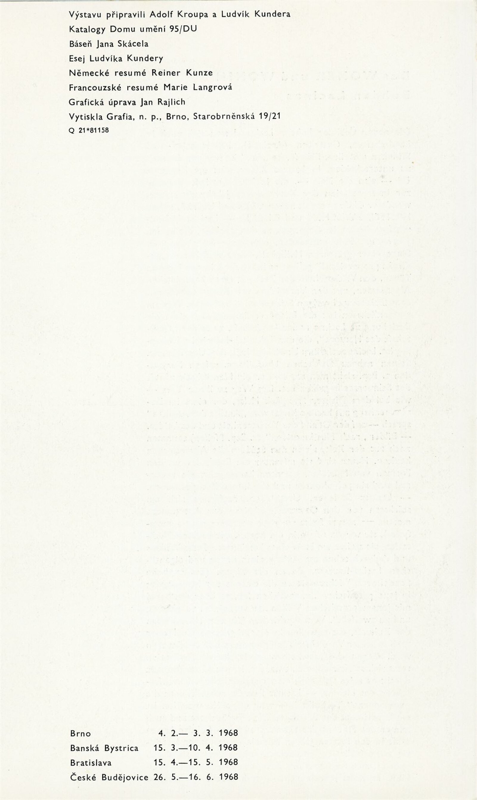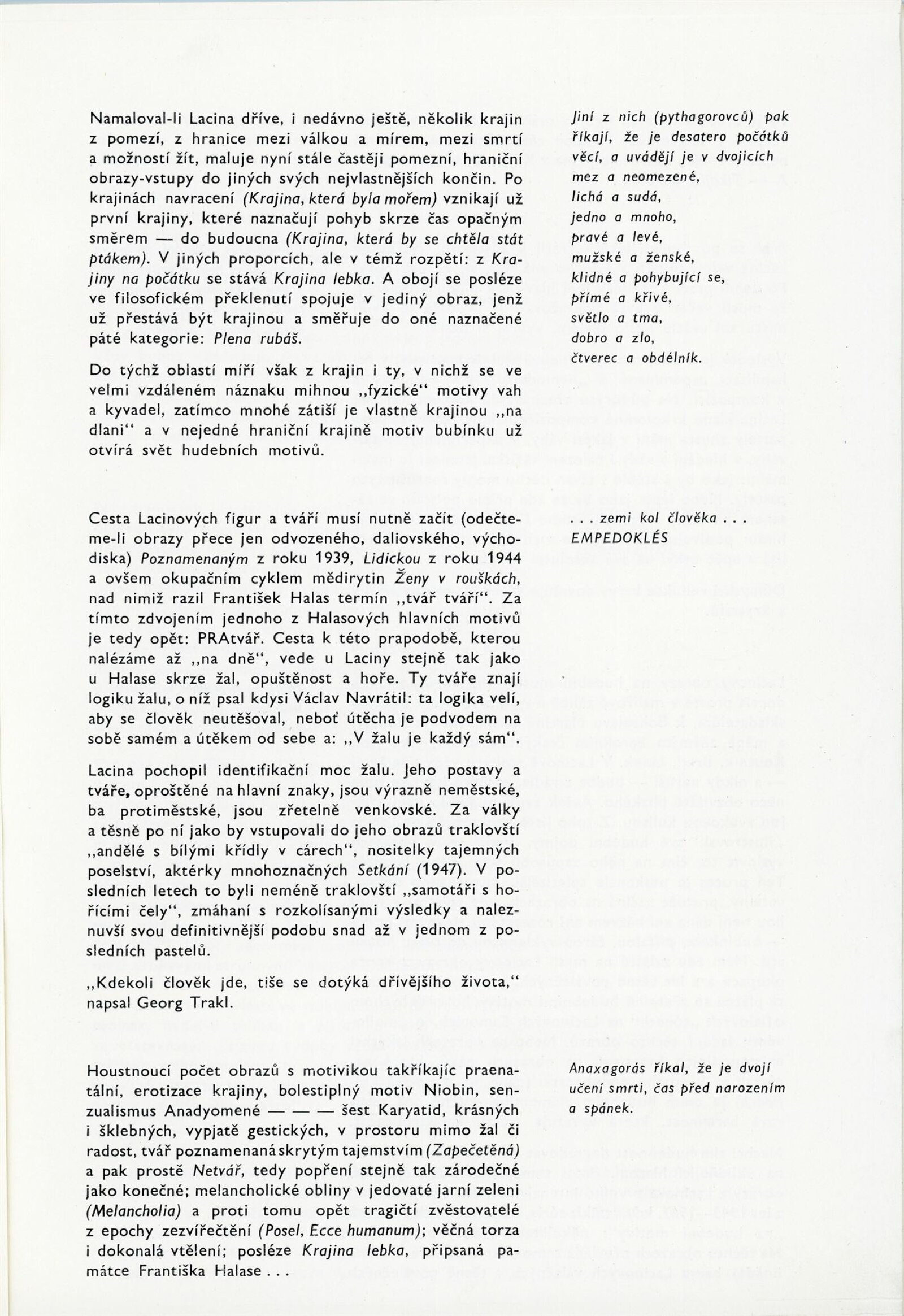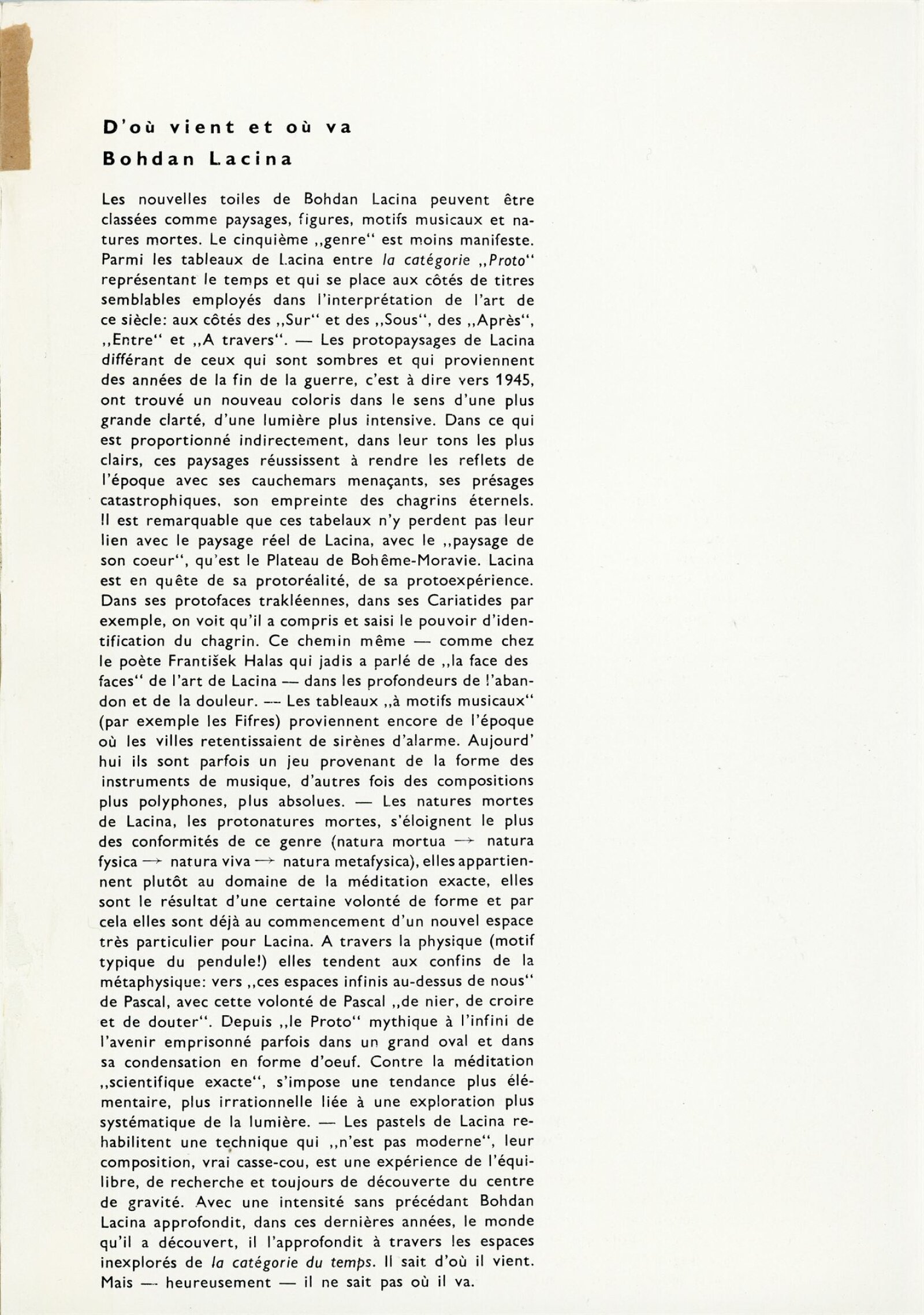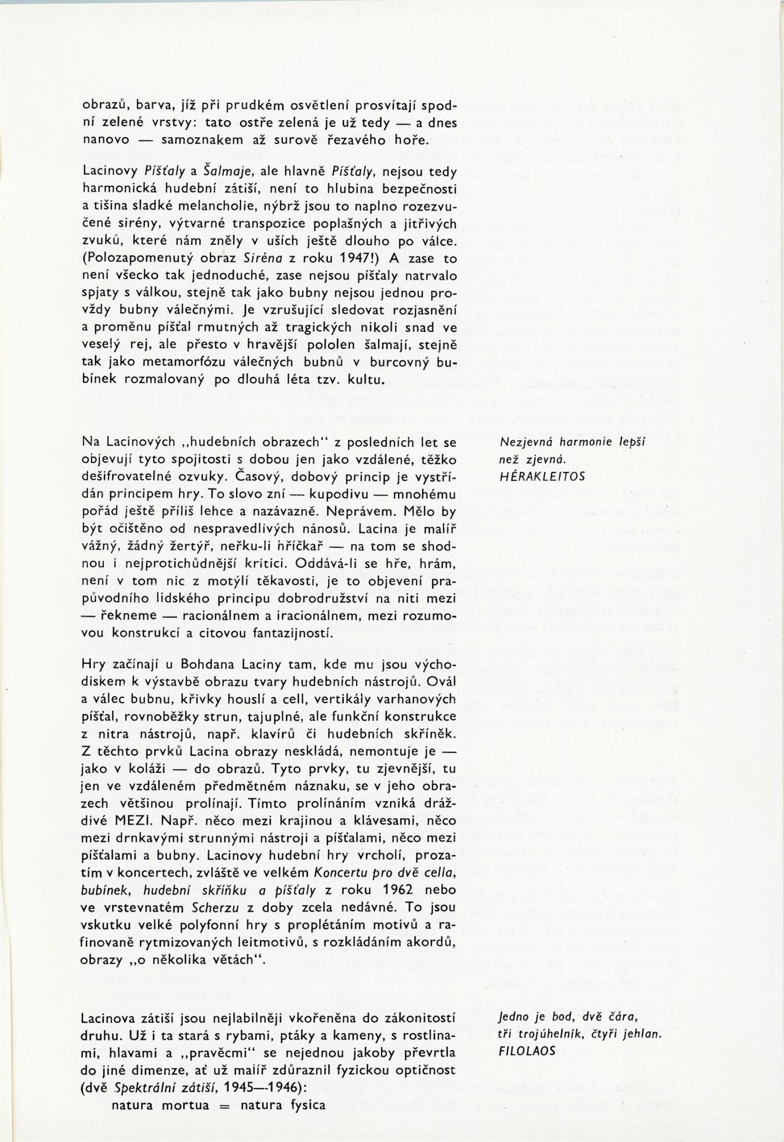 Bohdan Lacina. Obrazy a pastely 1965–1967: Dům umění města Brna, 1. patro, 4. 2. – 3. 3. 1968/ Text: Ludvik Kundera. – Brno: DUmB, 1968. – 32 s., obr, seznam obrazů 4 s., báseň Jan Skácel, DU 496. – MZK; MG; MMB