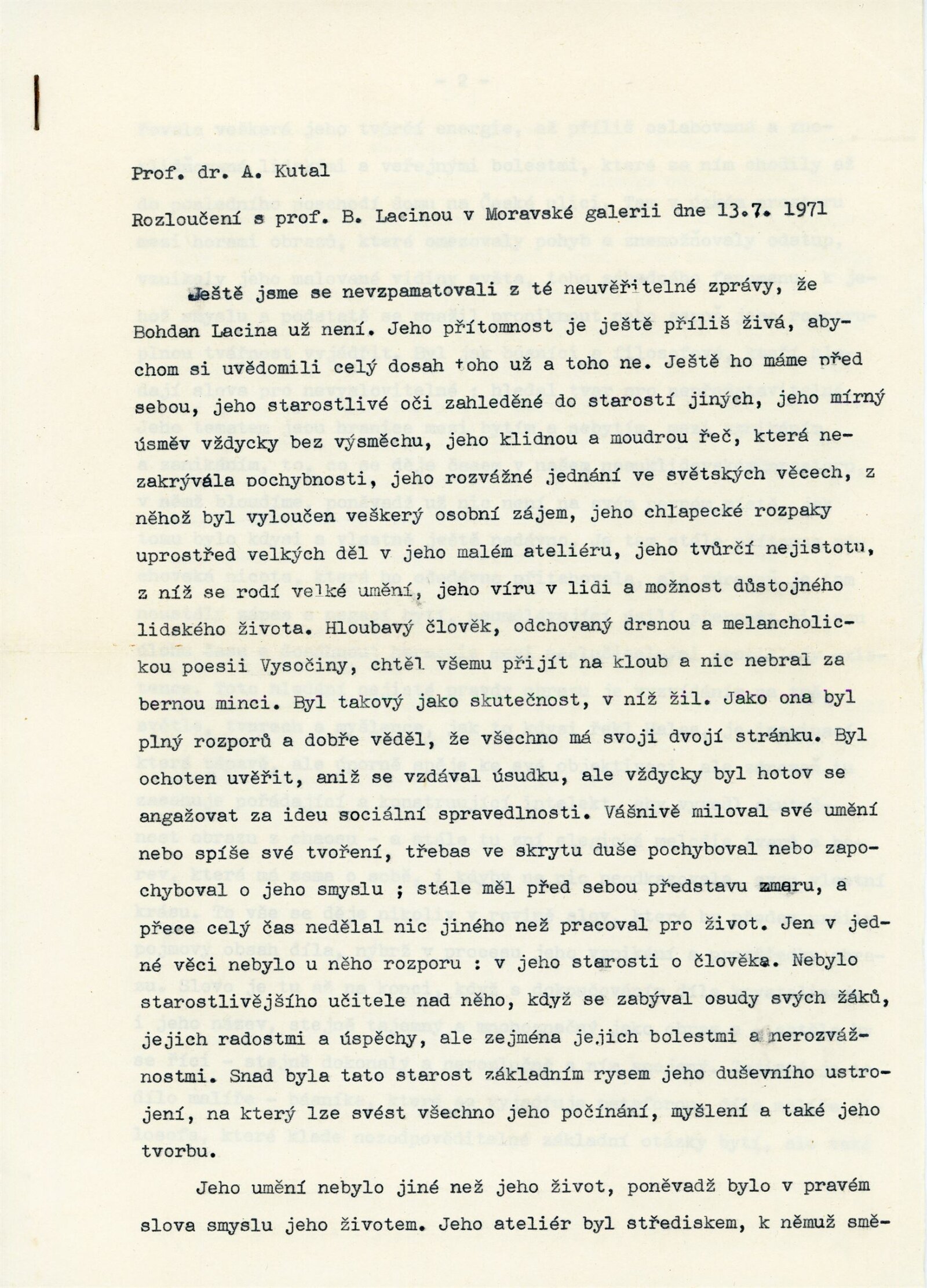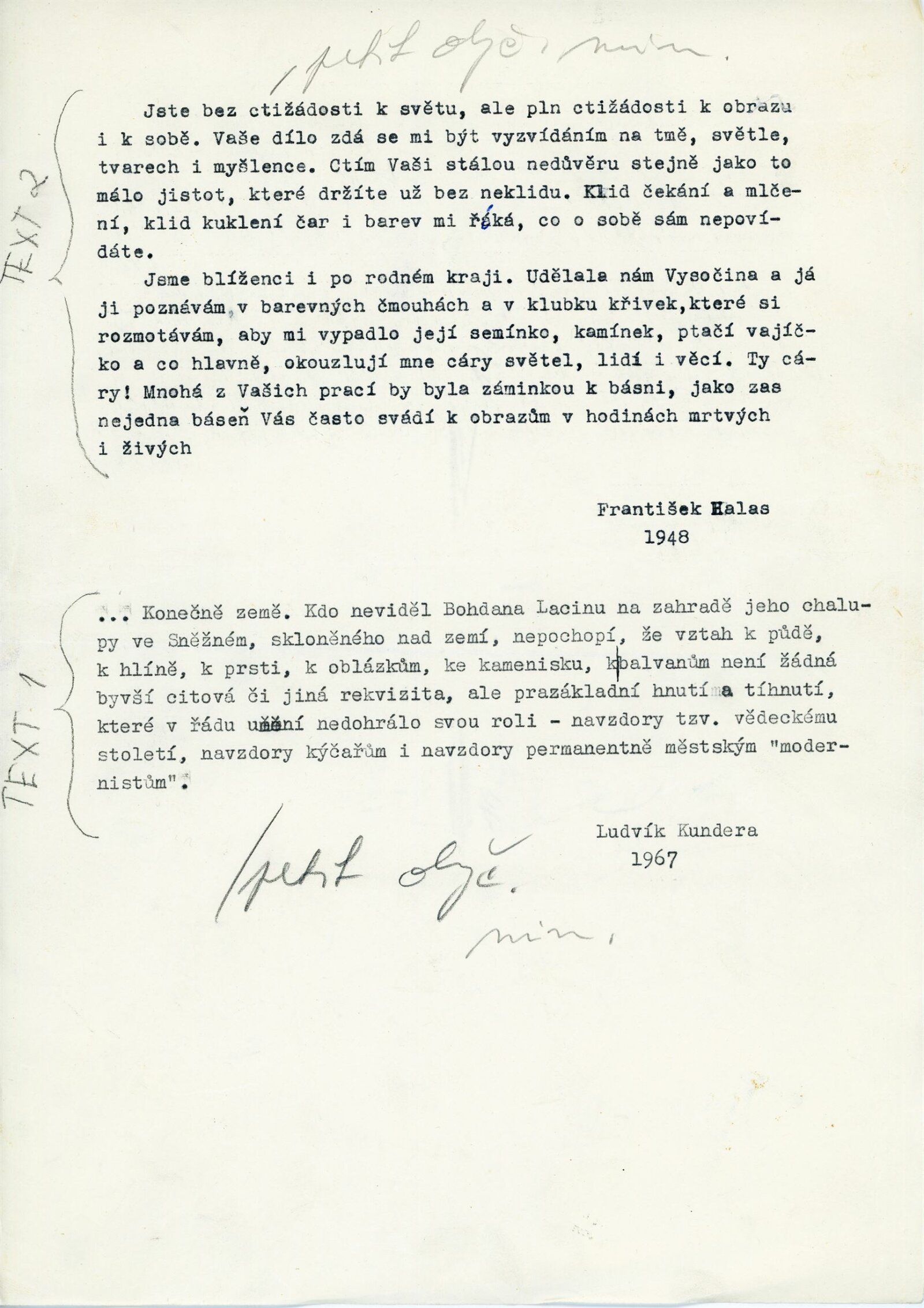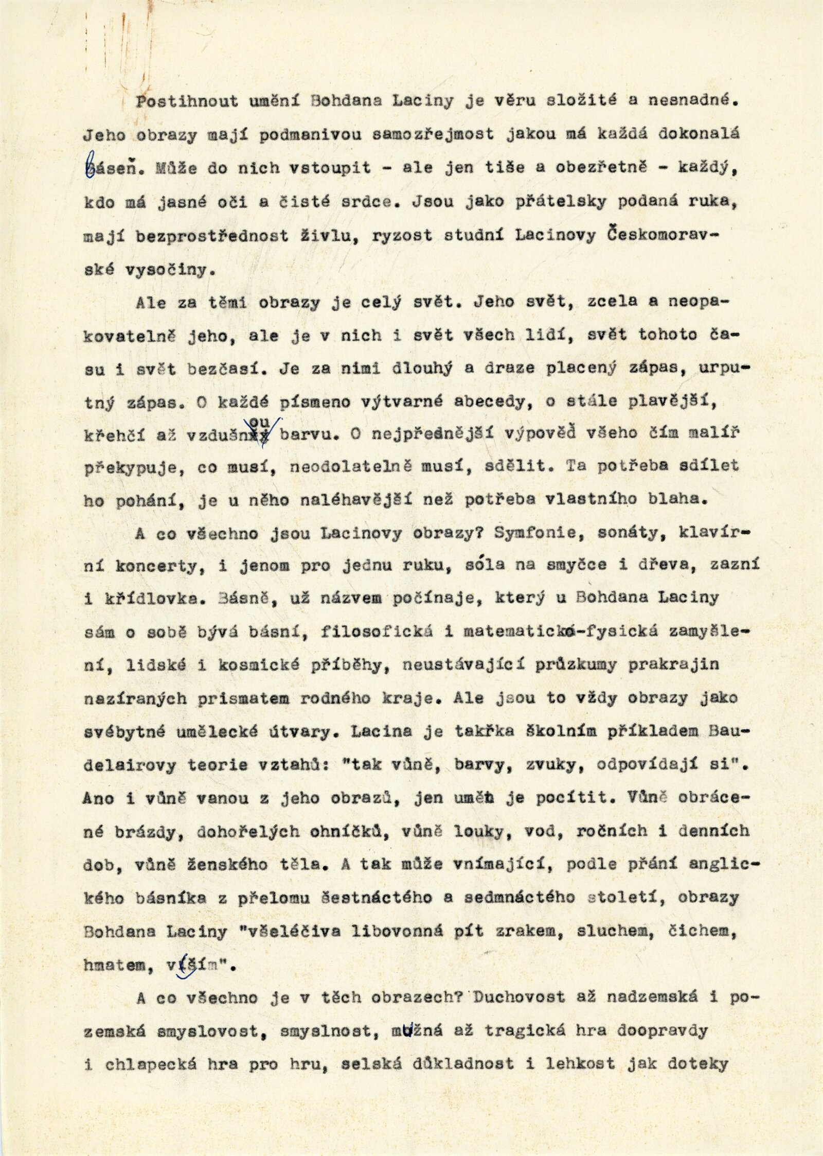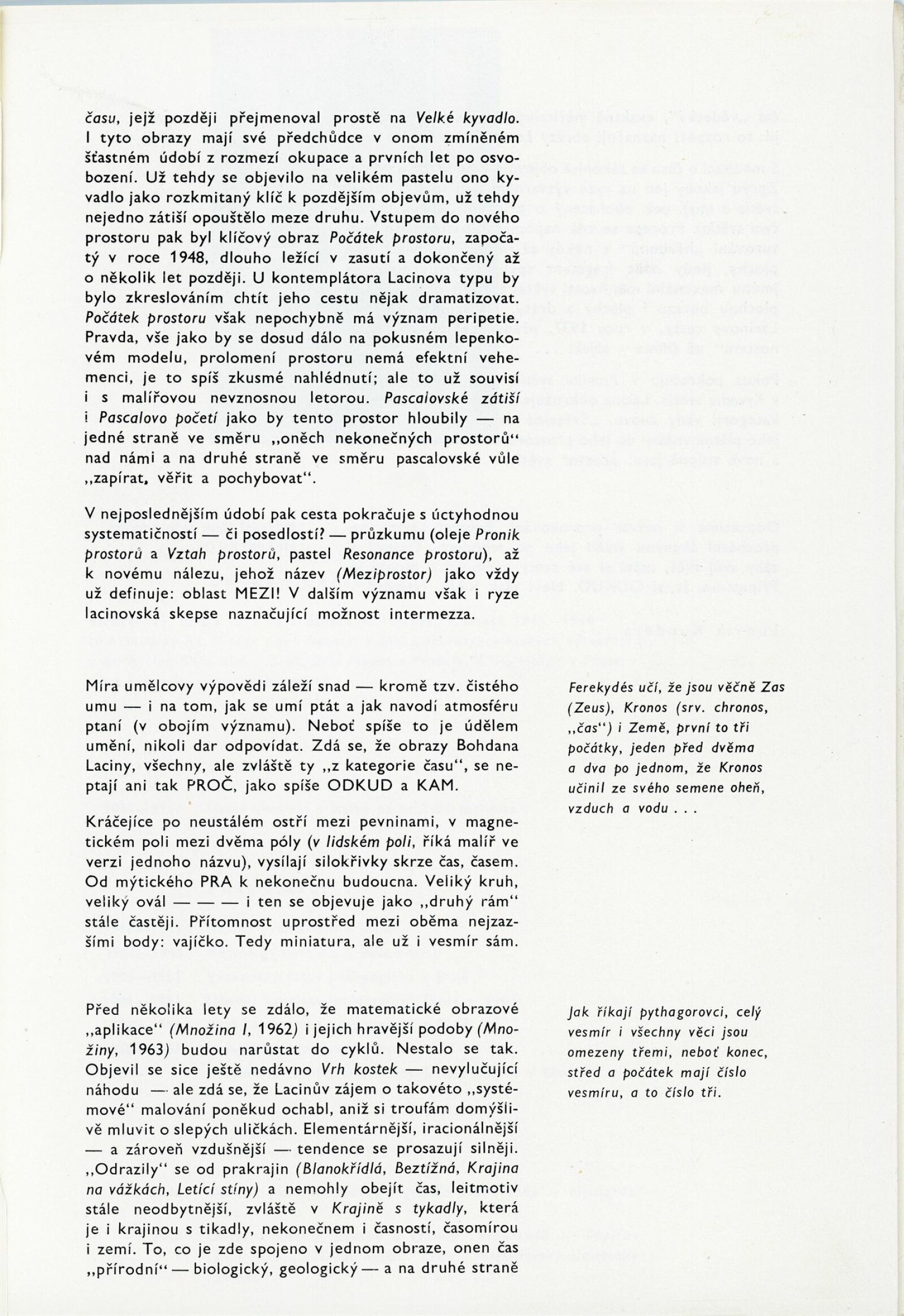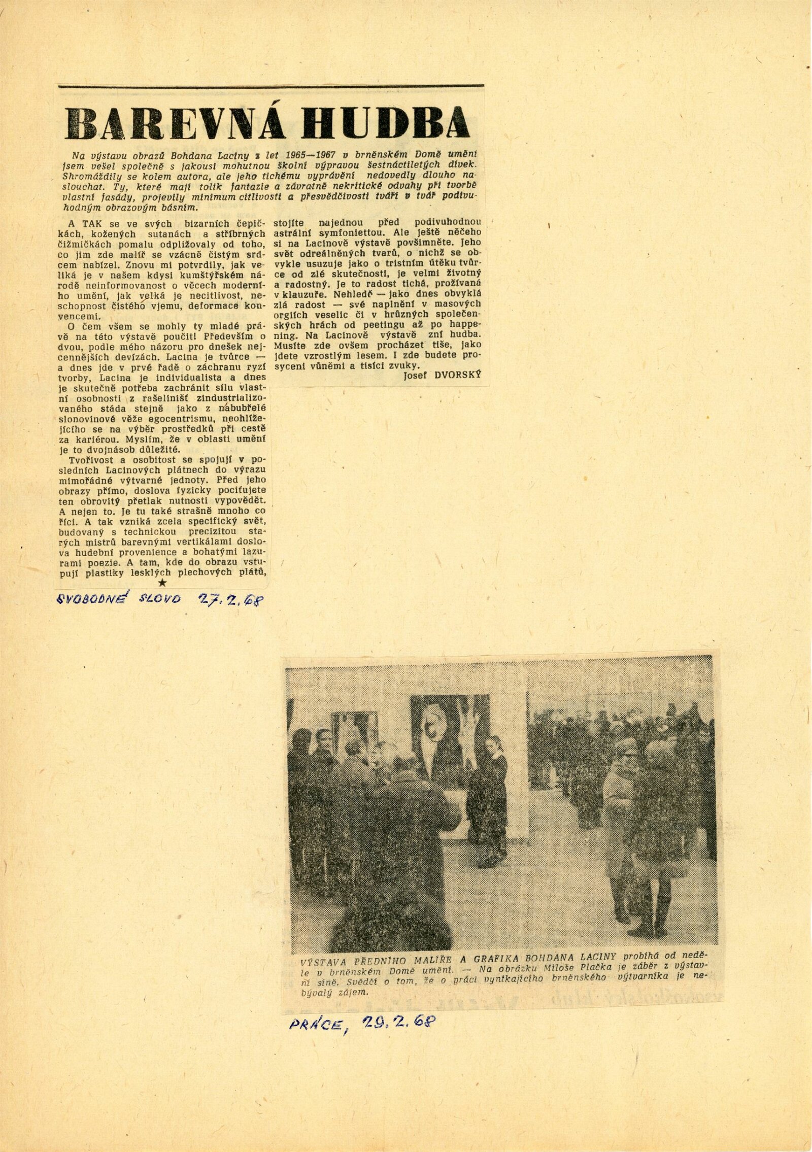 Bohdan Lacina. Obrazy a pastely 1965–1967: Dům umění města Brna, 1. patro, 4. 2. – 3. 3. 1968/ Text: Ludvik Kundera. – Brno: DUmB, 1968. – 32 s., obr, seznam obrazů 4 s., báseň Jan Skácel, DU 496. – MZK; MG; MMB