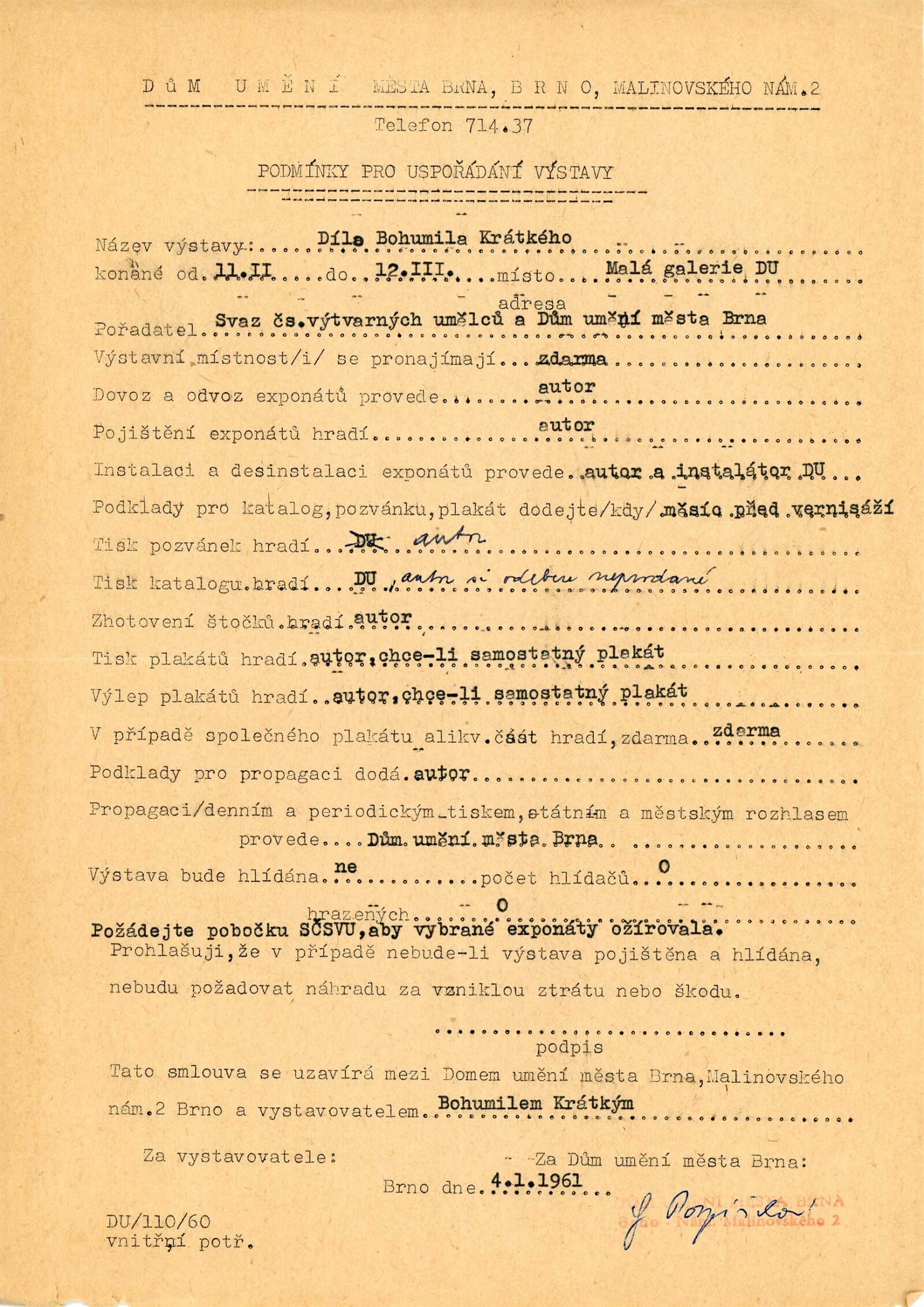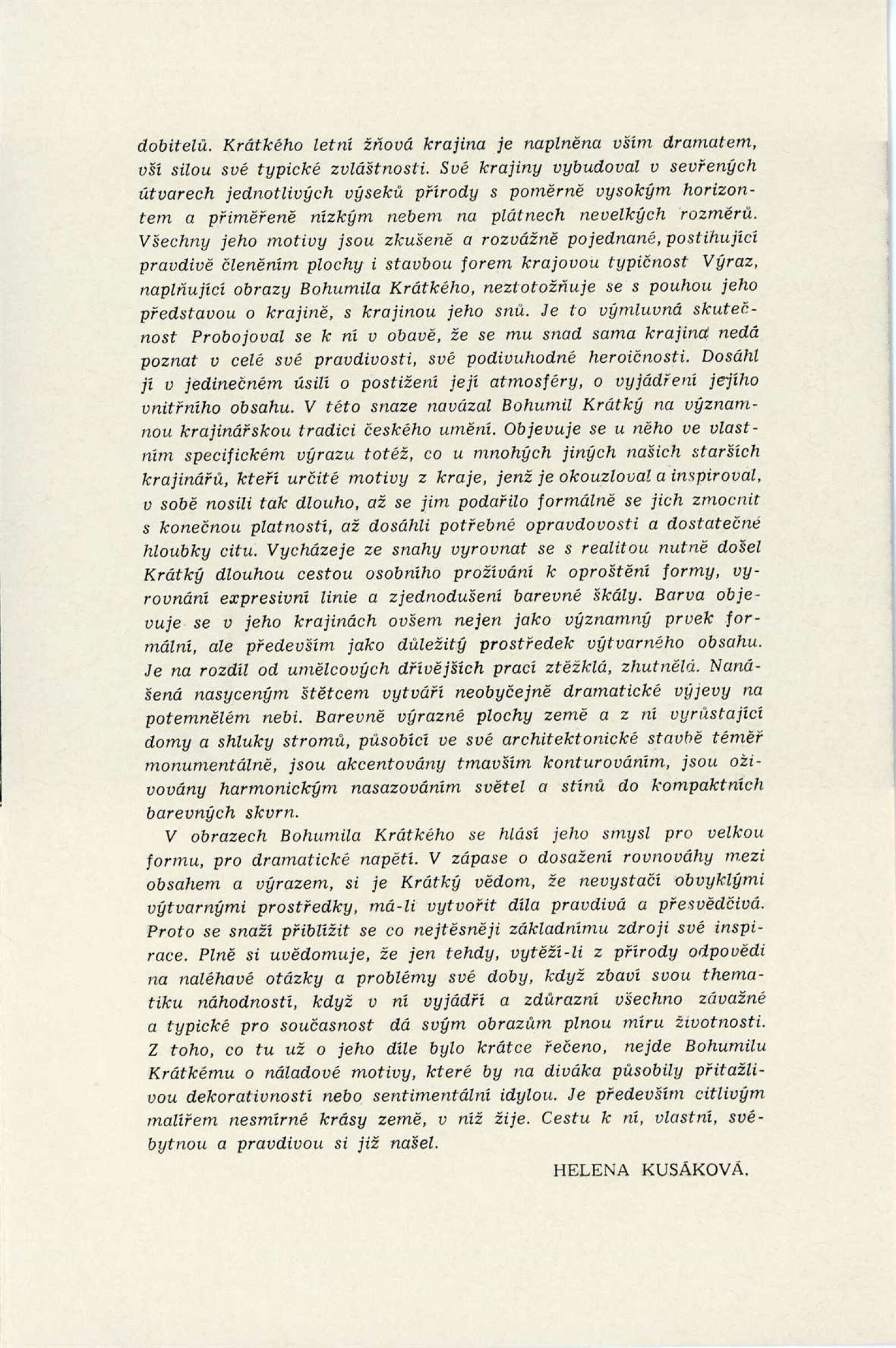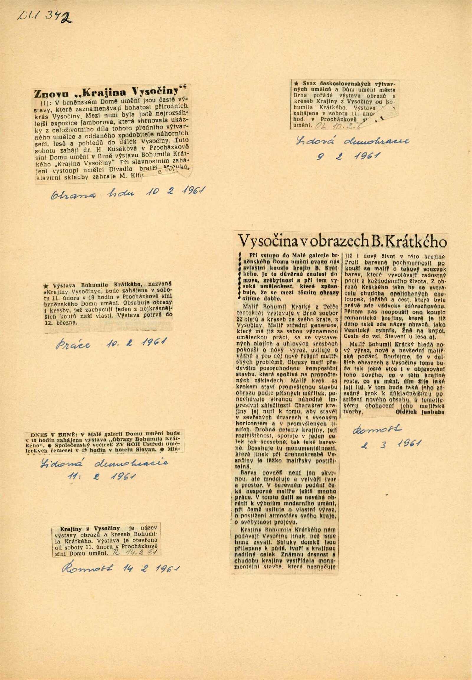Bohumil Krátký. Krajiny Vysočiny. Obrazy a kresby: Dům umění města Brna, Malá galerie, 11. 2. – 18. 3. 1961 / Text: Helena Kusáková. – Brno: DUmB, 1961. – skládačka, 6 s., obr., DU 392. – MG; MMB