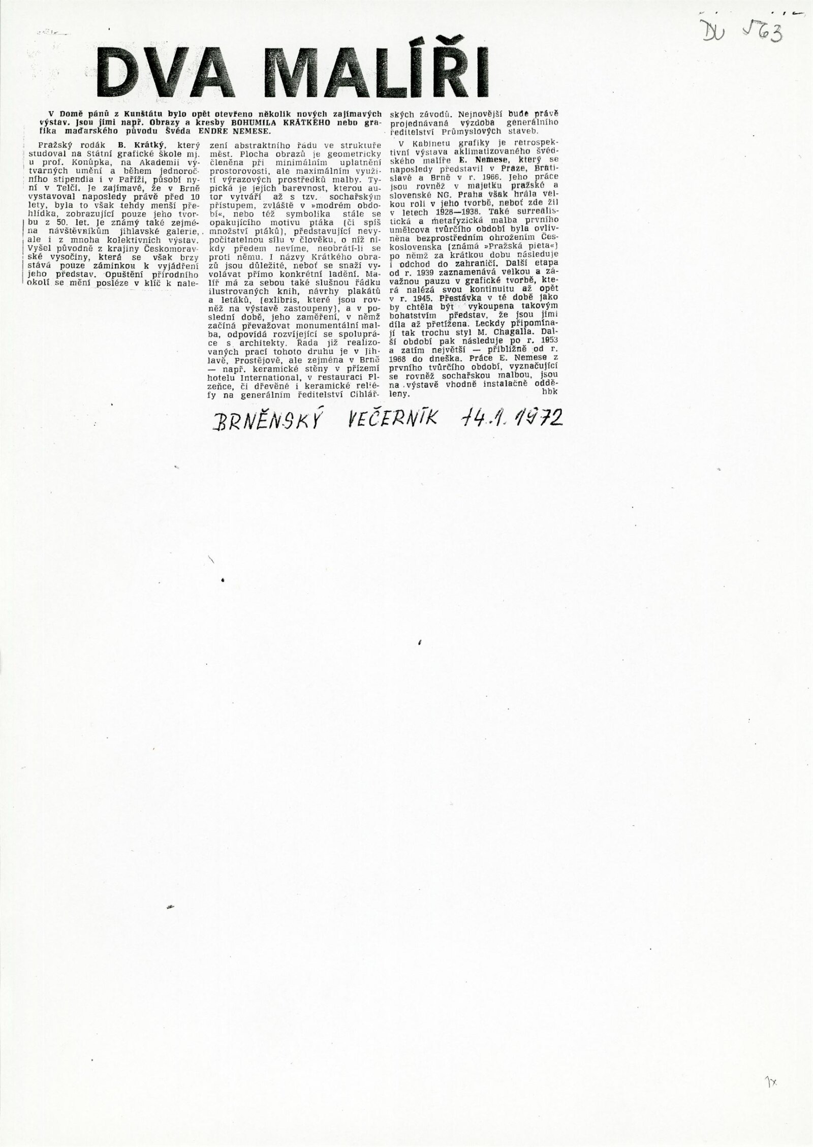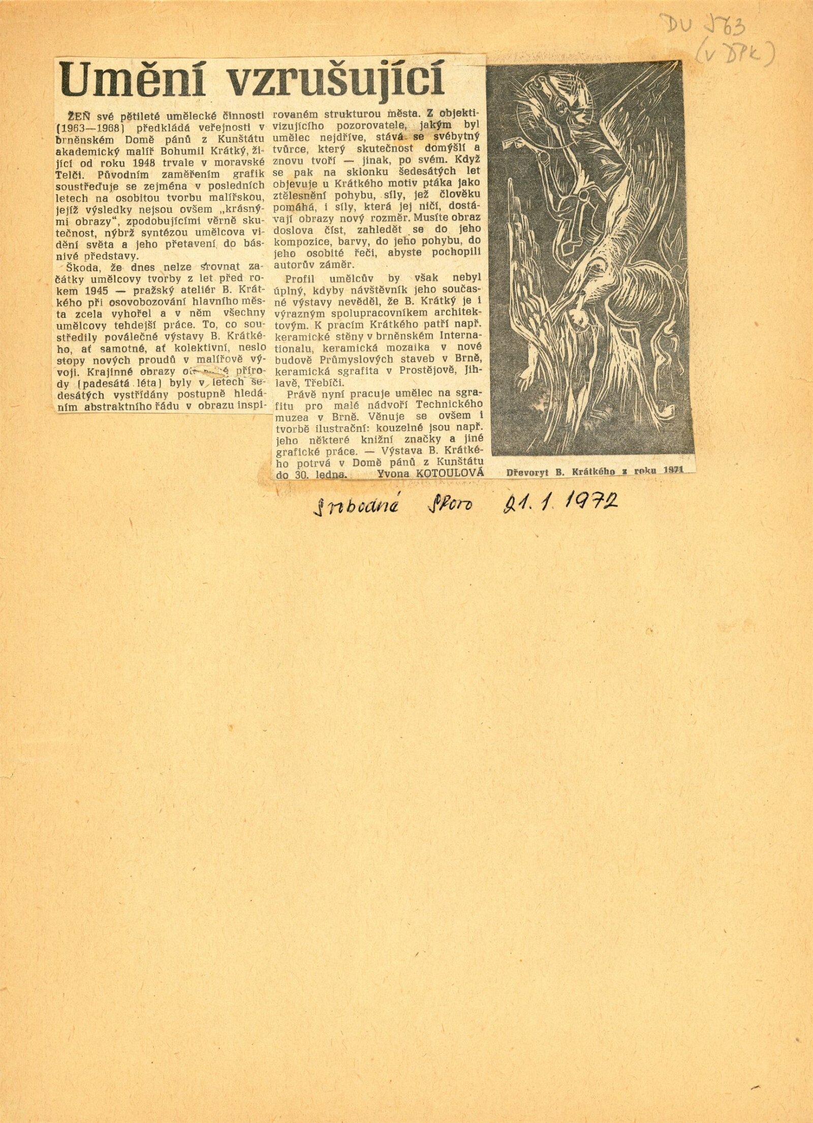 Bohumil Krátký. Obrazy a kresby: Dům umění města Brna, 42. výstava v Galerii Jaroslava Krále a Dům umění města Brna / Dům pánů z Kunštátu, 7. 1. – 30. 1. 1972 / Text: Zdeněk Čubrda. – Brno: ČFVU, 1972. – 12 s., obr., portrét, životní data, výstavy, DU 563. – MZK; MG; MMB