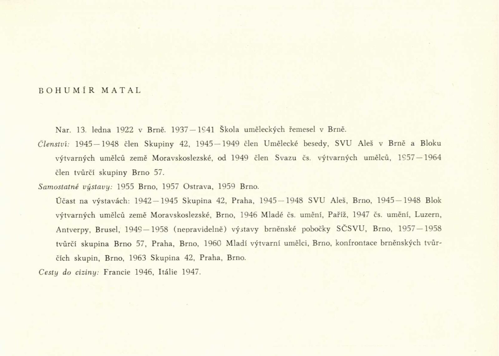 Bohumír Matal: Dům umění města Brna, 1. patro, 20. 11. 1966 – 1. 1. 1967 / Katalog souborné výstavy. Text: Zdeněk Kudělka. – Hodonín: Dům umění, 1966. – 24 s., obr., seznam vystavených prací 4 s., portrét, životopis, DU 471. – MZK; MG; MMB